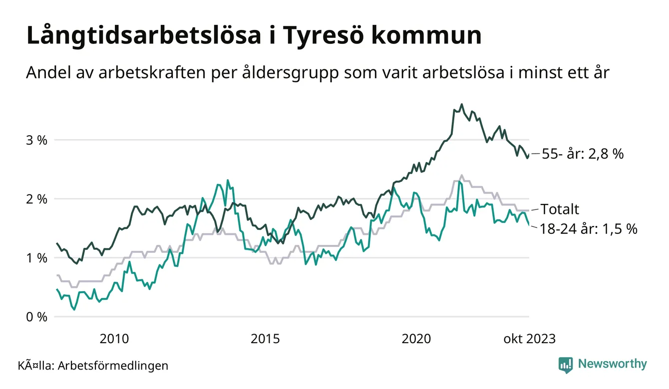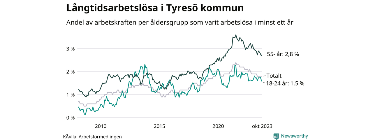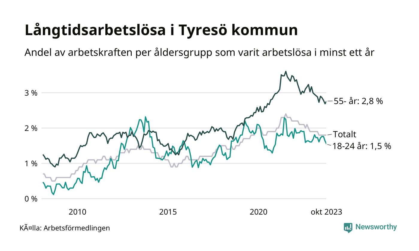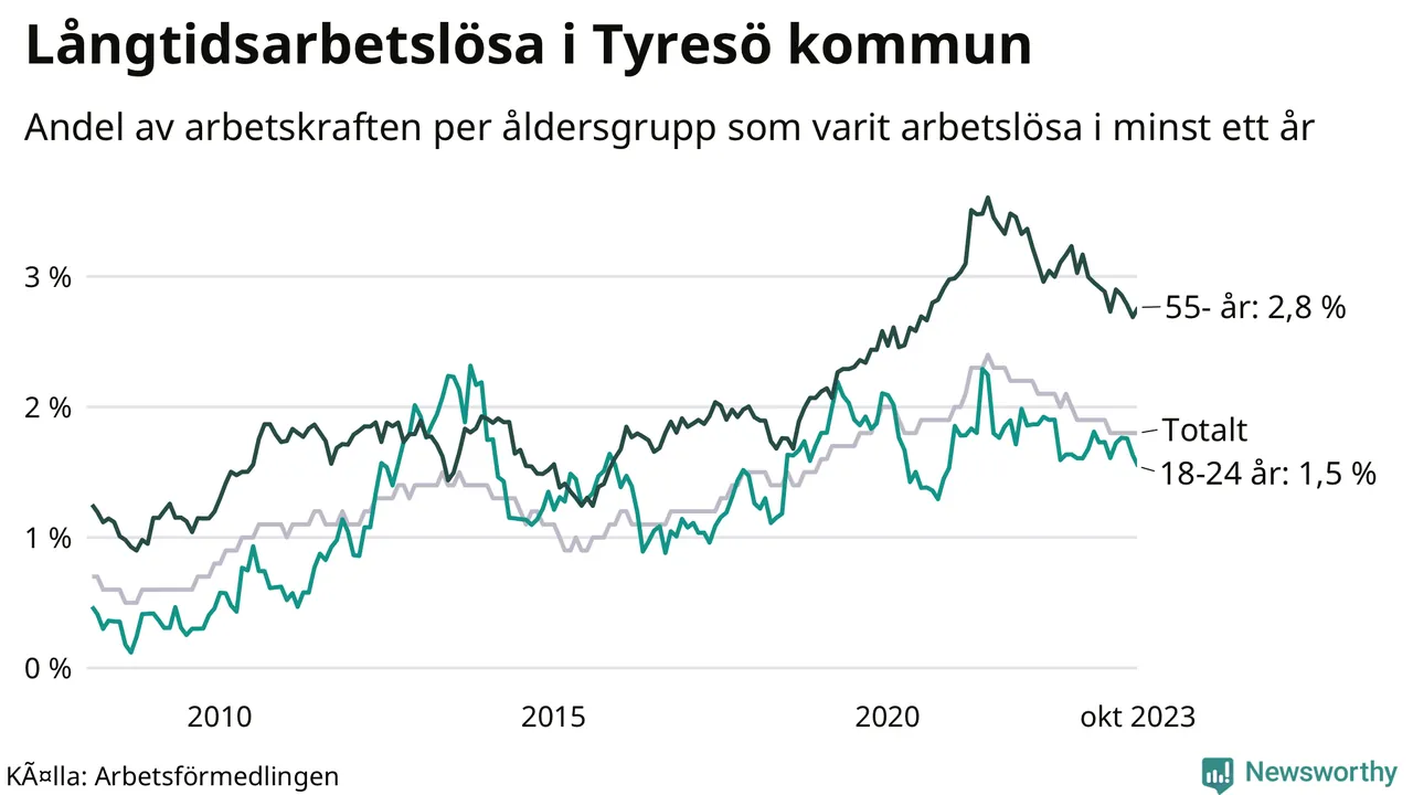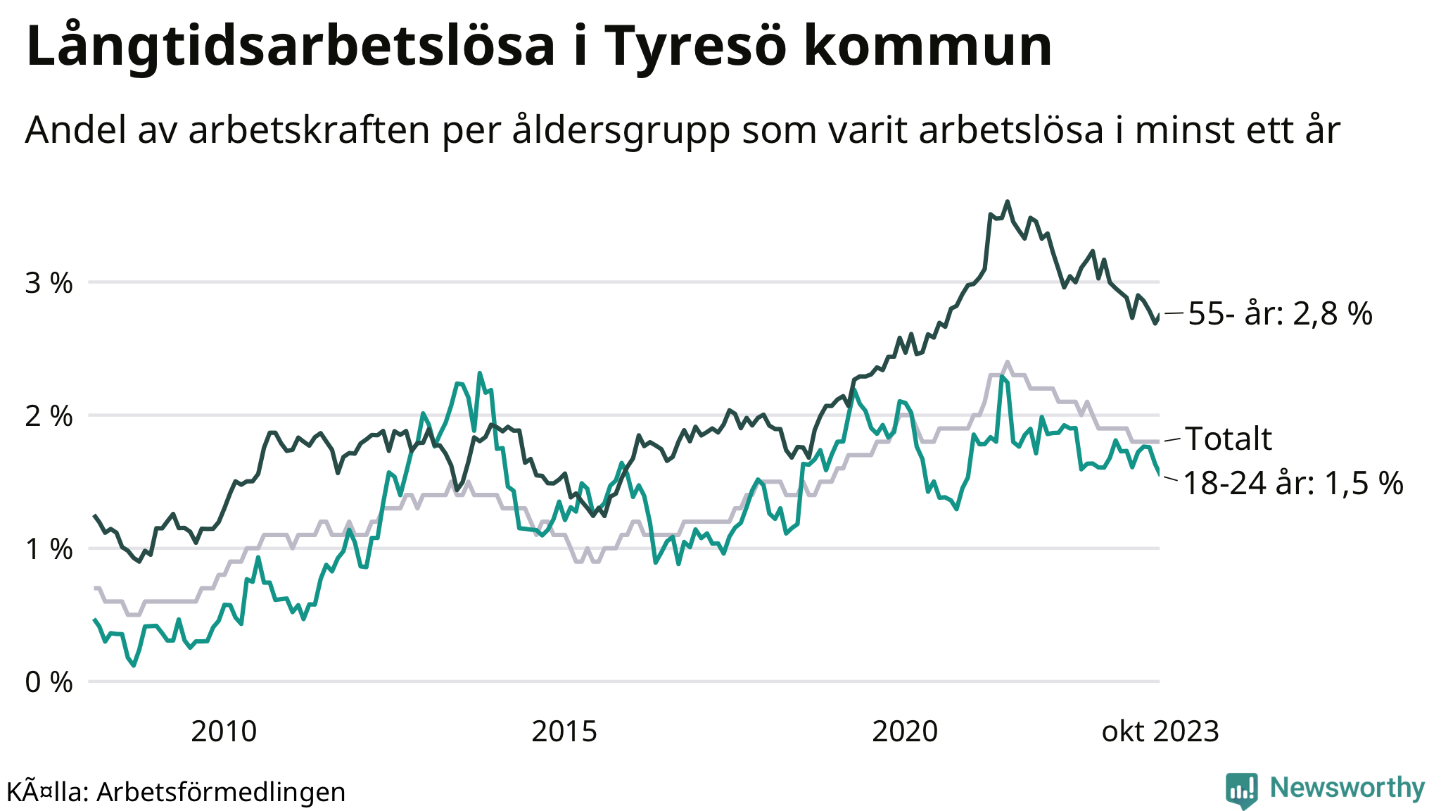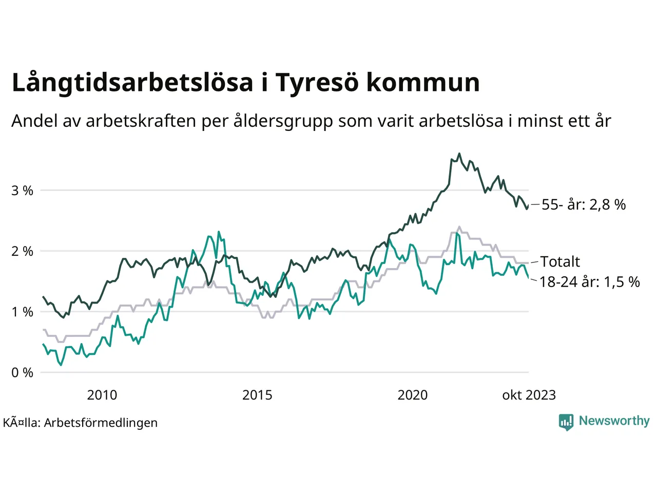 Av de 467 personerna som varit arbetslösa i mer än ett år i Tyresö kommun är 145 personer mellan 55 och 651 år och 36 är mellan 18 och 24 år. För den äldre gruppen är andelen arbetslösa 2,8 procent medan den i den yngre gruppen är 1,5 procent. Även i riket som helhet är långtidsarbetslösheten högre i gruppen äldre.