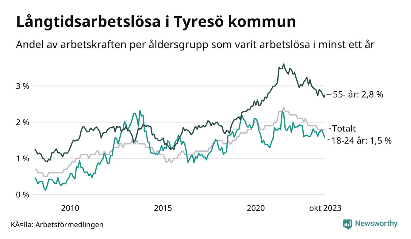 Graf: Andel arbetslösa uppdelat i åldersgrupper i Tyresö