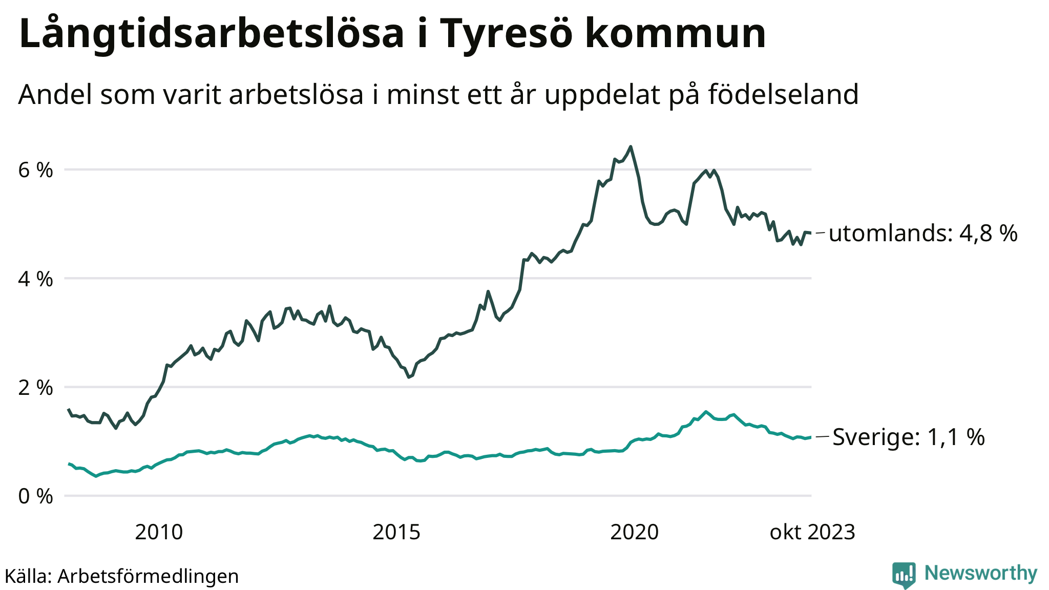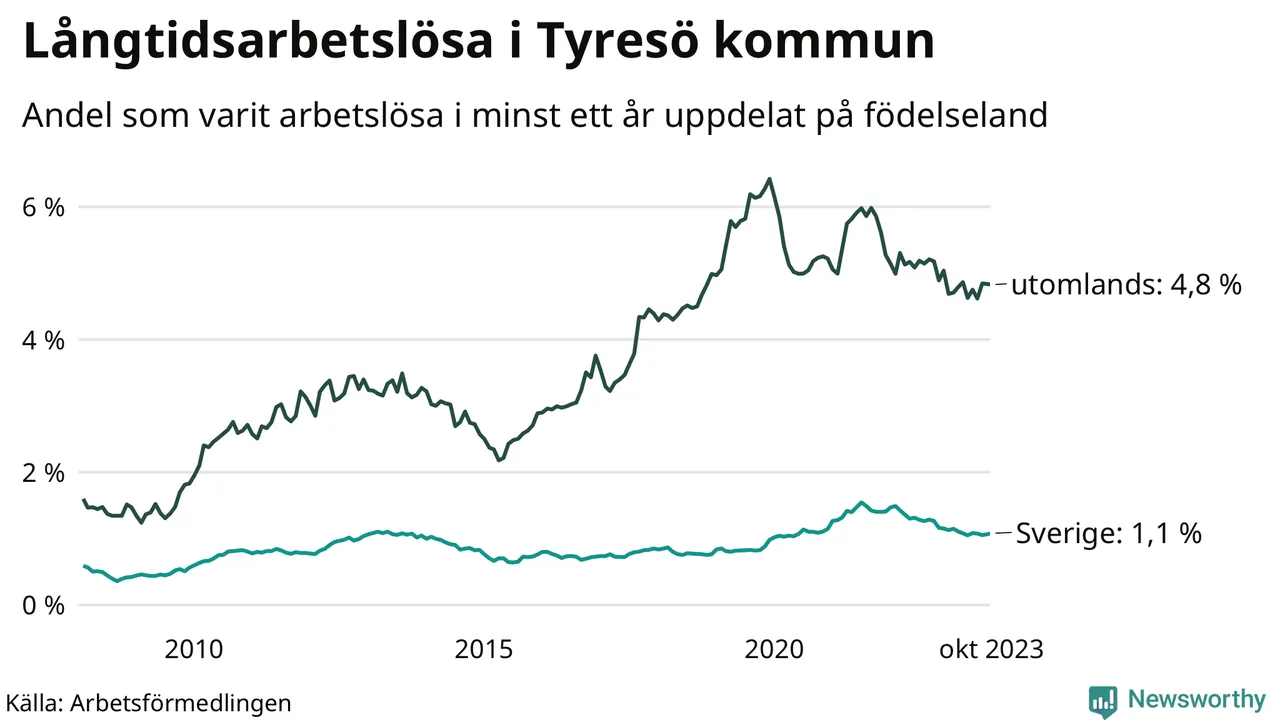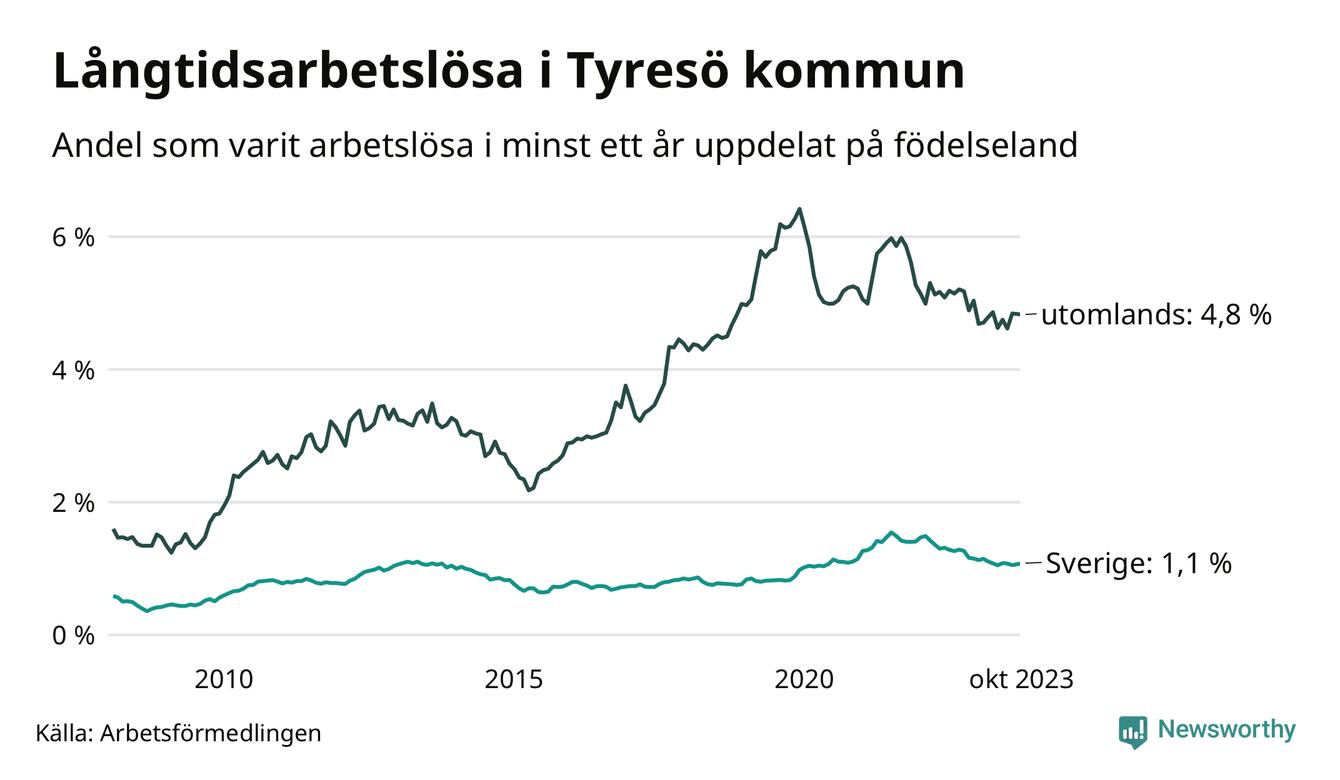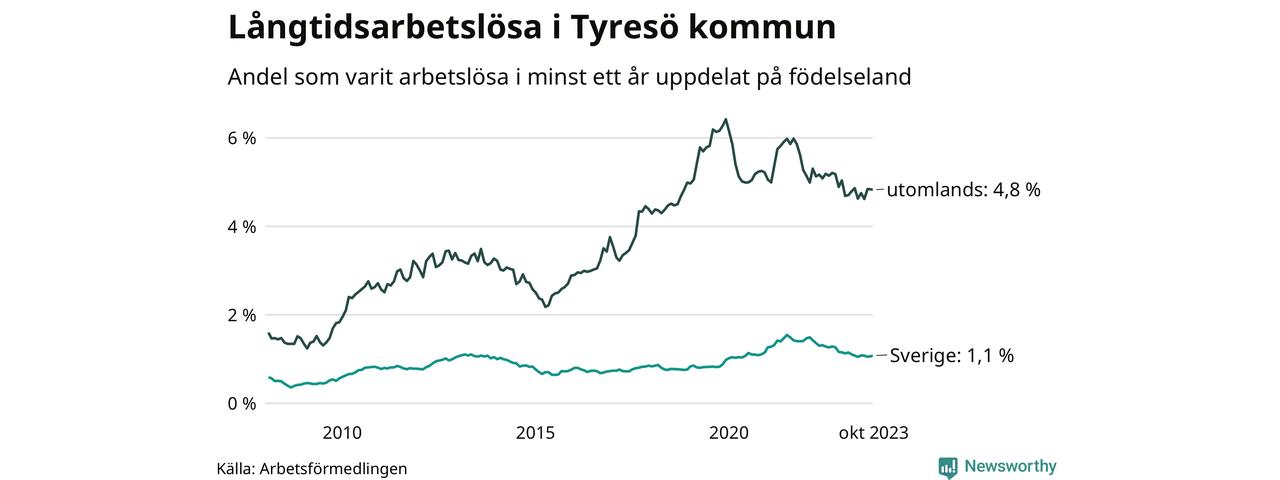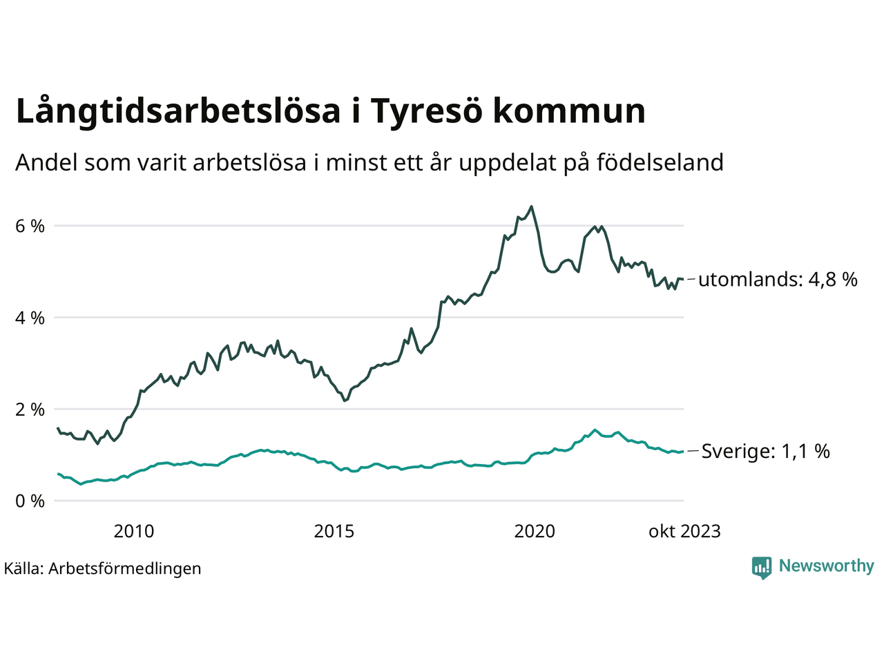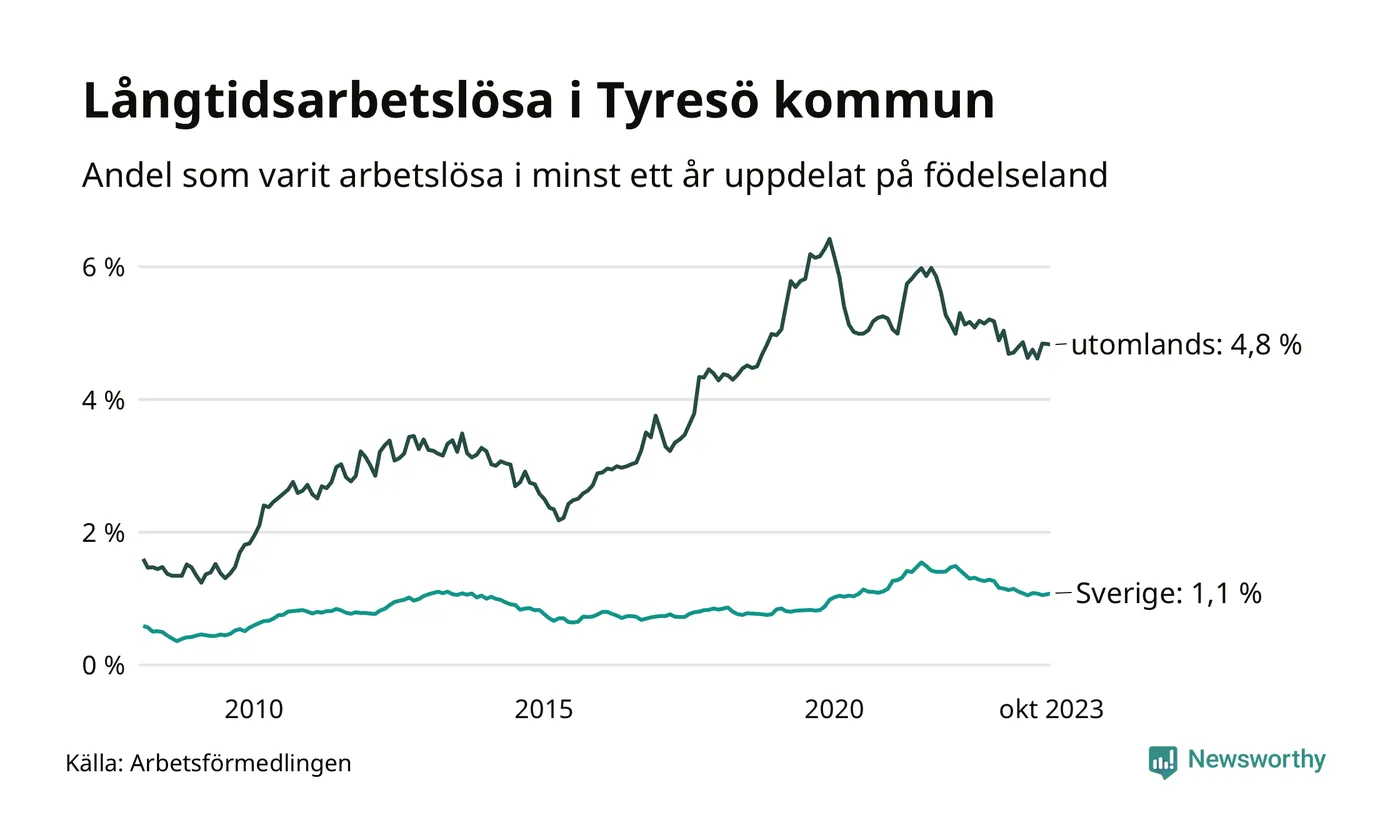 217 av de långtidsarbetslösa i Tyresö är födda i Sverige, medan 250 är födda utomlands. Det innebär att långtidsarbetslösheten bland Sverigefödda är 1,1 procent, medan den är fyra gånger så hög – 4,8 procent – bland födda utomlands. Även i riket som helhet är arbetslösheten högre bland utrikesfödda.
