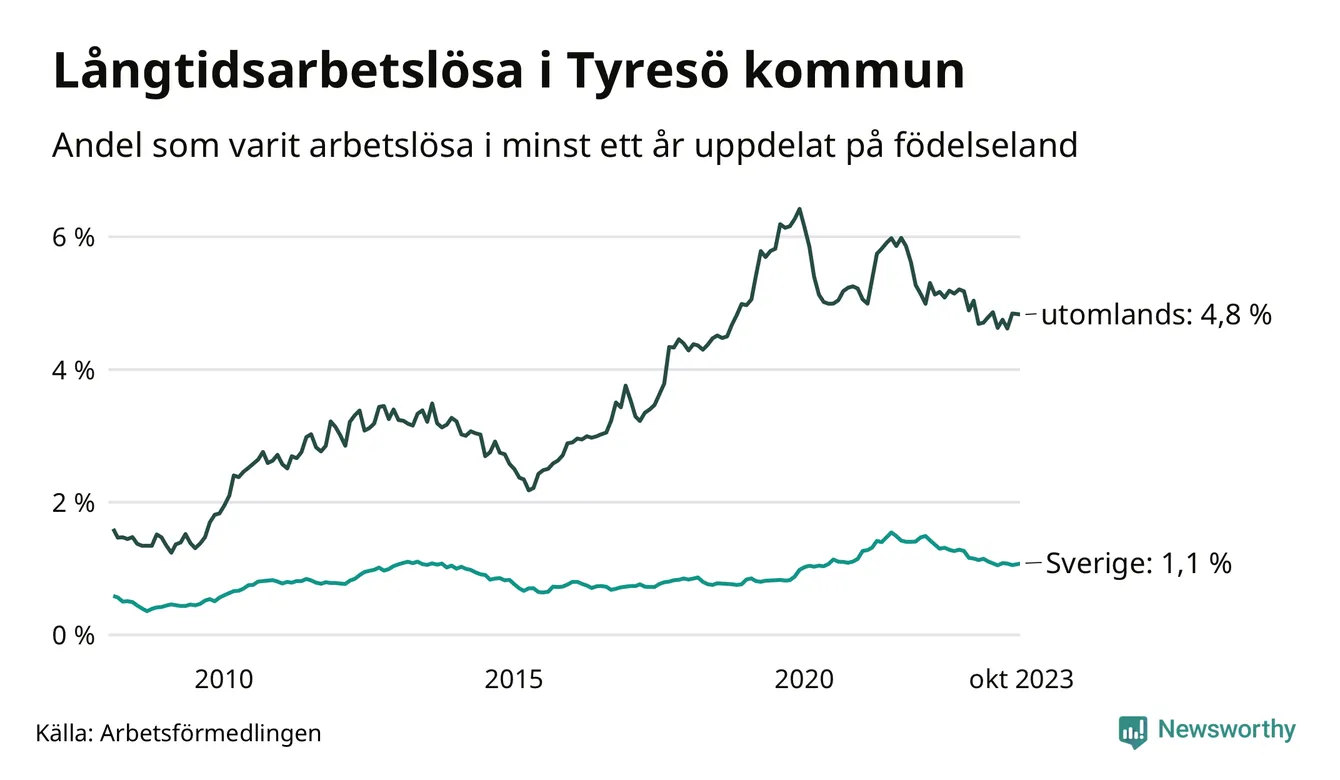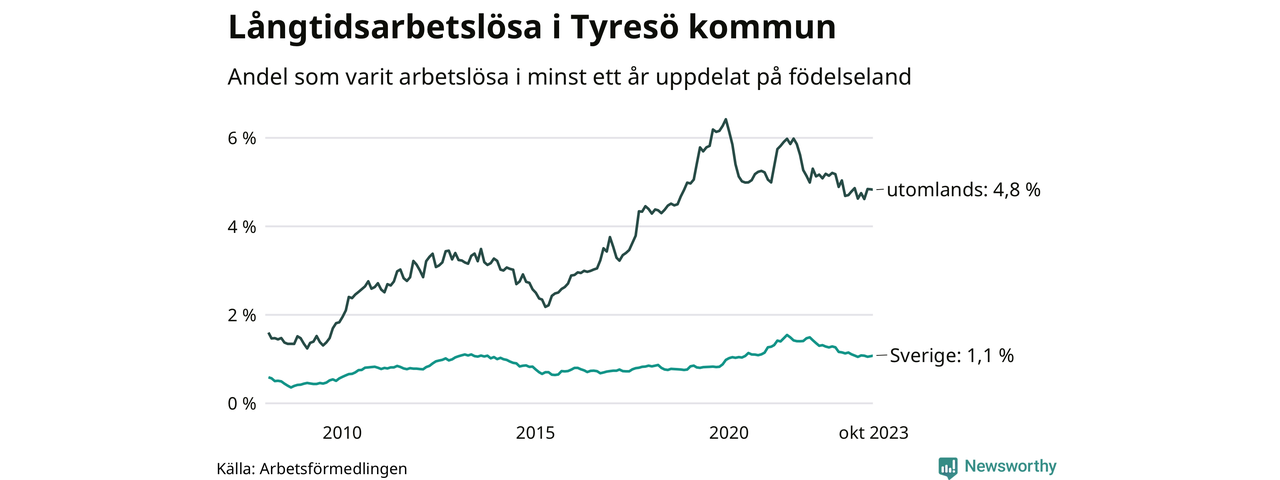 Graf: Andel arbetslösa uppdelat på födelseland i Tyresö