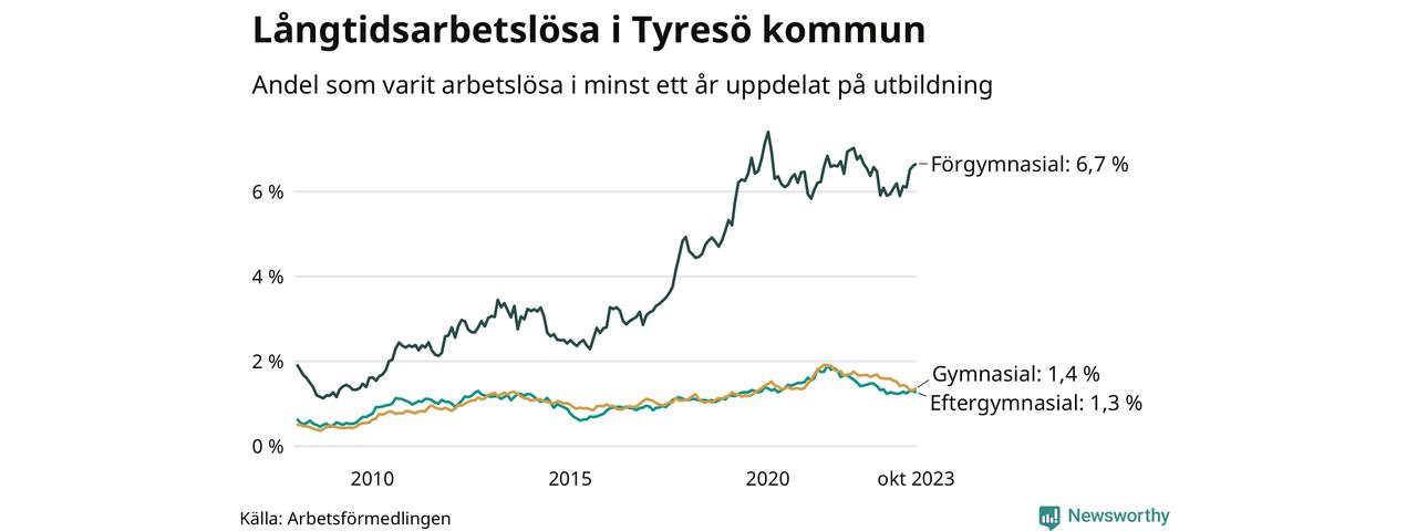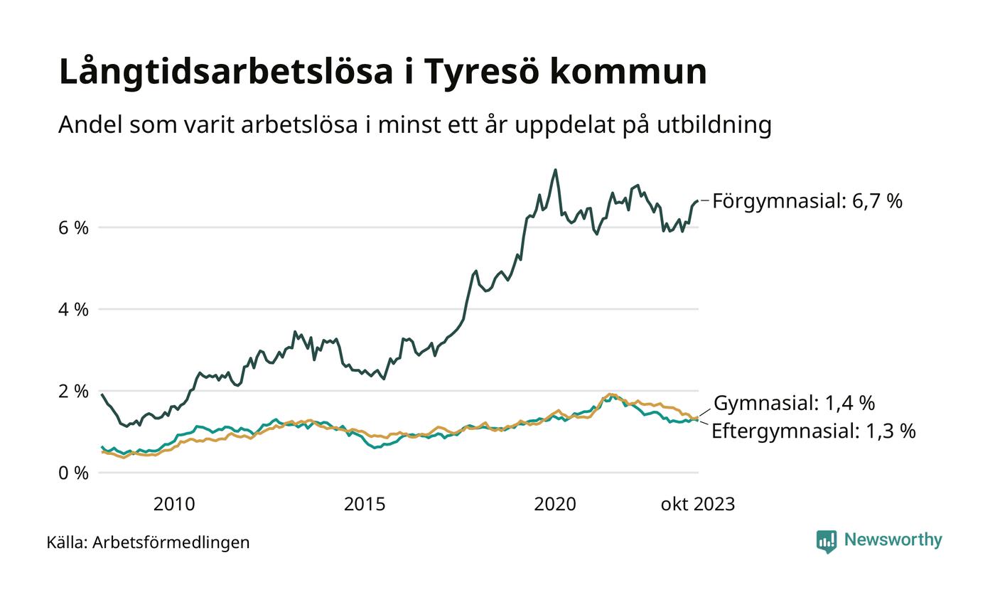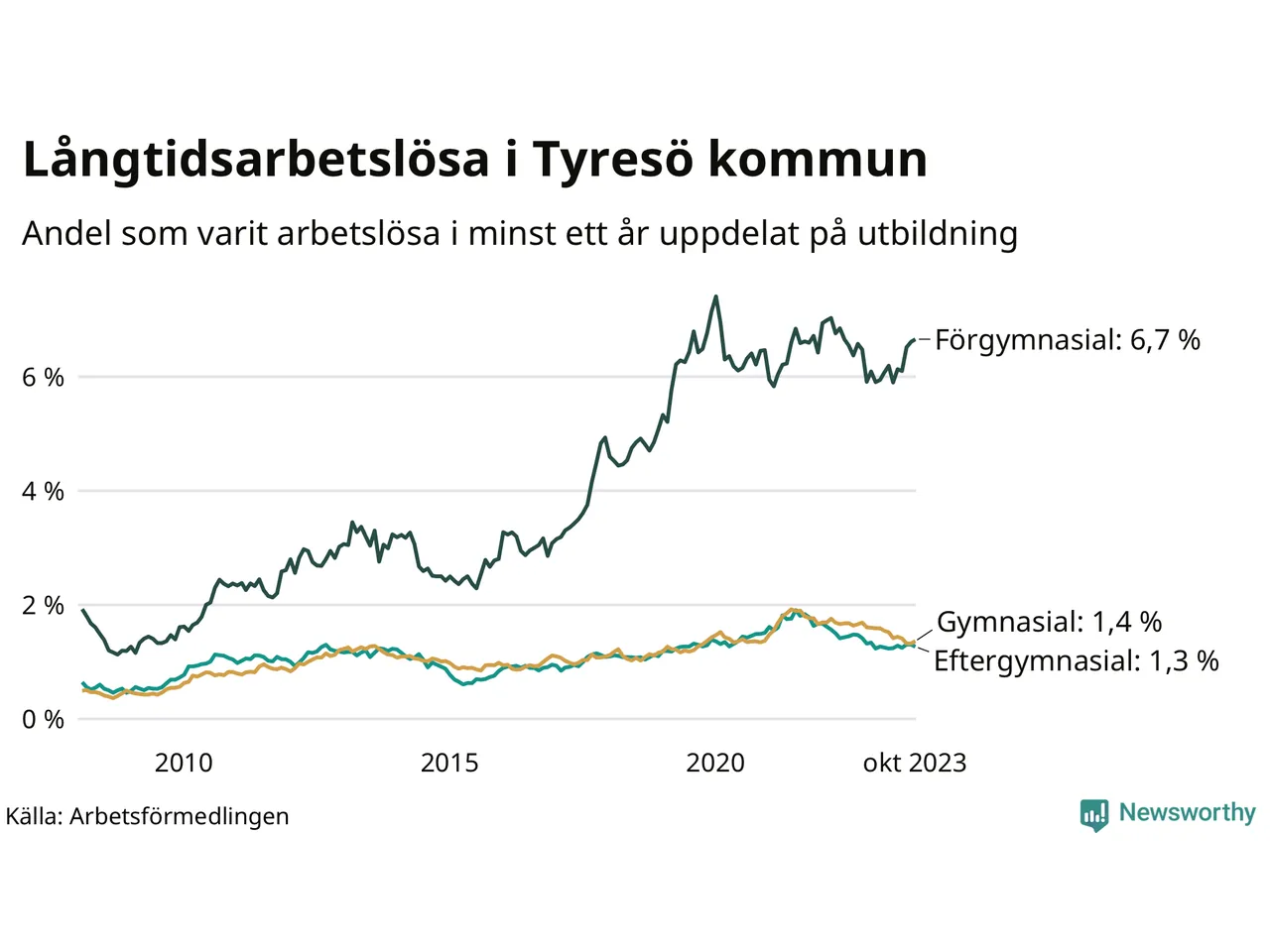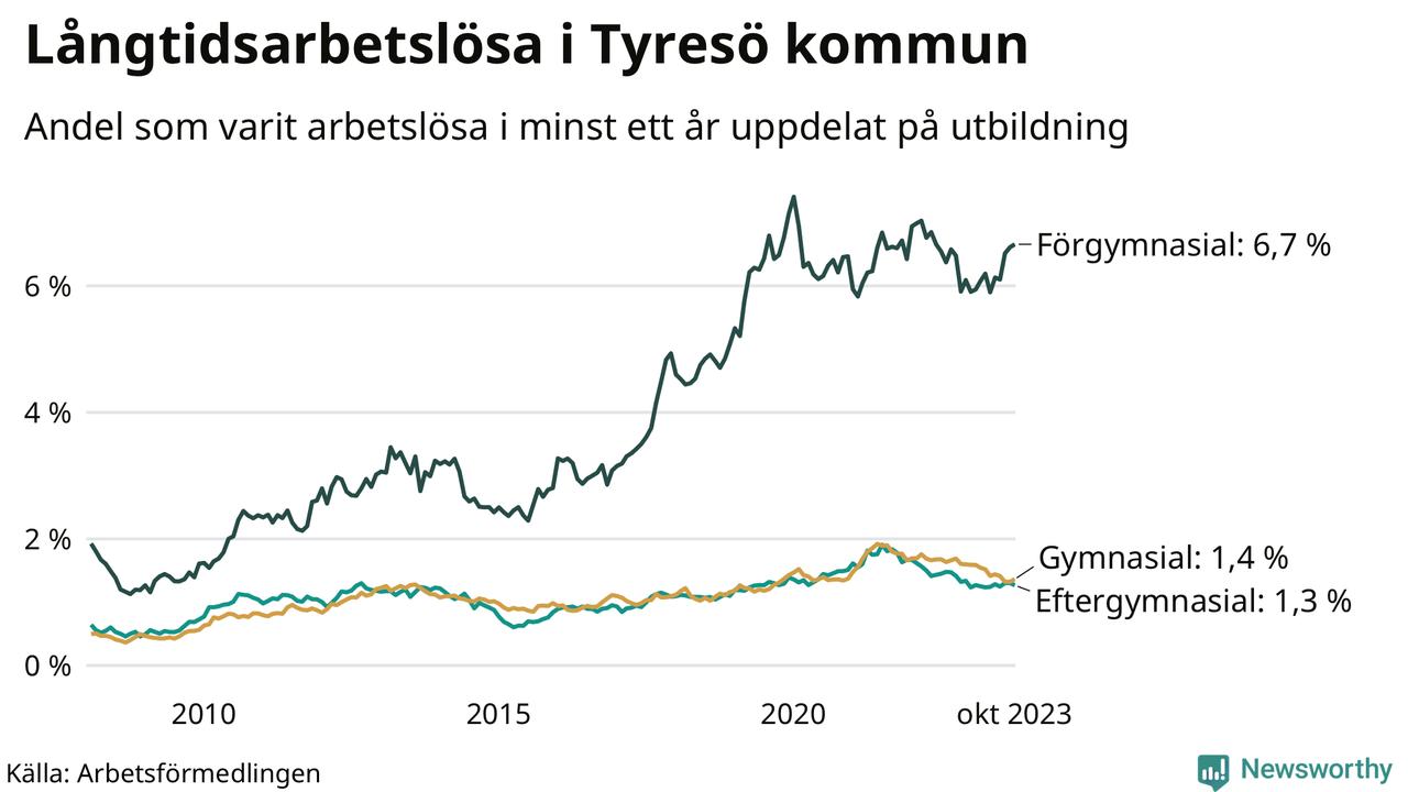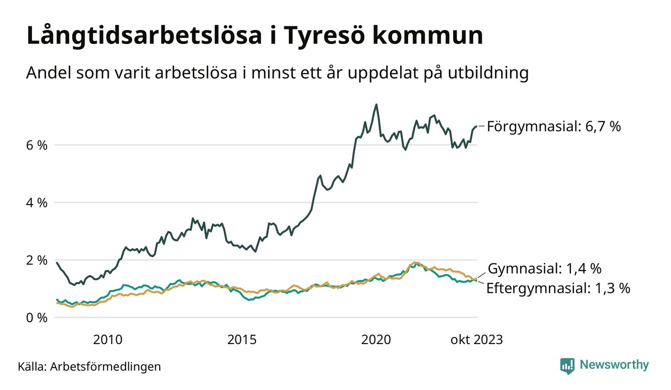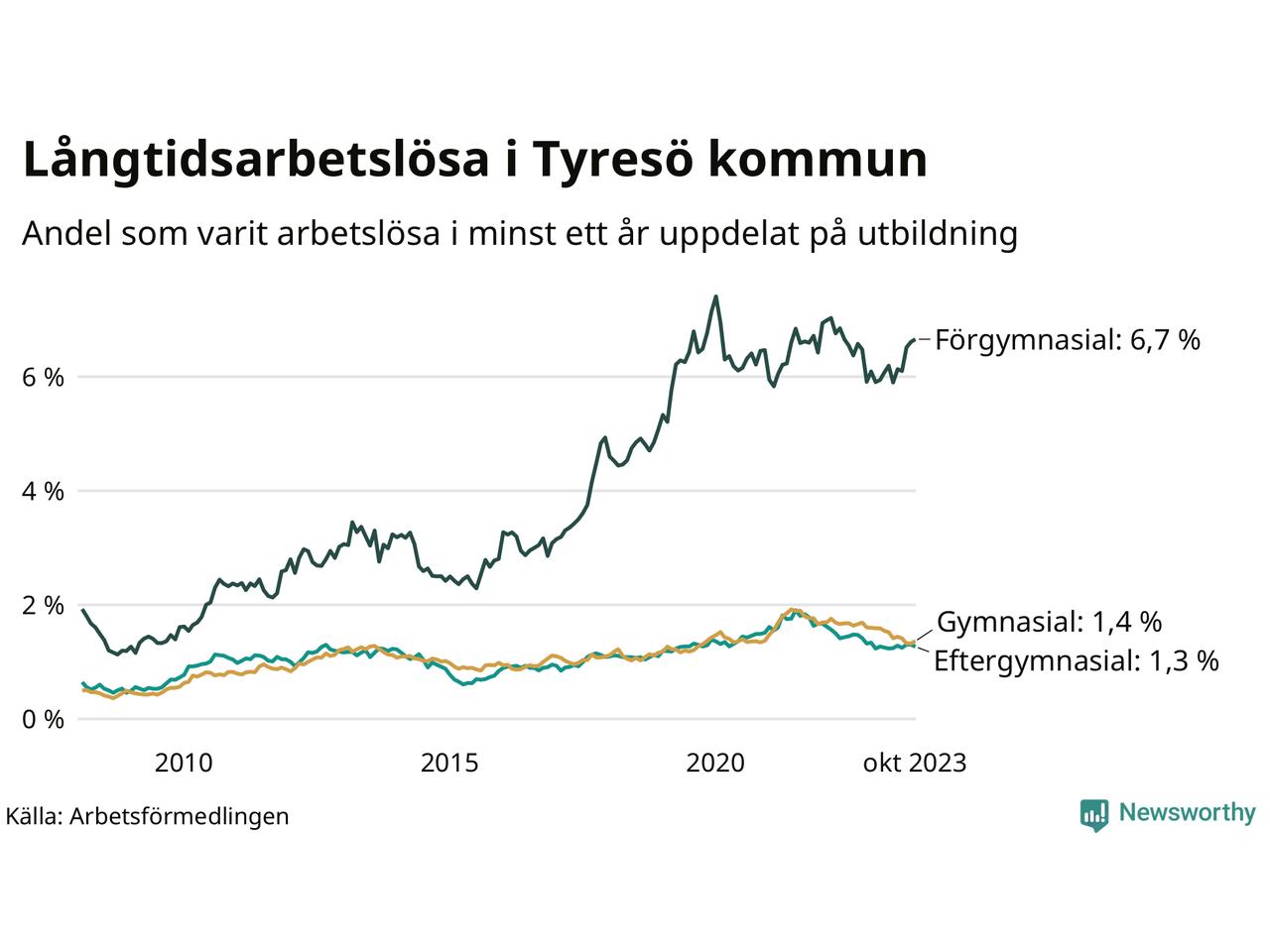 Graf: Andel arbetslösa i Tyresö som varit utan arbete i minst 12 månader