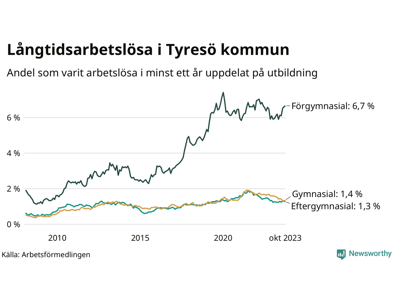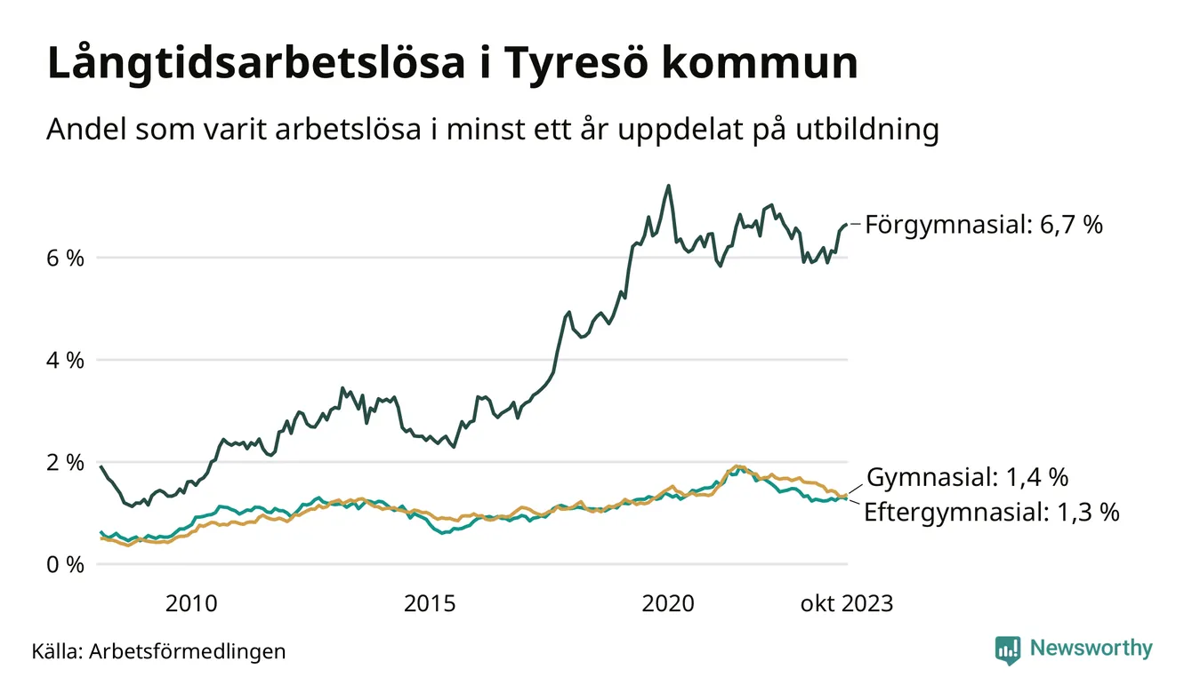 Graf över andel långtidsarbetslösa i Tyresö uppdelat på utbildningsnivå