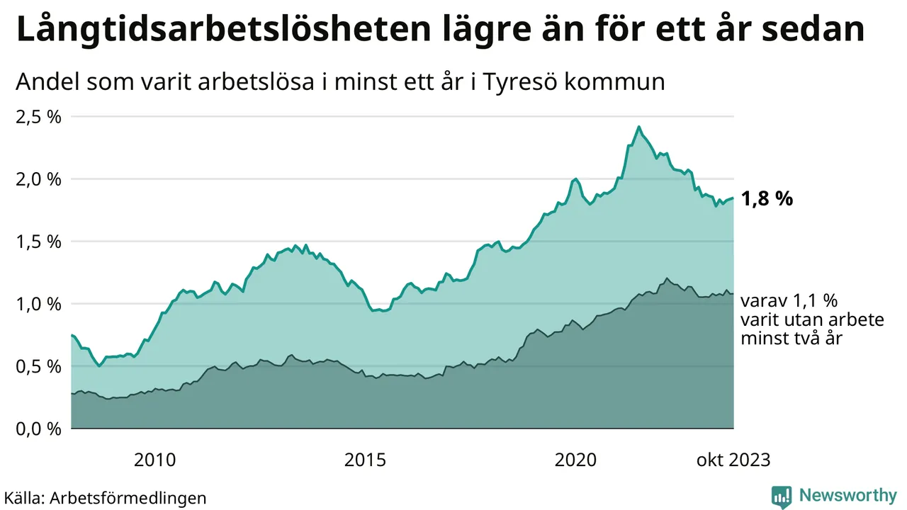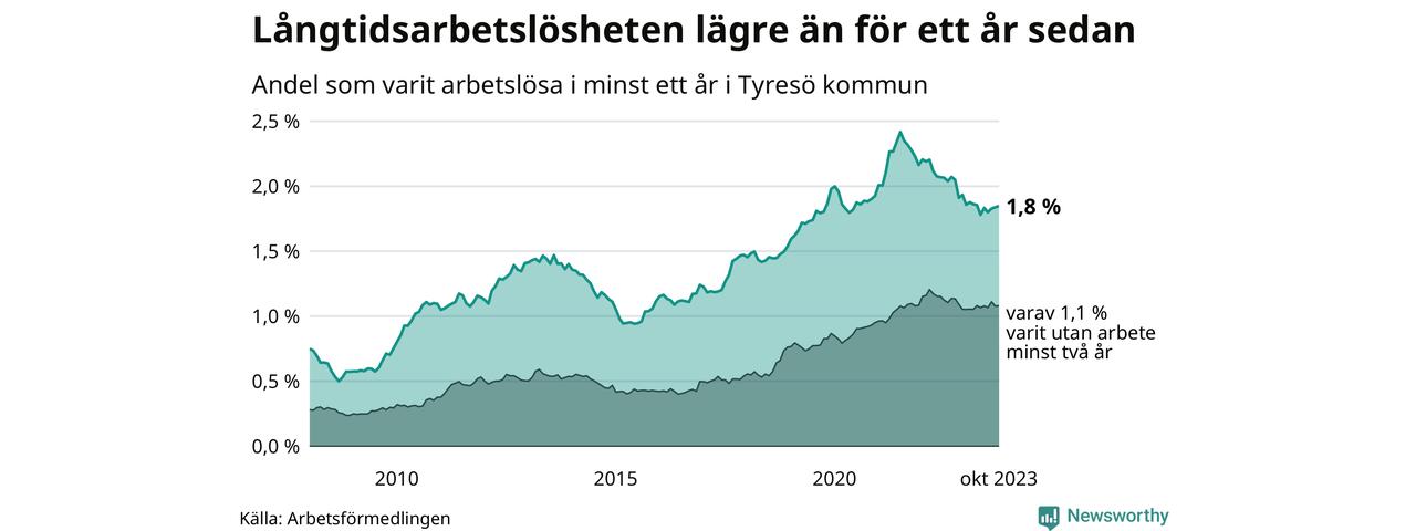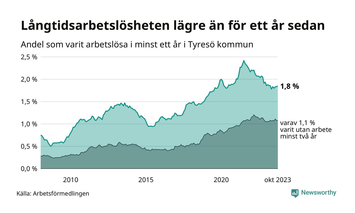 I oktober hade 467 Tyresöbor varit arbetslösa i minst ett år, vilket är tre fler än månaden innan. 467 personer motsvarar 1,8 procent av arbetskraften i kommunen – andelen långtidsarbetslösa är 0,2 procentenheter lägre än samma månad för ett år sedan.