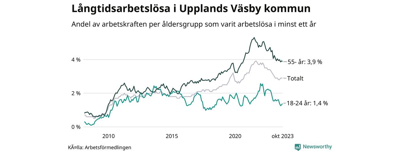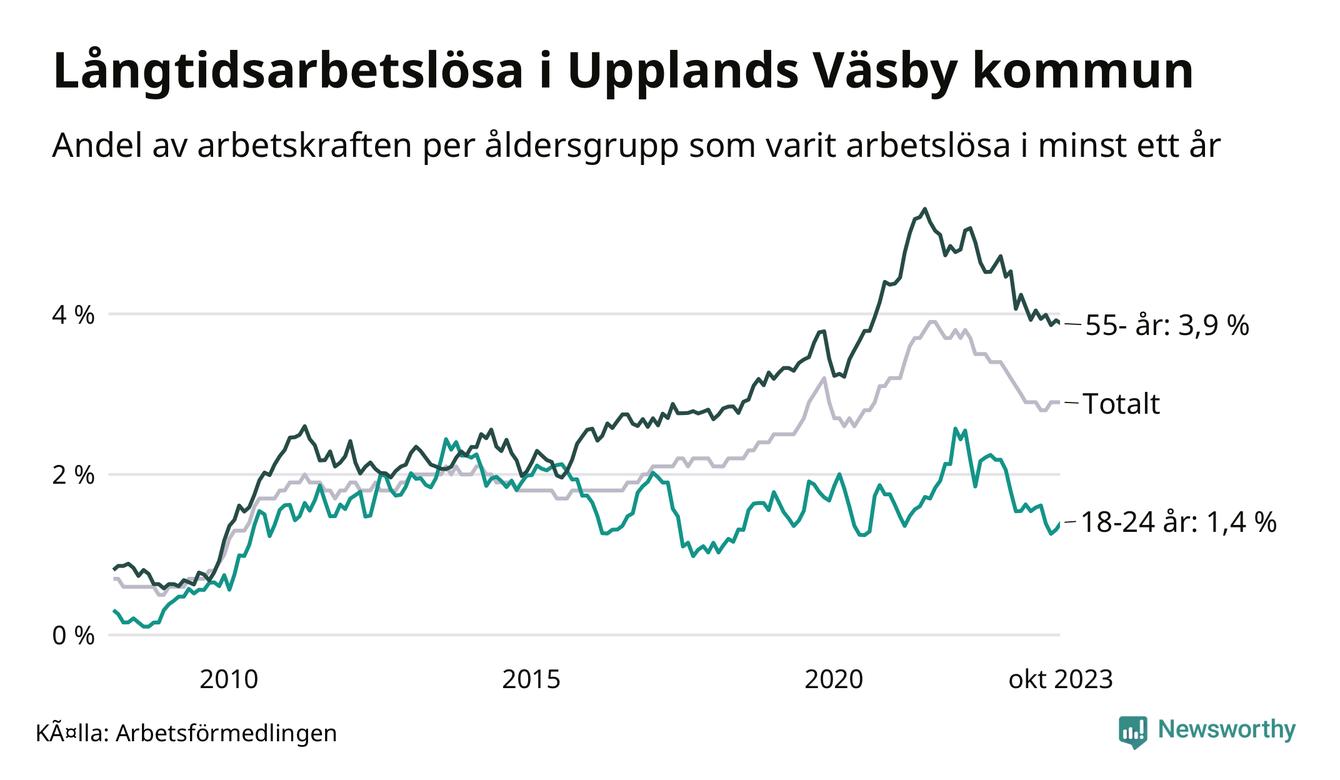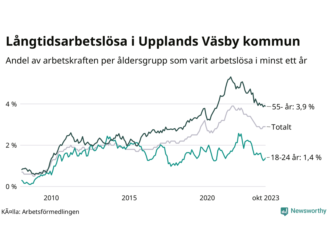 Av de 735 personerna som varit arbetslösa i mer än ett år i Upplands Väsby kommun är 178 personer mellan 55 och 651 år och 32 är mellan 18 och 24 år. För den äldre gruppen är andelen arbetslösa 3,9 procent medan den i den yngre gruppen är 1,4 procent. Även i riket som helhet är långtidsarbetslösheten högre i gruppen äldre.