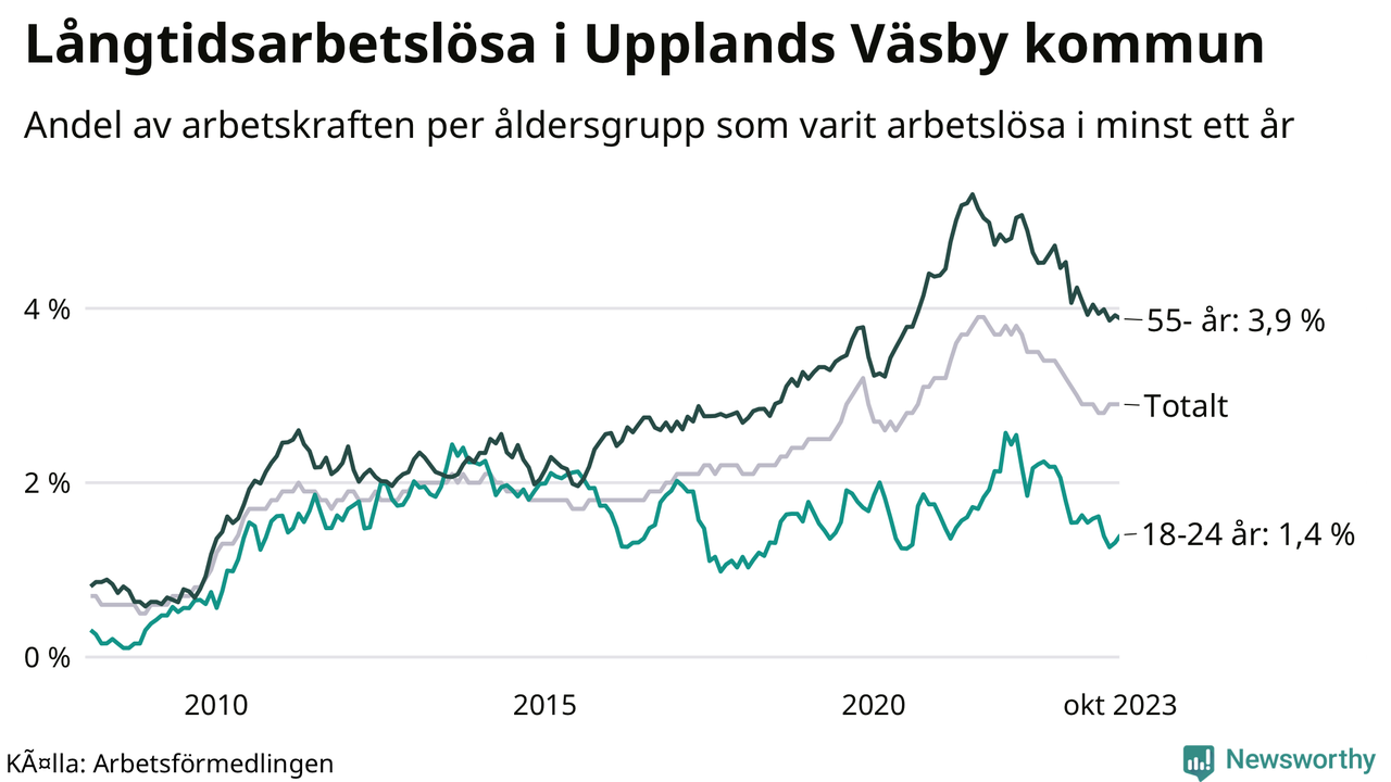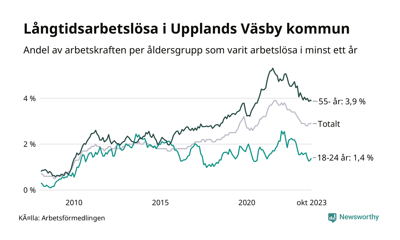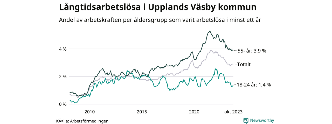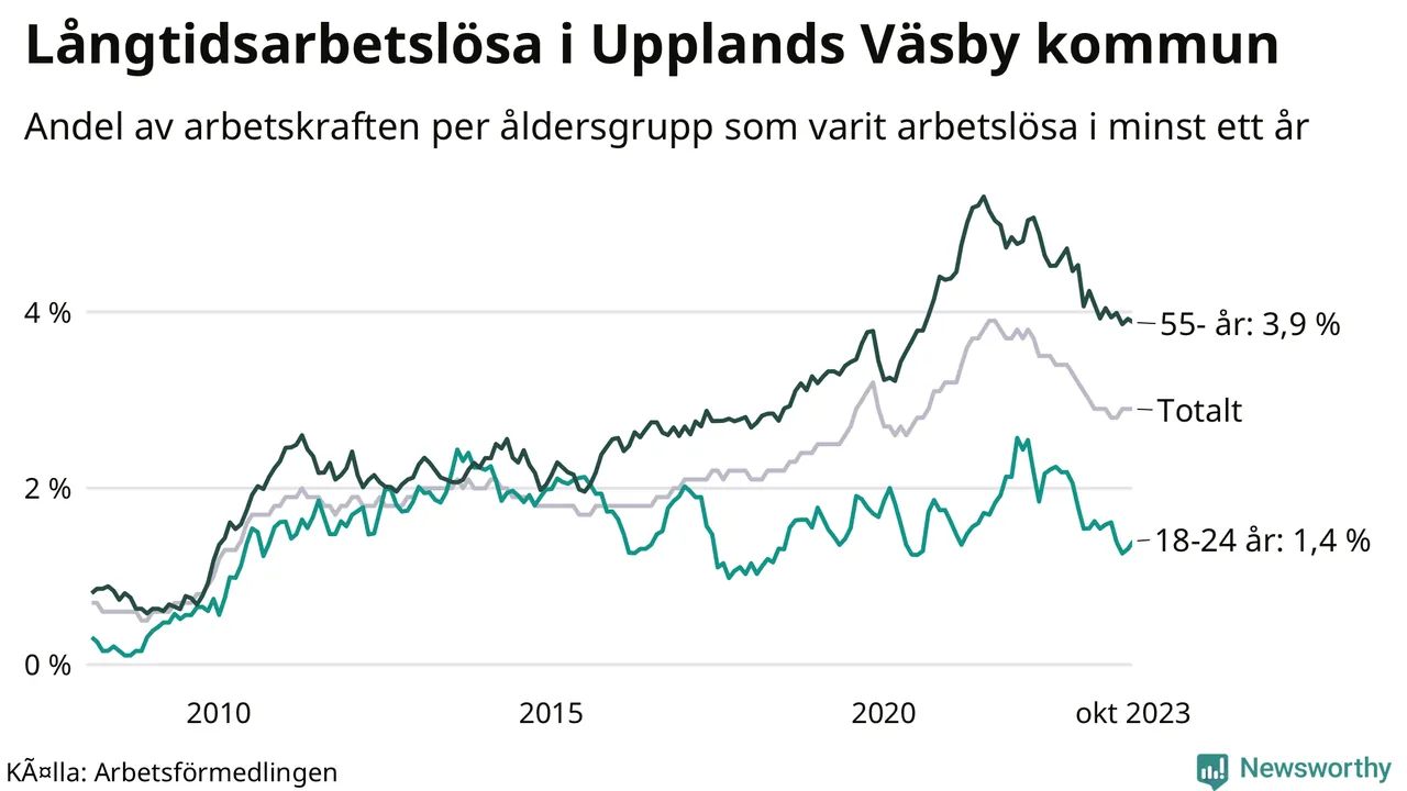 Av de 735 personerna som varit arbetslösa i mer än ett år i Upplands Väsby kommun är 178 personer mellan 55 och 651 år och 32 är mellan 18 och 24 år. För den äldre gruppen är andelen arbetslösa 3,9 procent medan den i den yngre gruppen är 1,4 procent. Även i riket som helhet är långtidsarbetslösheten högre i gruppen äldre.
