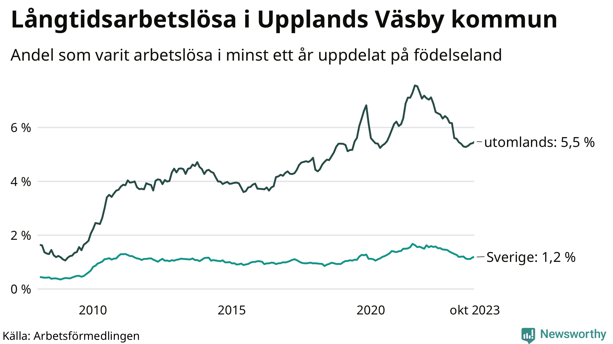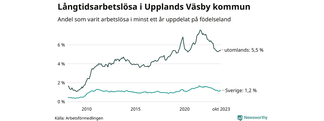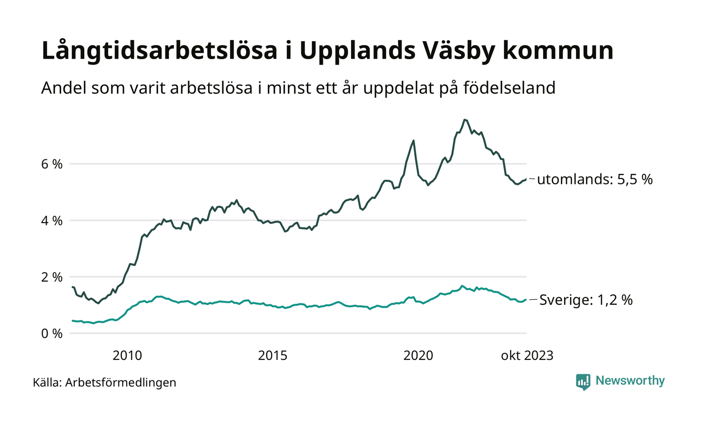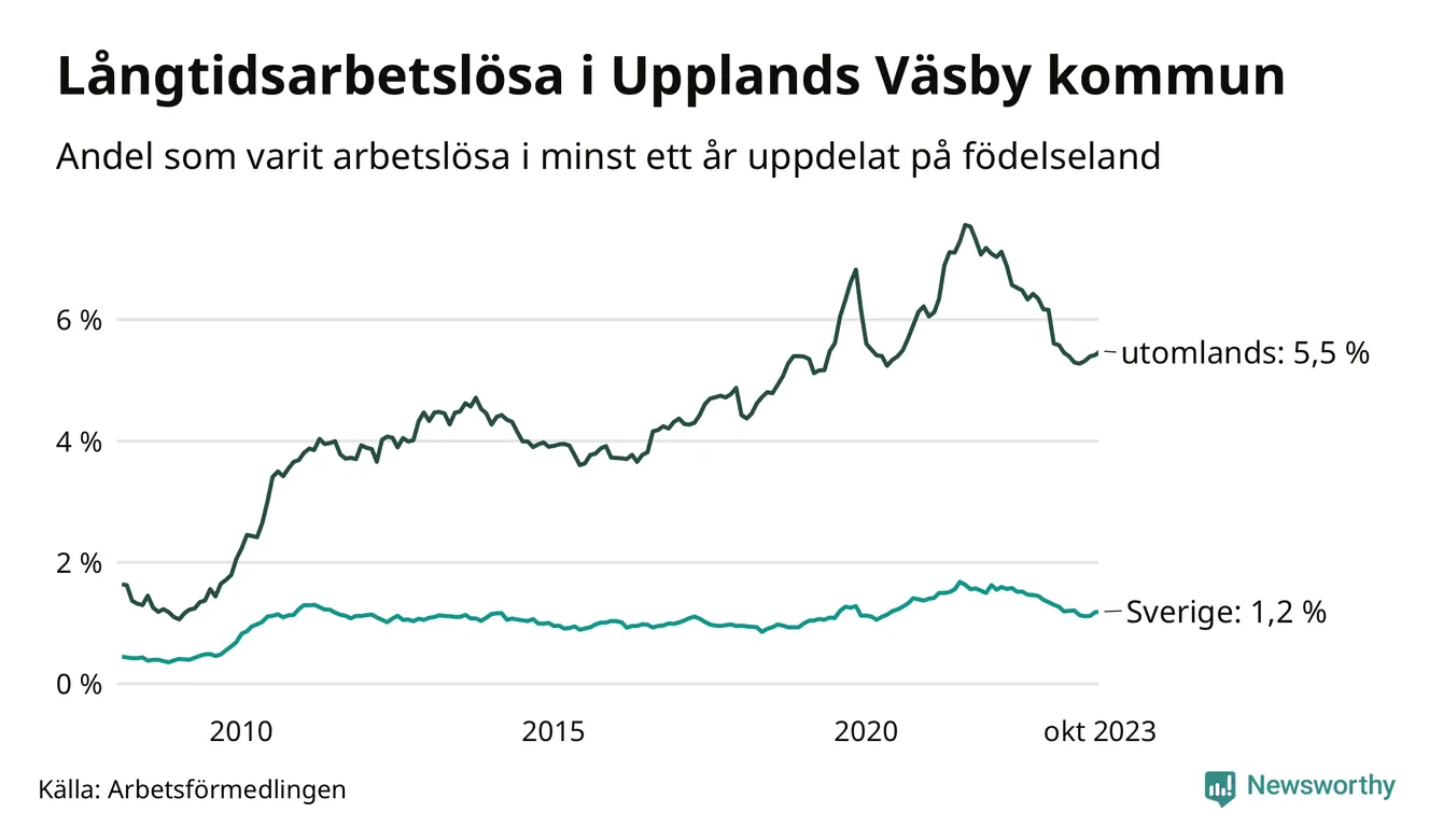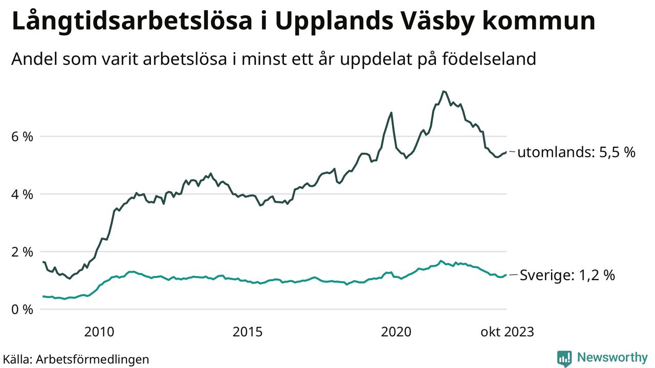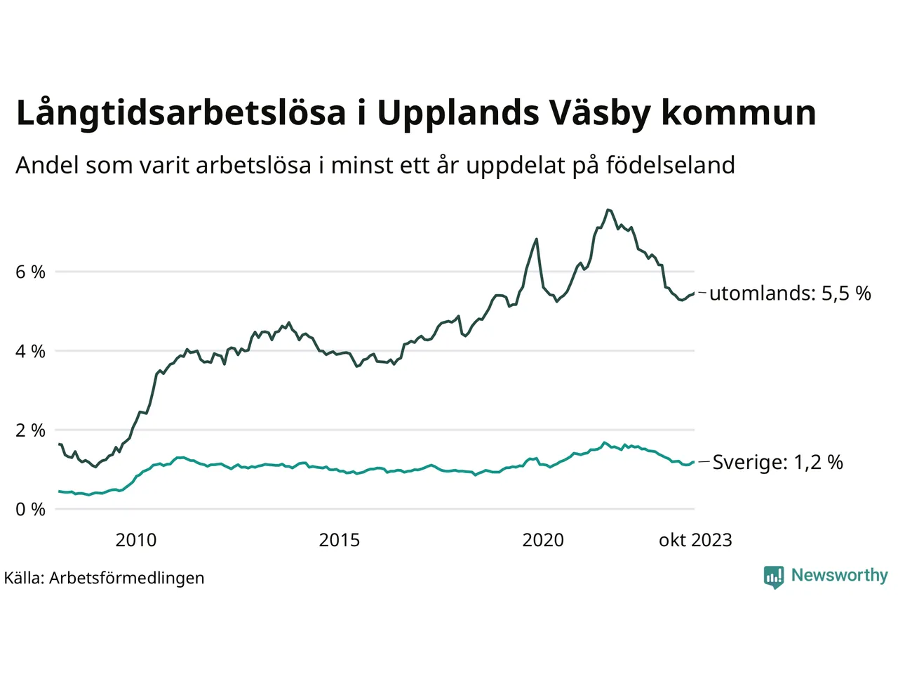 176 av de långtidsarbetslösa i Upplands Väsby är födda i Sverige, medan 559 är födda utomlands. Det innebär att långtidsarbetslösheten bland Sverigefödda är 1,2 procent, medan den är fem gånger så hög – 5,5 procent – bland födda utomlands. Även i riket som helhet är arbetslösheten högre bland utrikesfödda.