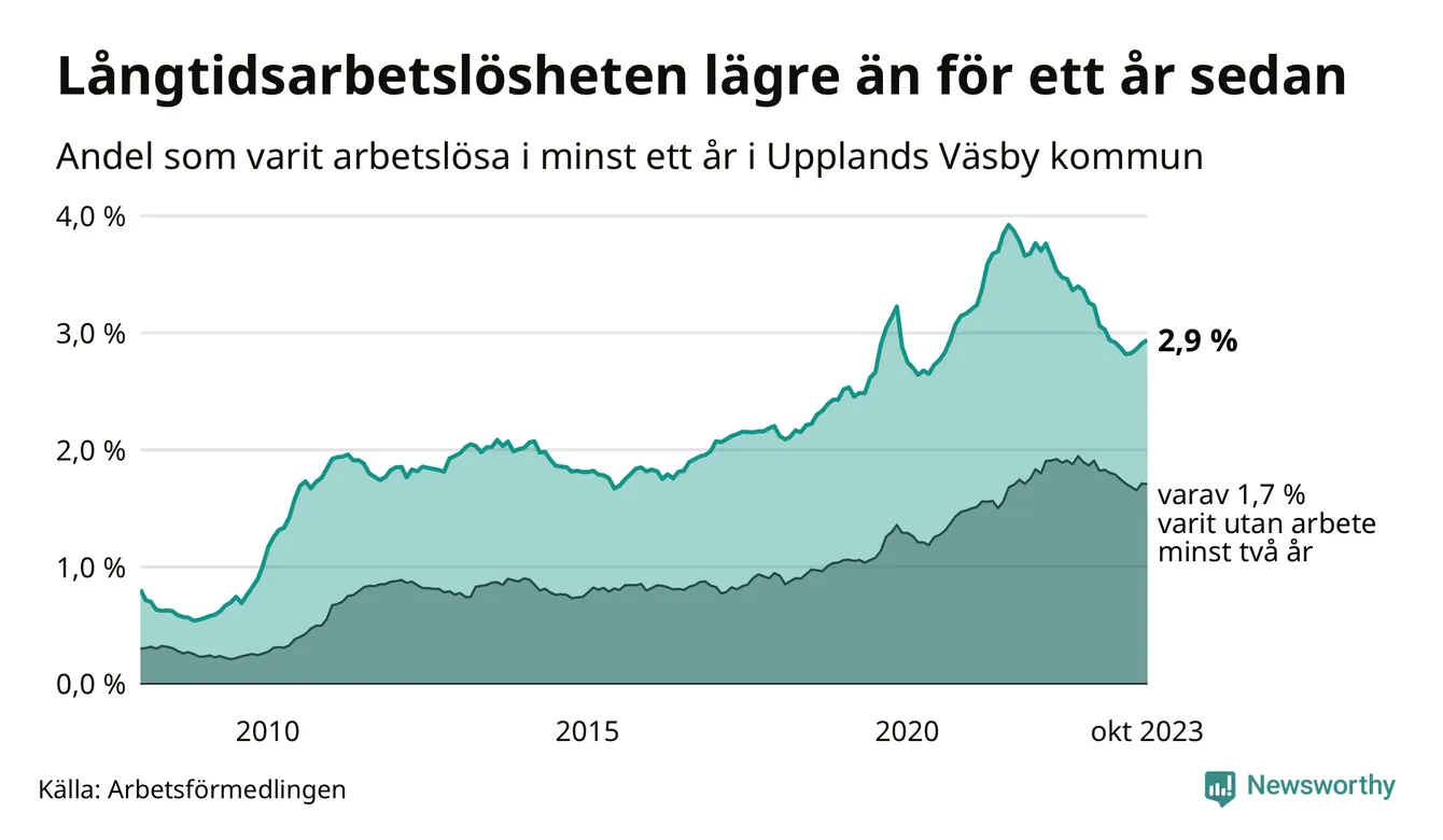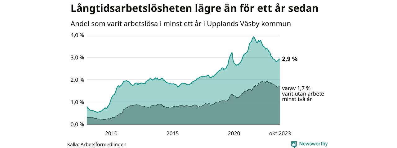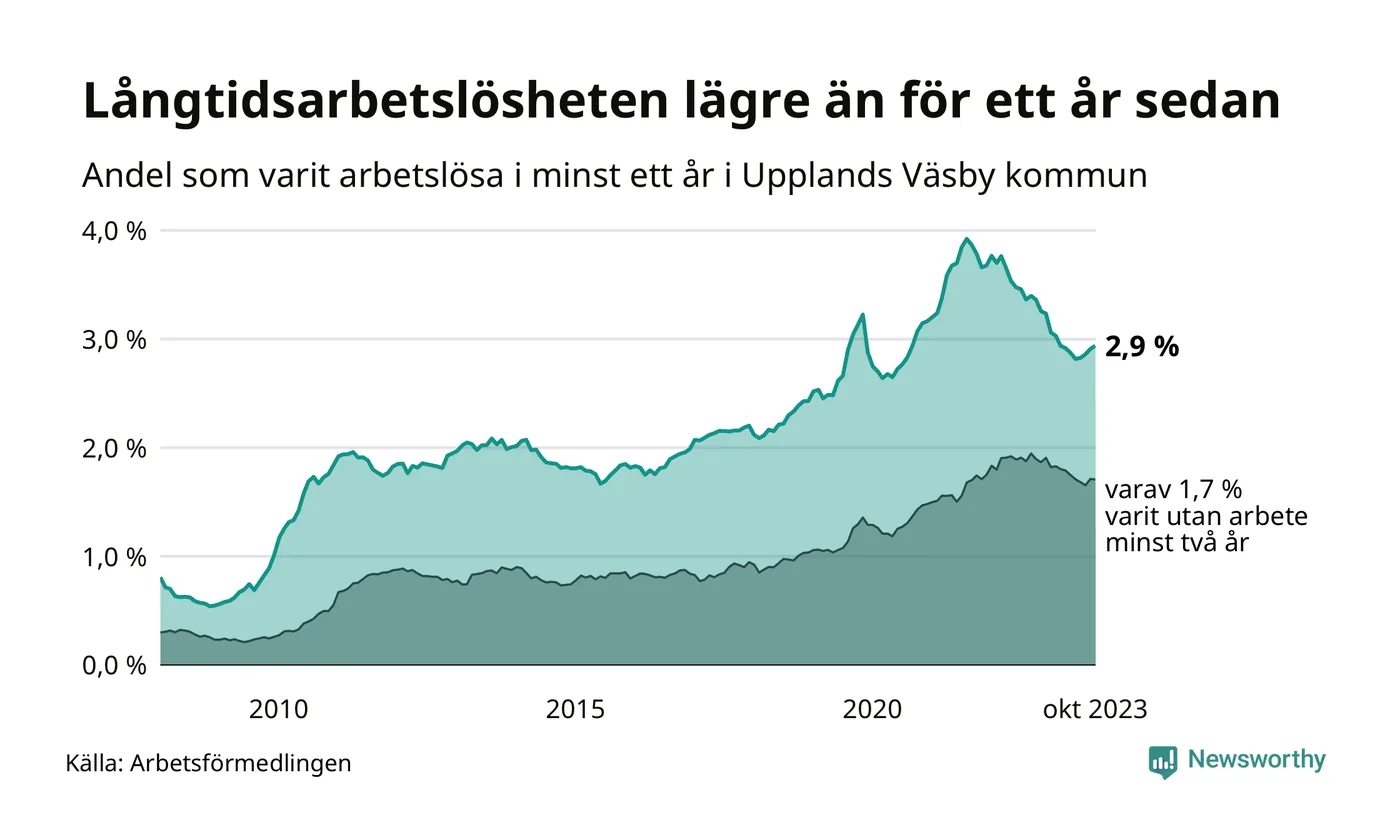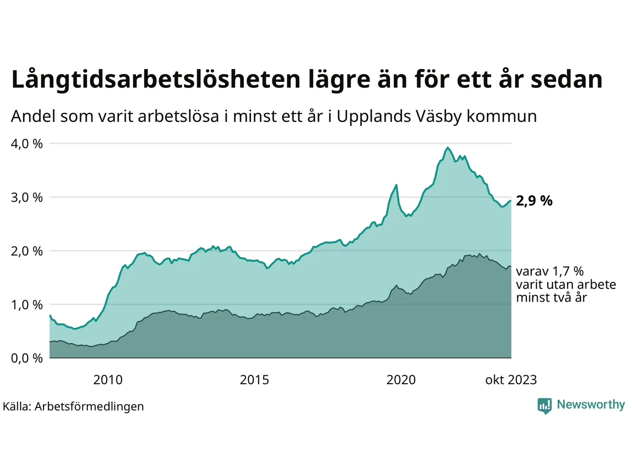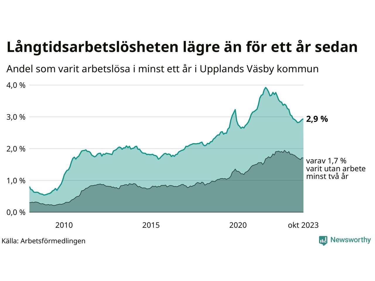 I oktober hade 735 Upplands Väsbybor varit arbetslösa i minst ett år, vilket är sex fler än månaden innan. Det är den fjärde månaden i rad med ökande antal långtidsarbetslösa. 735 personer motsvarar 2,9 procent av arbetskraften i kommunen – andelen långtidsarbetslösa är 0,5 procentenheter lägre än samma månad för ett år sedan.