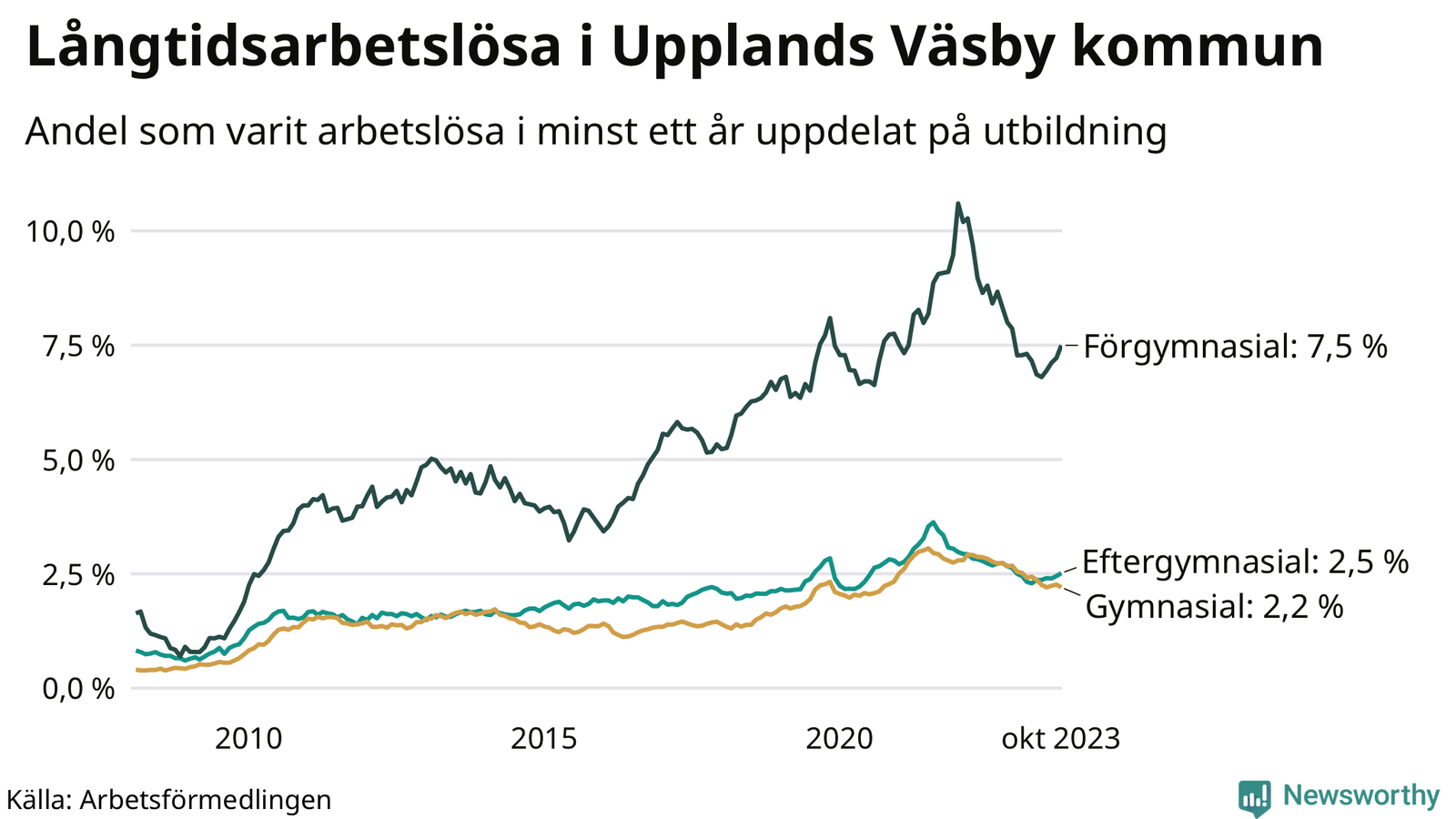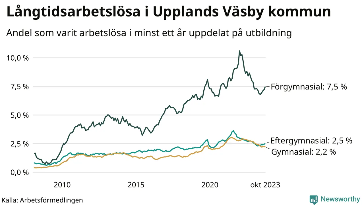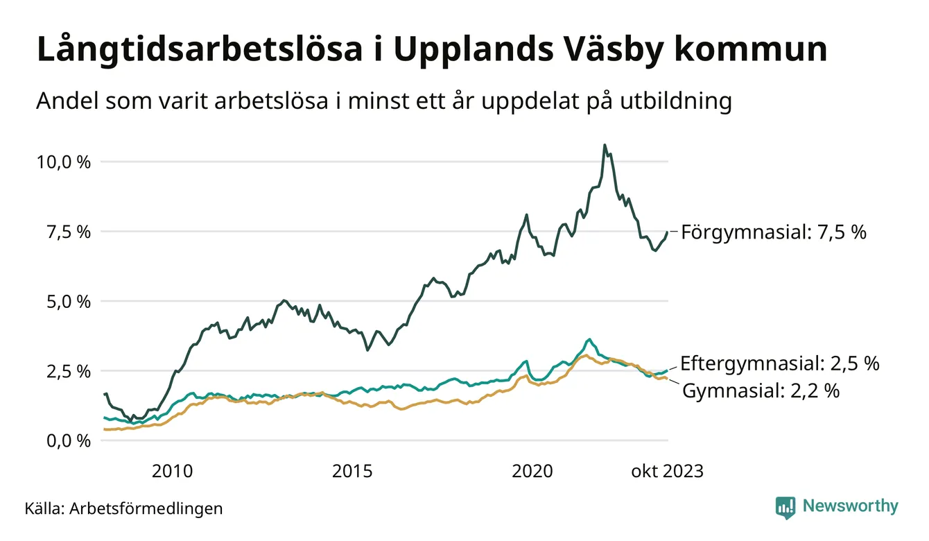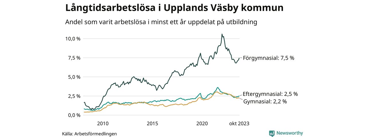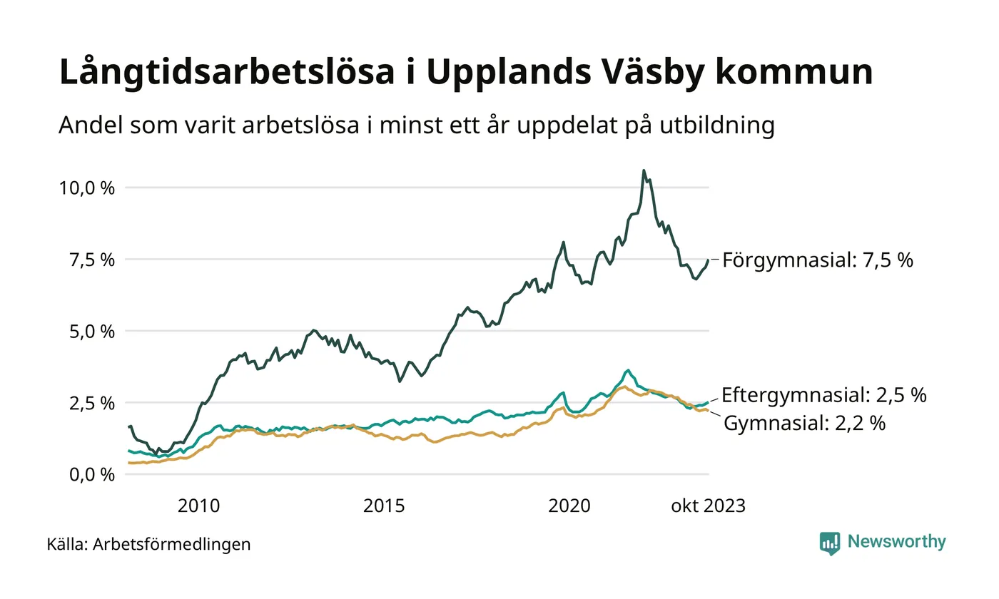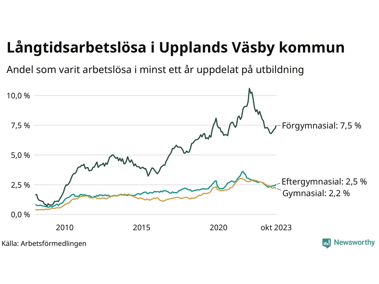 I oktober hade 735 Upplands Väsbybor varit arbetslösa i minst ett år, vilket är sex fler än månaden innan. Det är den fjärde månaden i rad med ökande antal långtidsarbetslösa. 735 personer motsvarar 2,9 procent av arbetskraften i kommunen – andelen långtidsarbetslösa är 0,5 procentenheter lägre än samma månad för ett år sedan.
