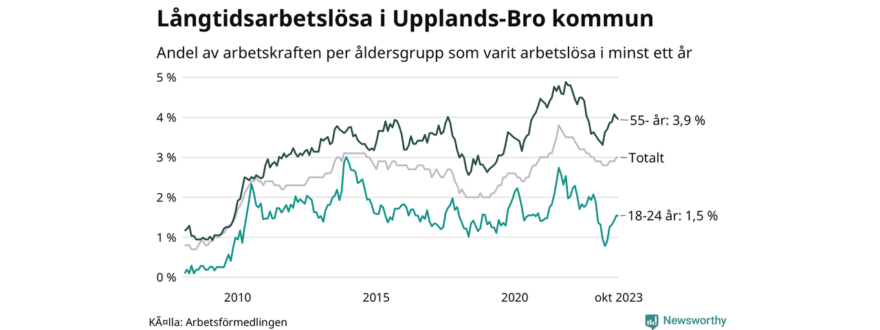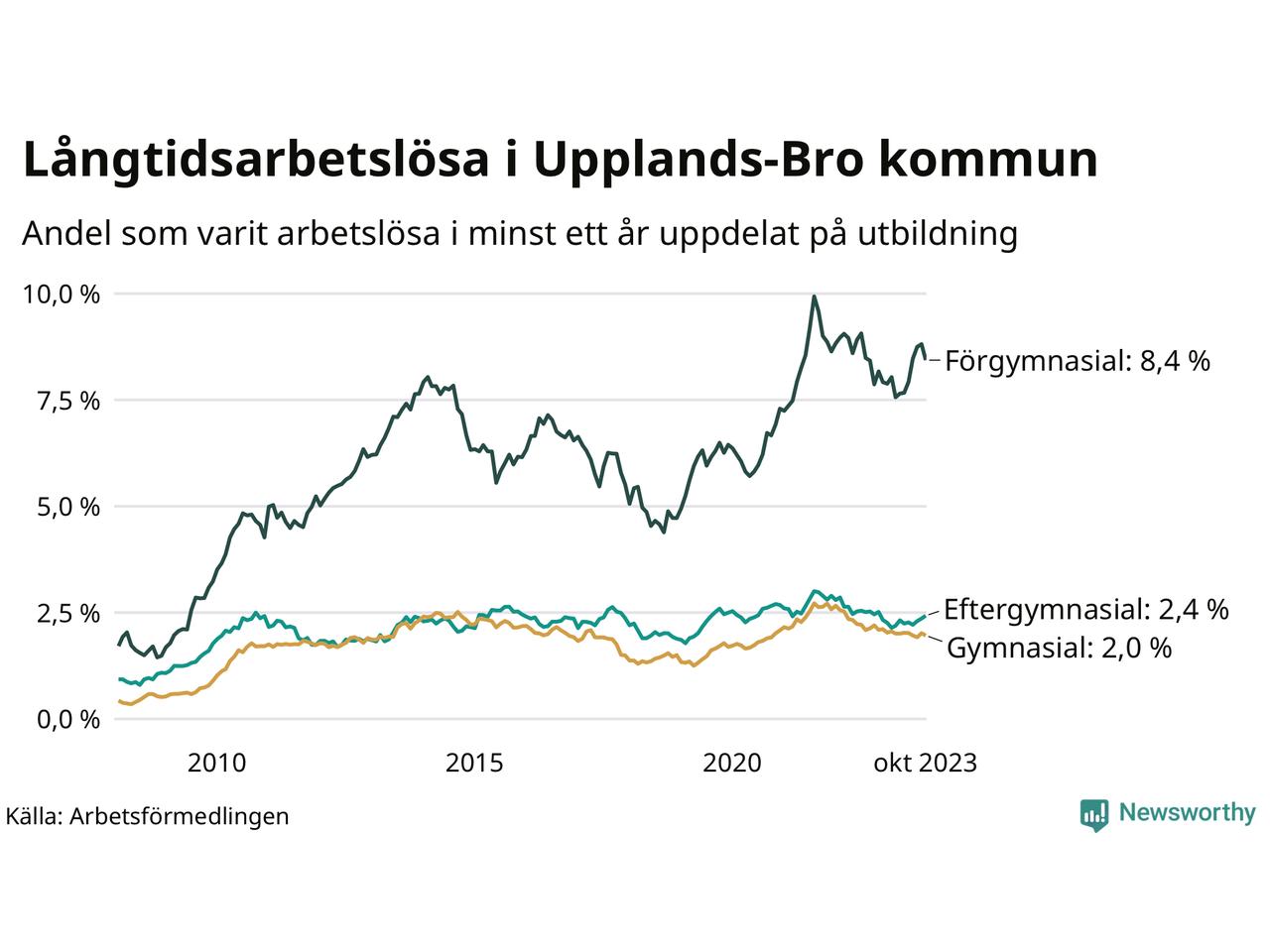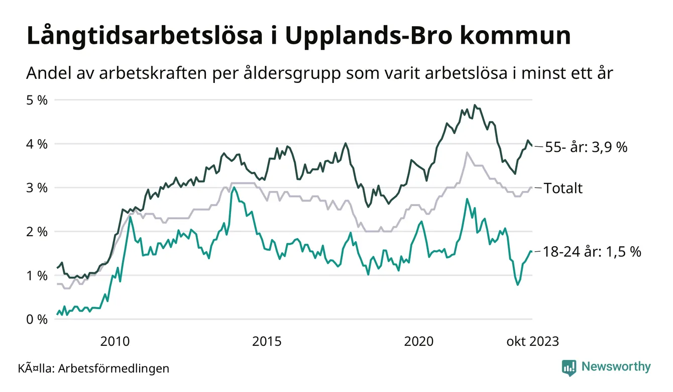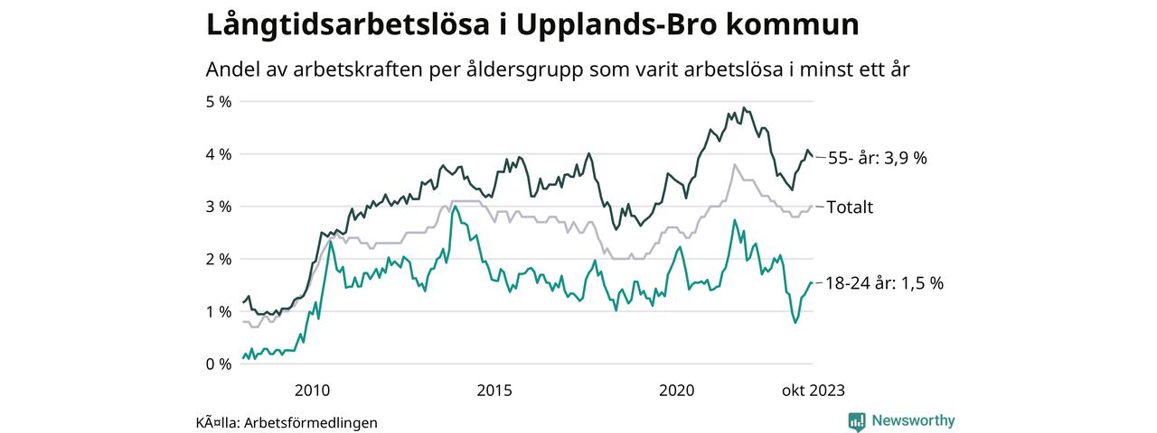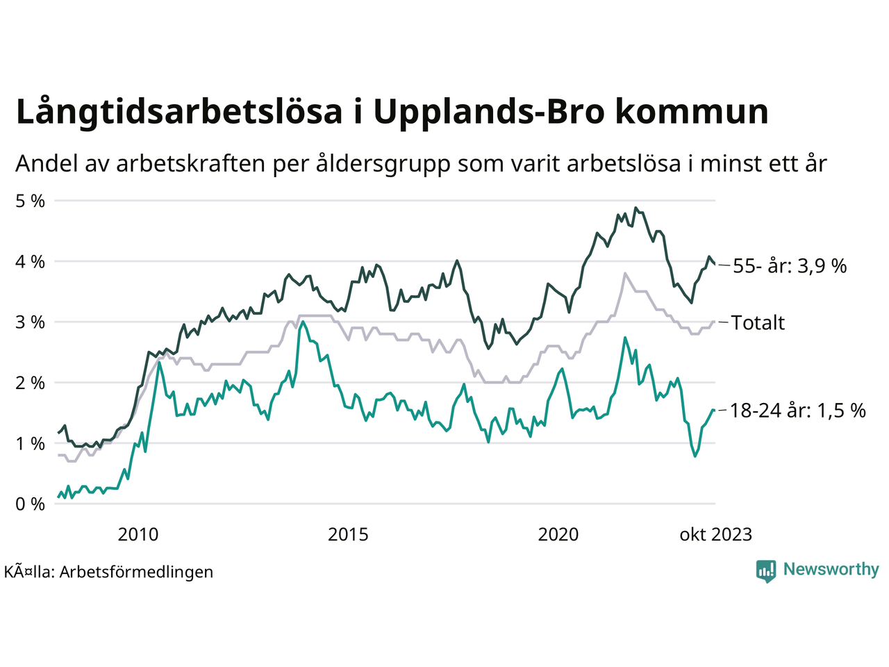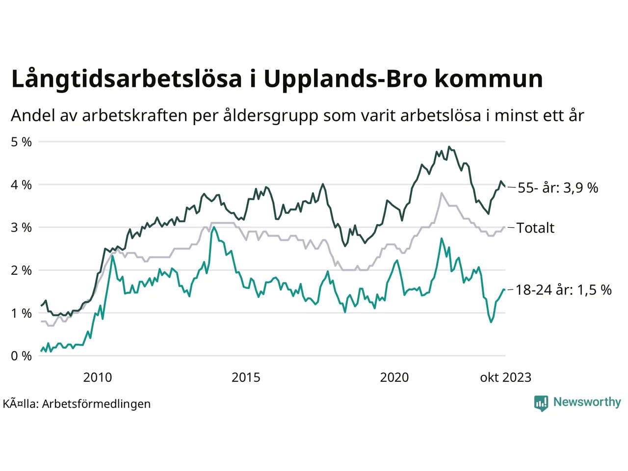 Av de 479 personerna som varit arbetslösa i mer än ett år i Upplands-Bro kommun är 110 personer mellan 55 och 651 år och 26 är mellan 18 och 24 år. För den äldre gruppen är andelen arbetslösa 3,9 procent medan den i den yngre gruppen är 1,5 procent. Även i riket som helhet är långtidsarbetslösheten högre i gruppen äldre.