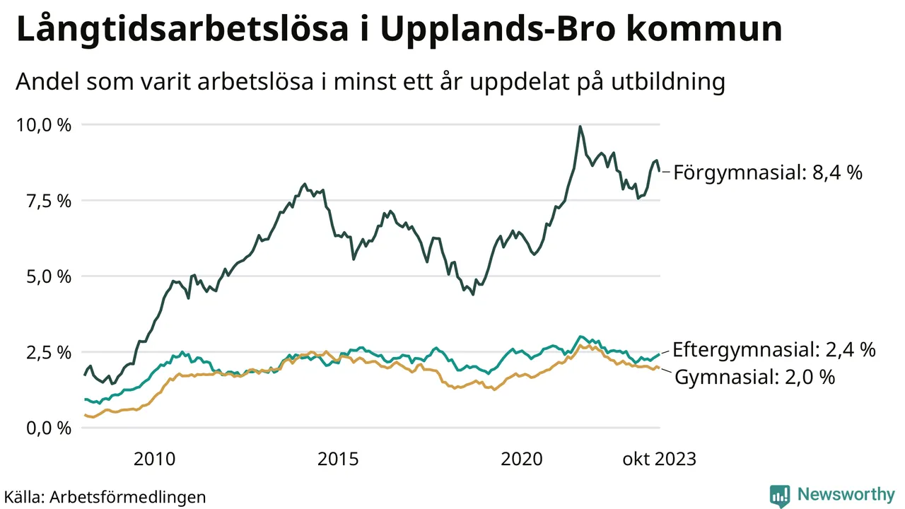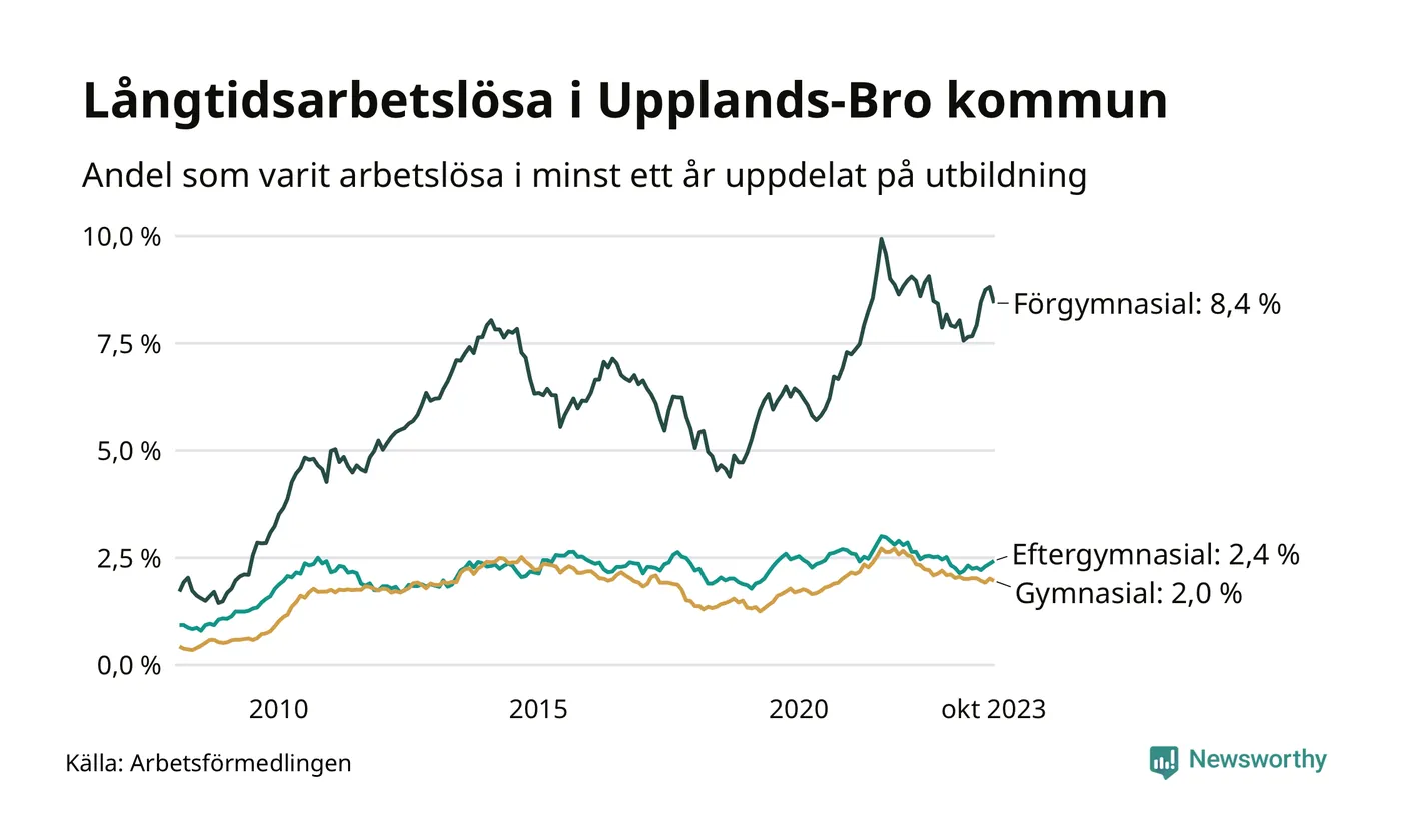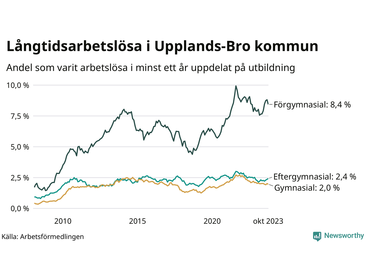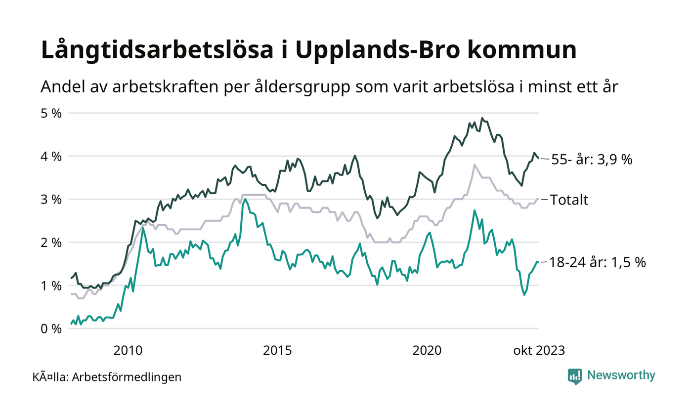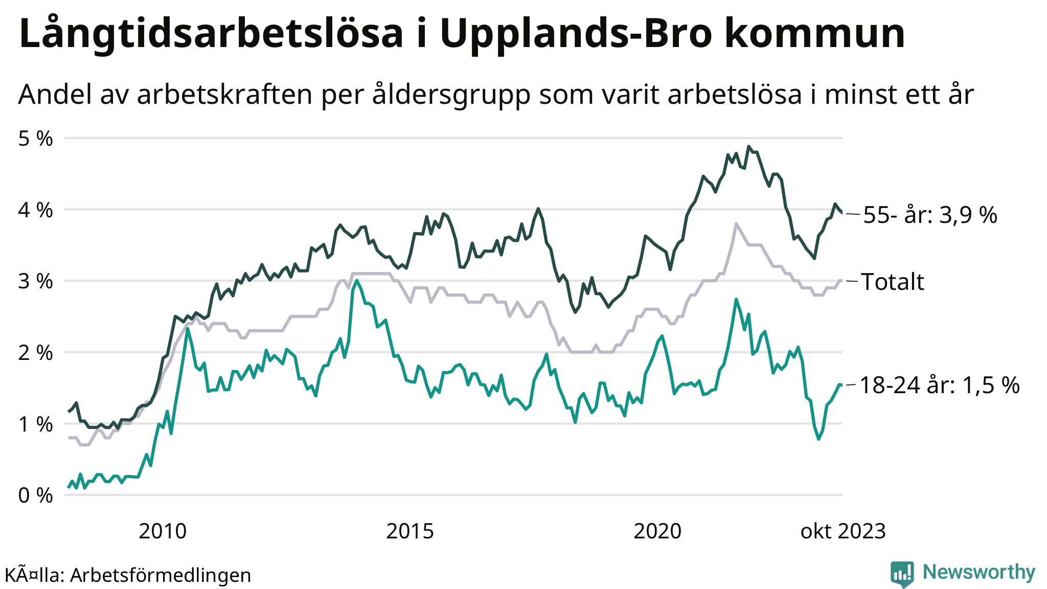 Av de 479 personerna som varit arbetslösa i mer än ett år i Upplands-Bro kommun är 110 personer mellan 55 och 651 år och 26 är mellan 18 och 24 år. För den äldre gruppen är andelen arbetslösa 3,9 procent medan den i den yngre gruppen är 1,5 procent. Även i riket som helhet är långtidsarbetslösheten högre i gruppen äldre.