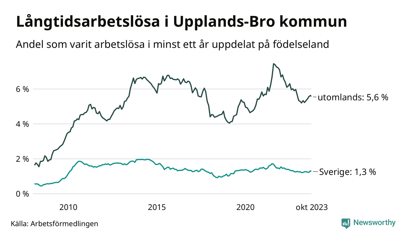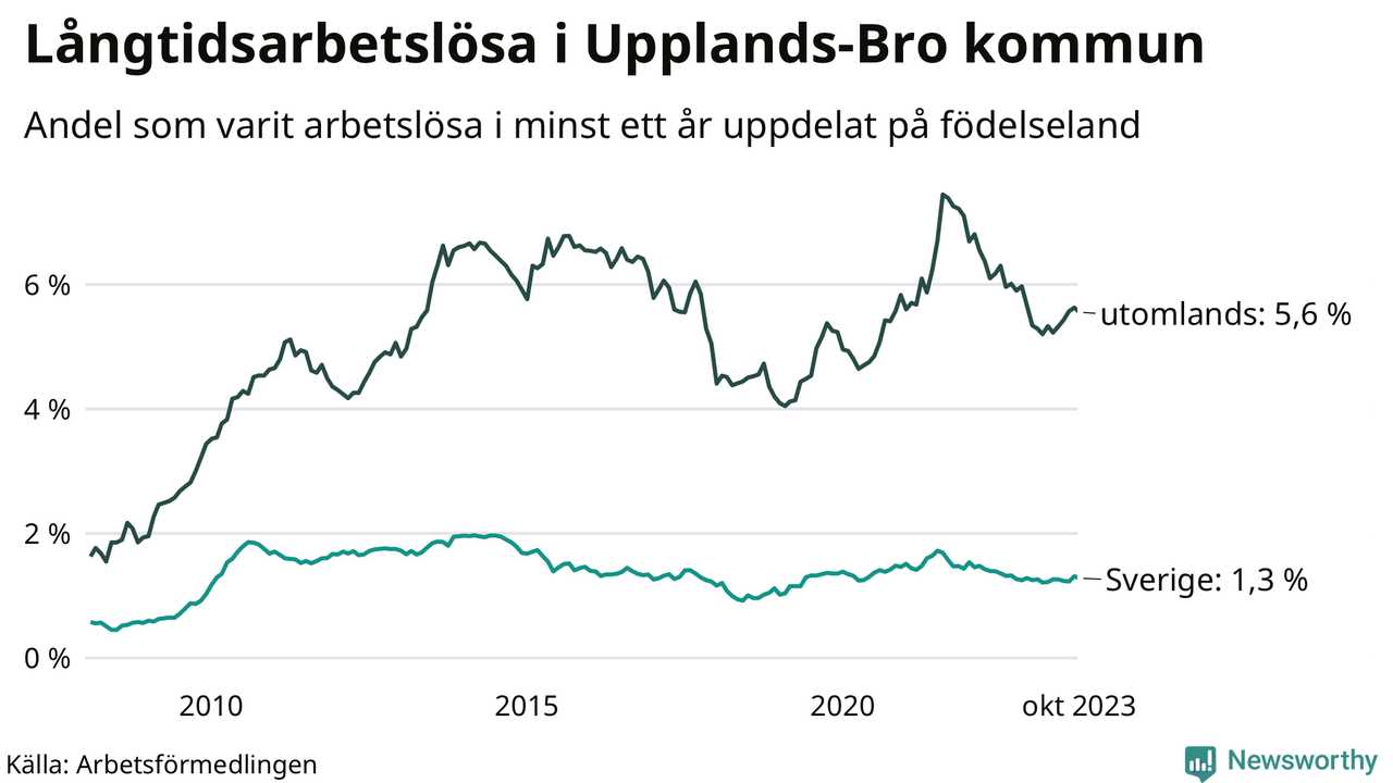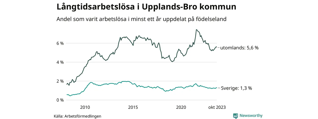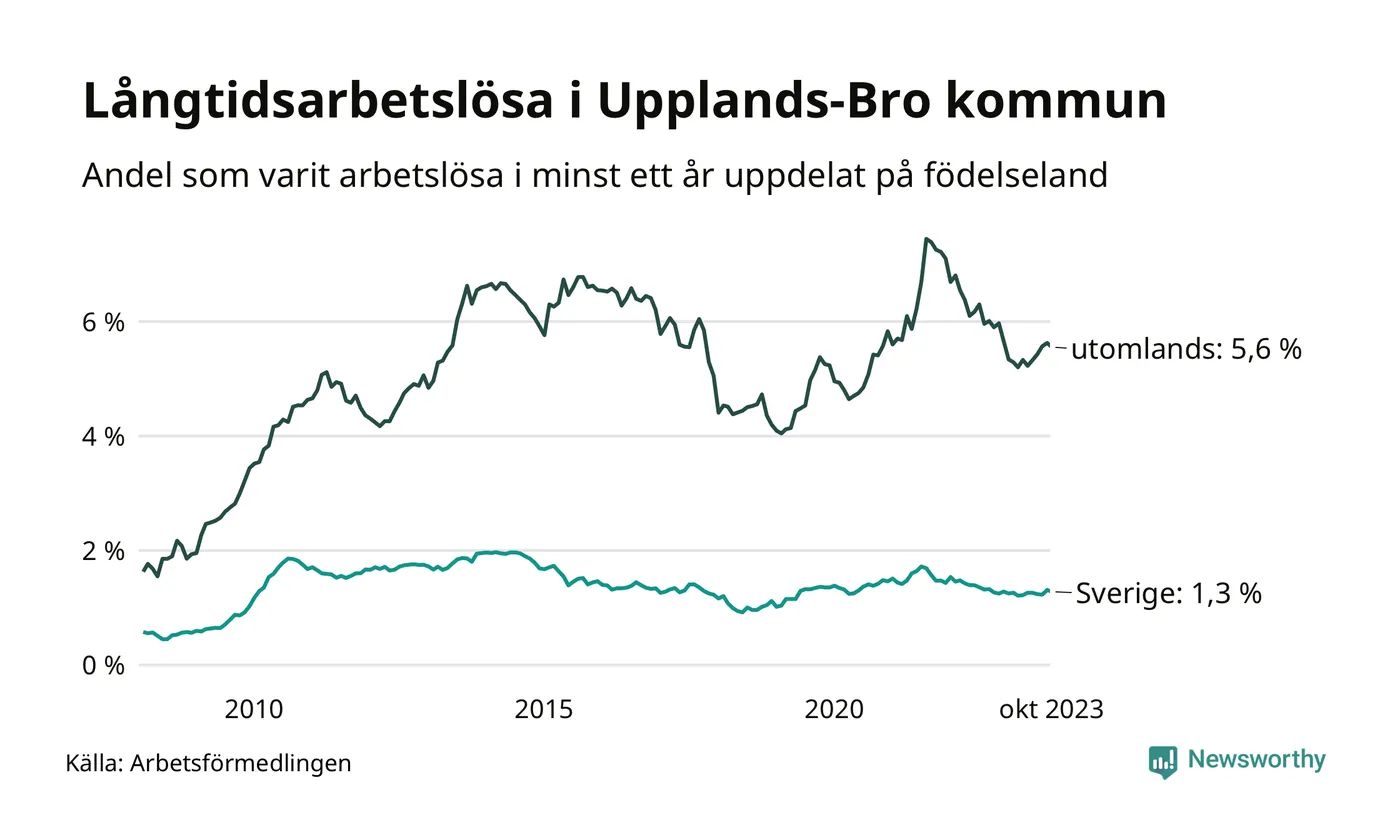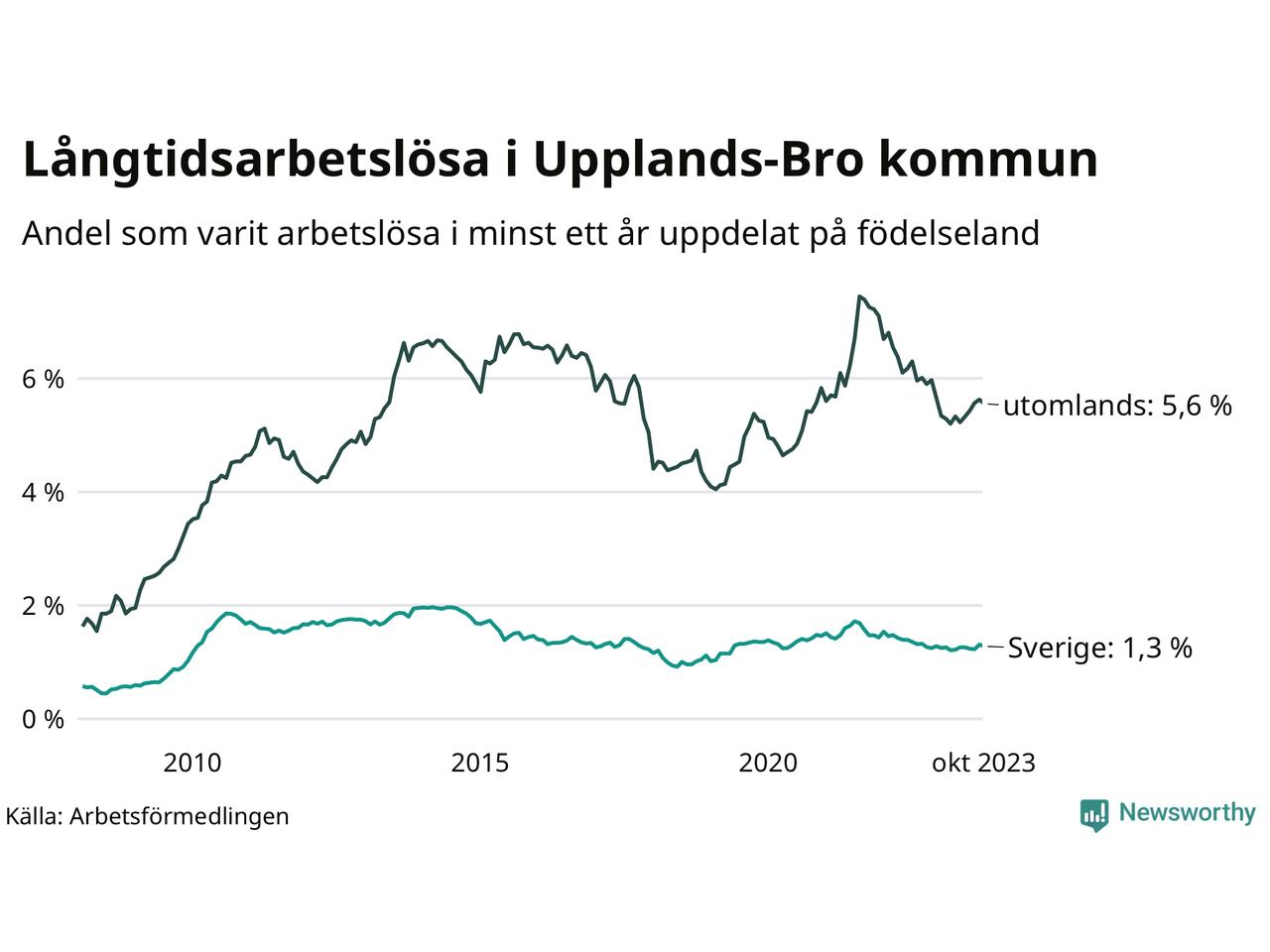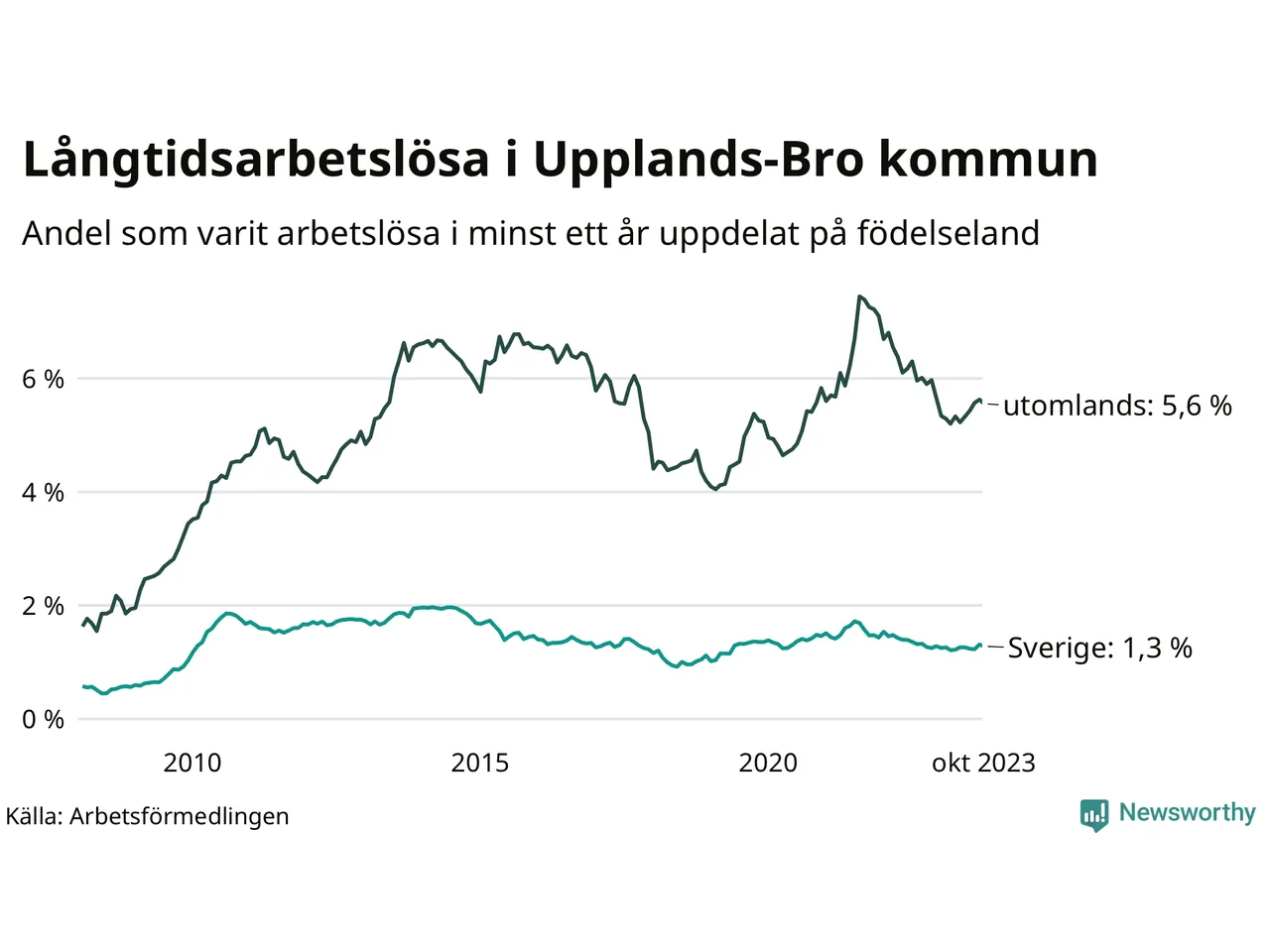 125 av de långtidsarbetslösa i Upplands-Bro är födda i Sverige, medan 354 är födda utomlands. Det innebär att långtidsarbetslösheten bland Sverigefödda är 1,3 procent, medan den är fyra gånger så hög – 5,6 procent – bland födda utomlands. Även i riket som helhet är arbetslösheten högre bland utrikesfödda.