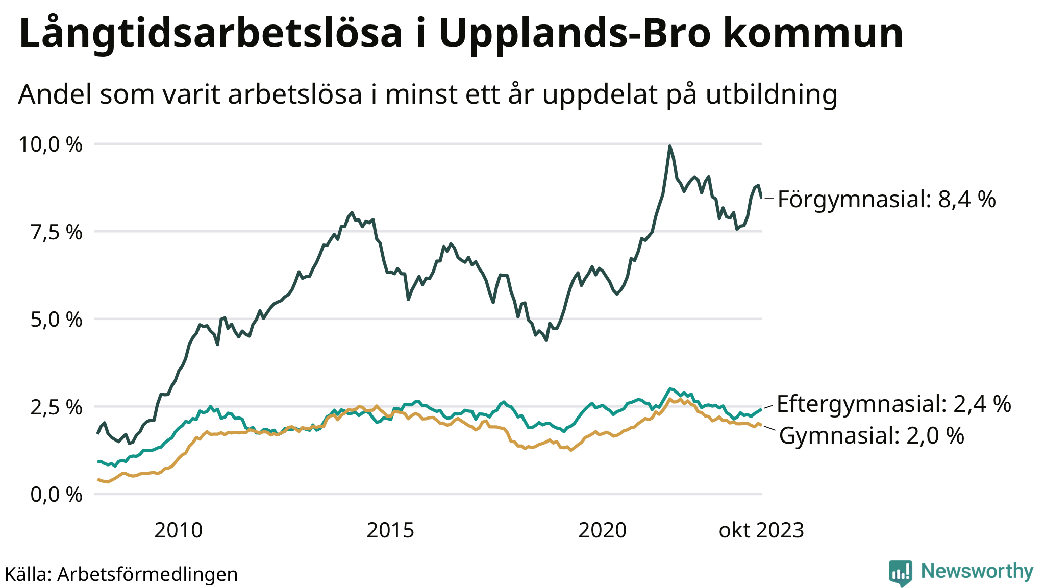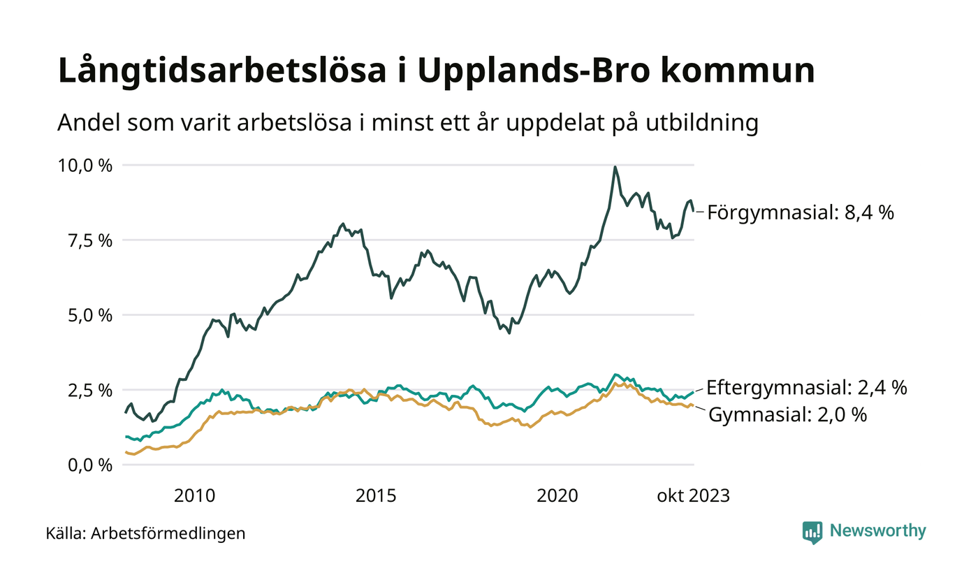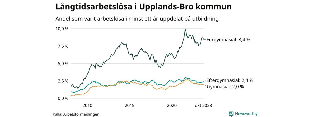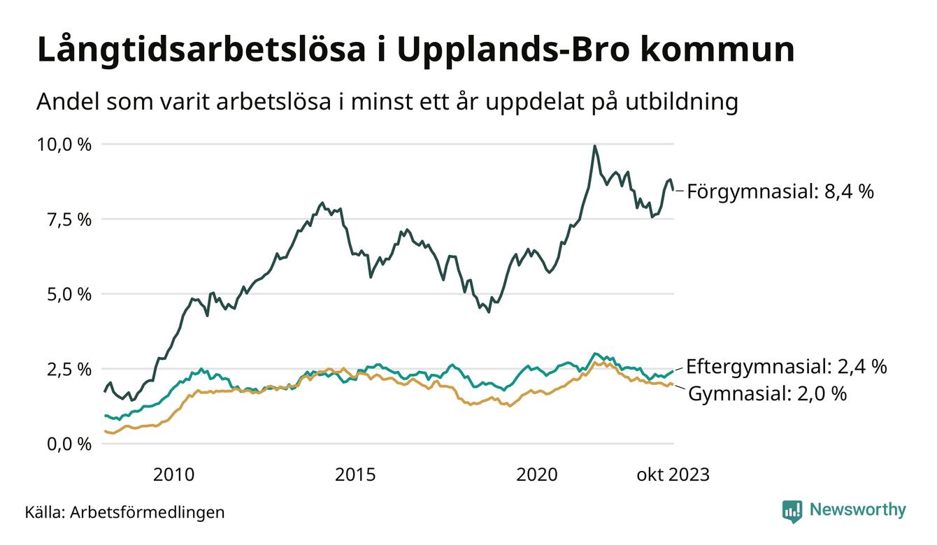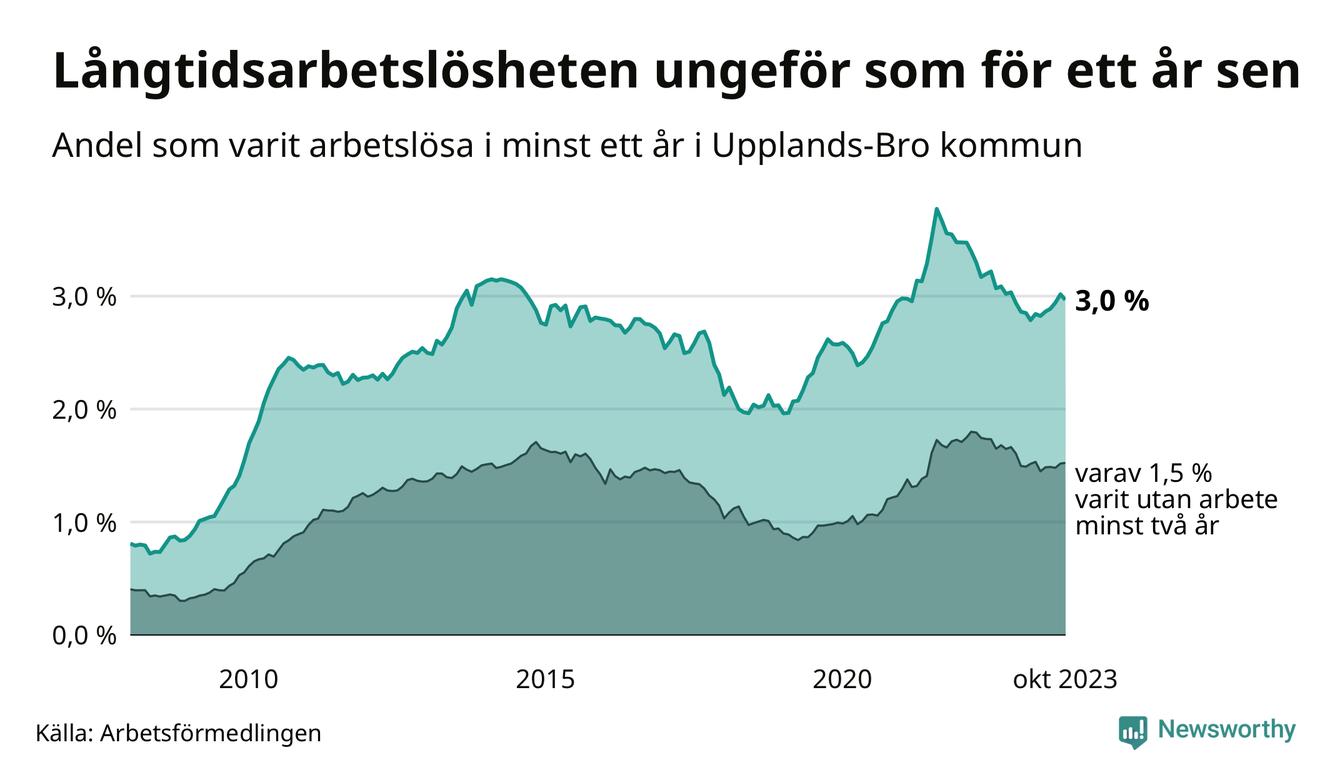 I oktober hade 479 Upplands-Brobor varit arbetslösa i minst ett år, vilket är åtta färre än månaden innan. Det är den första månaden sedan maj som antalet arbetslösa minskar. 479 personer motsvarar 3,0 procent av arbetskraften i kommunen – andelen långtidsarbetslösa är ungefär på samma nivå som för ett år sedan.