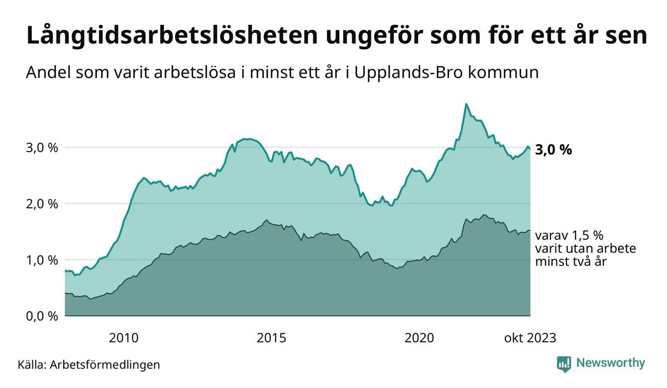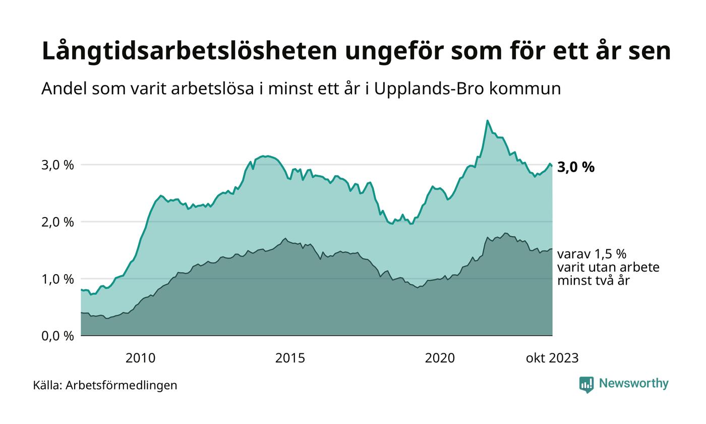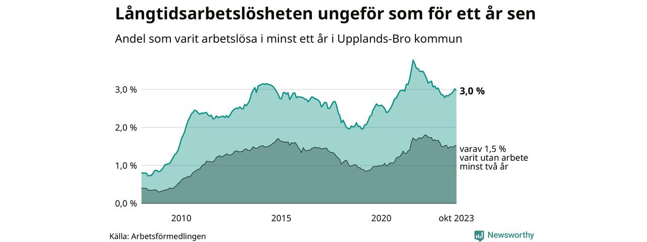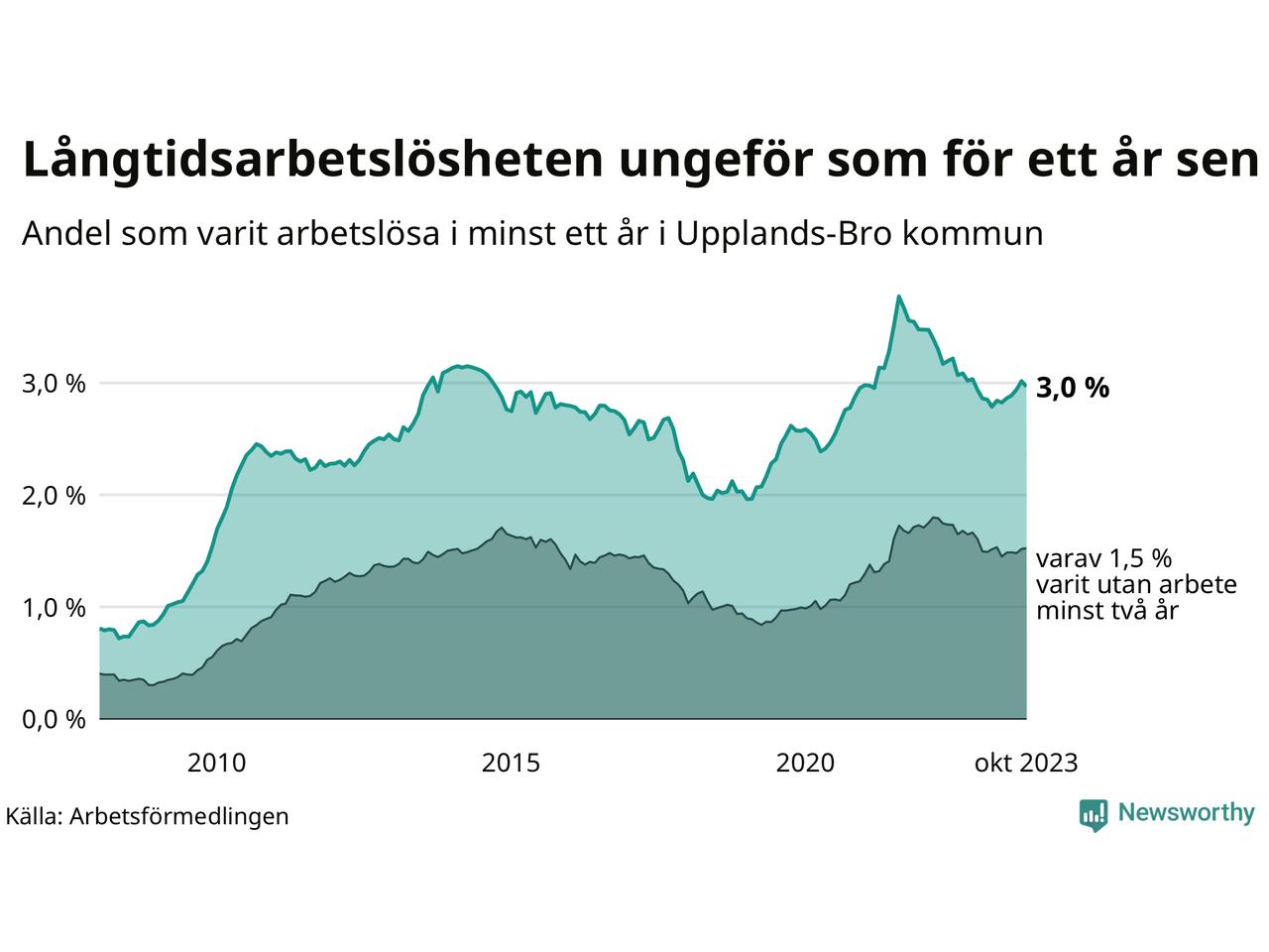 Andelen som varit utan arbete i minst ett år i Upplands-Bro var ungefär lika stor i oktober jämfört med samma månad för ett år sedan. Det visar Arbetsfömedlingens senaste månadsstatistik.