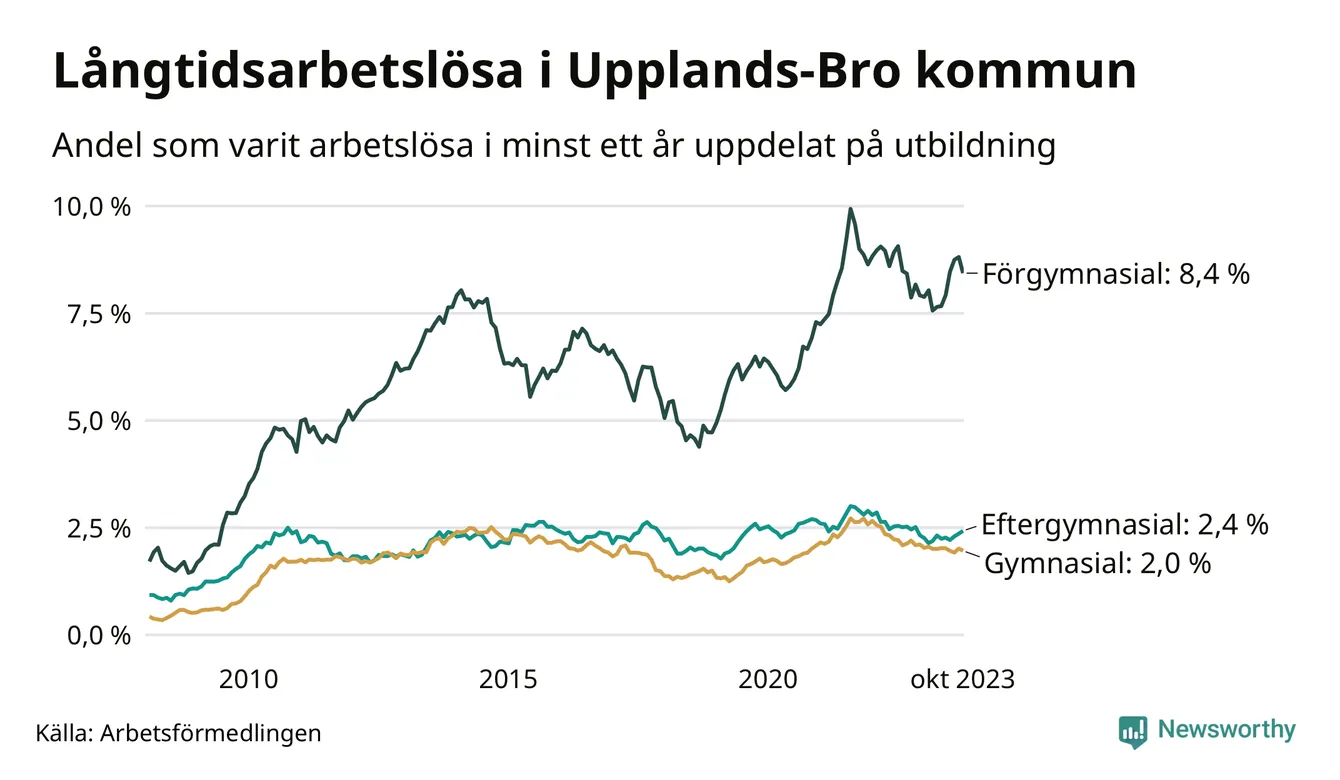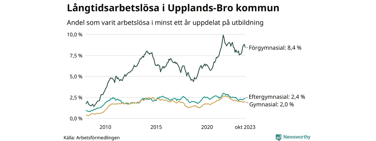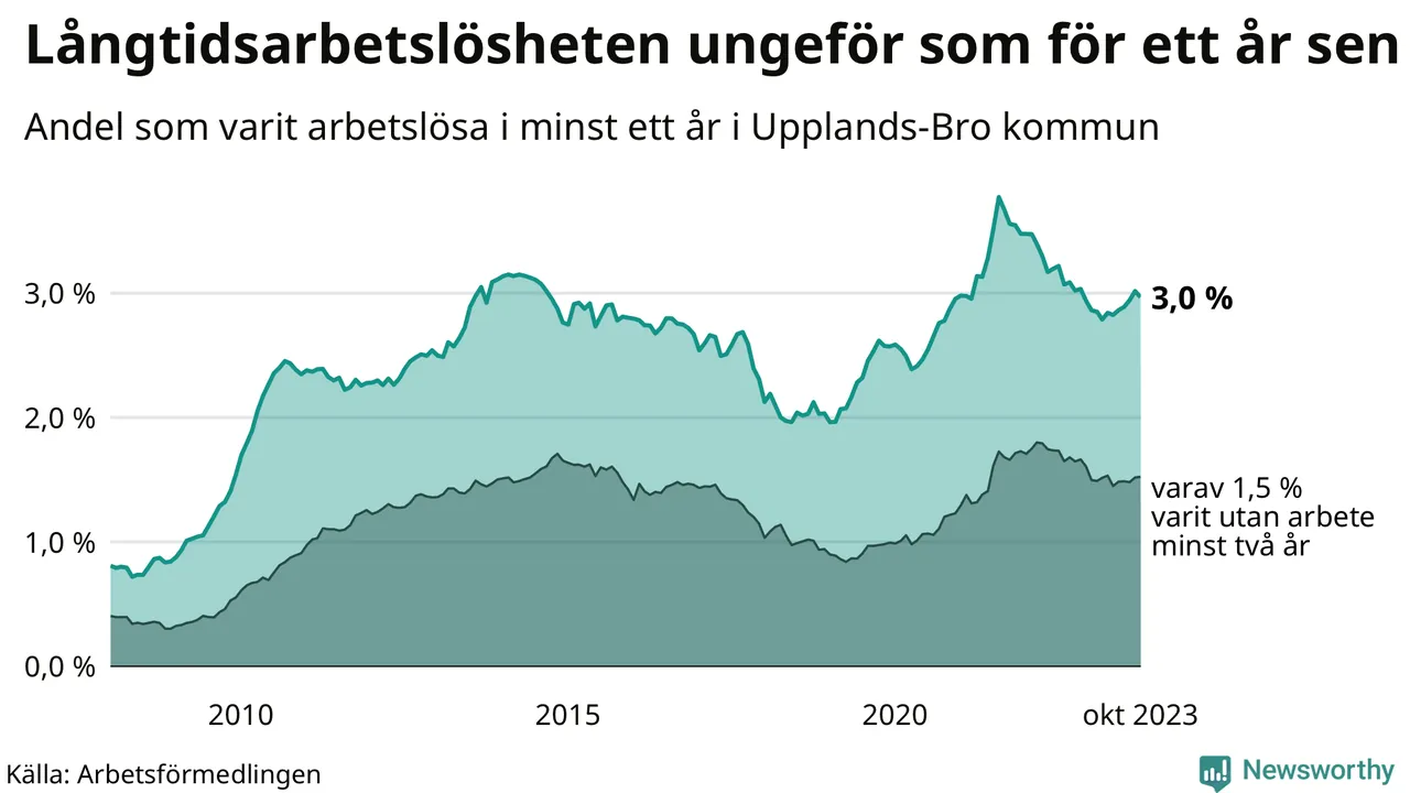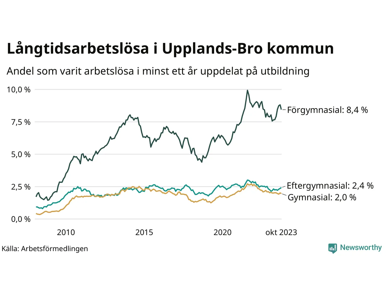 Andelen som varit utan arbete i minst ett år i Upplands-Bro var ungefär lika stor i oktober jämfört med samma månad för ett år sedan. Det visar Arbetsfömedlingens senaste månadsstatistik.