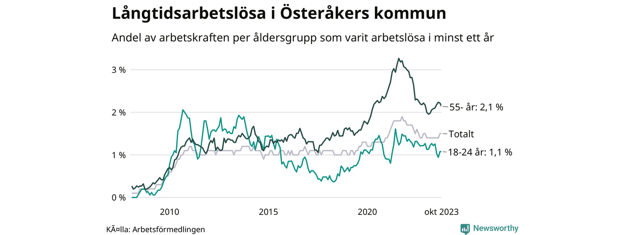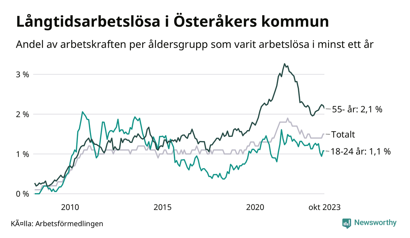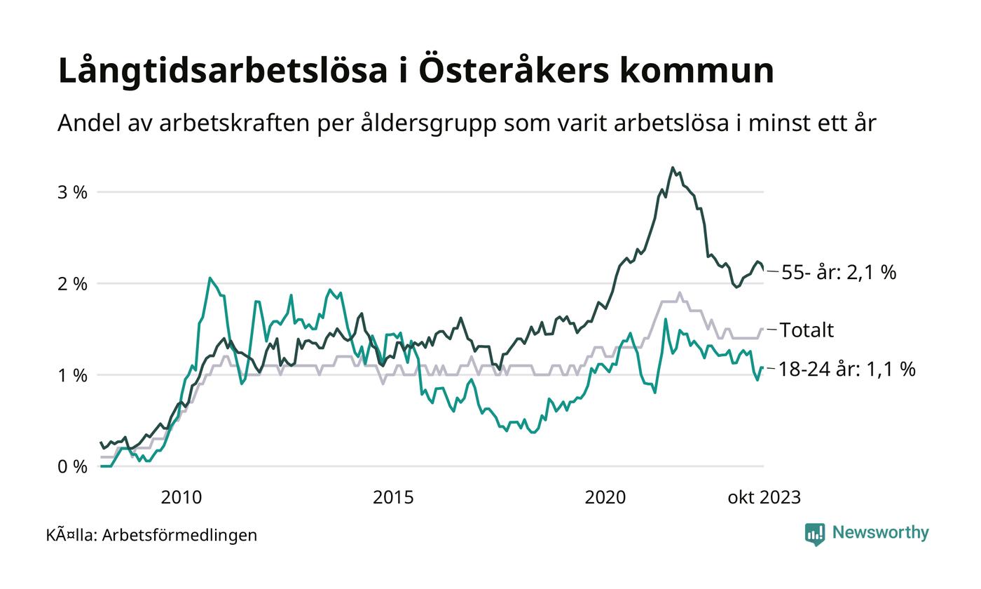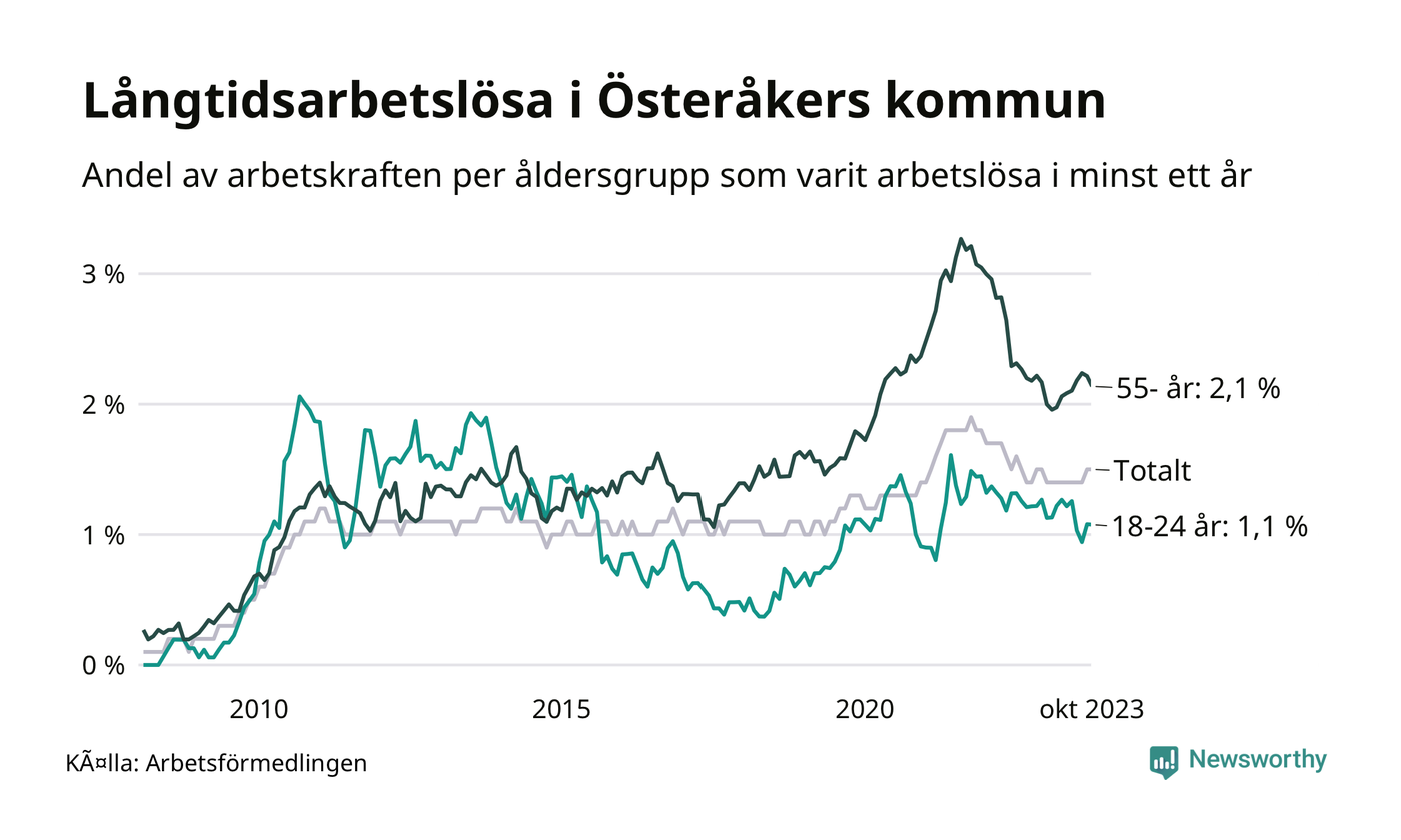 Av de 359 personerna som varit arbetslösa i mer än ett år i Österåkers kommun är 107 personer mellan 55 och 651 år och 24 är mellan 18 och 24 år. För den äldre gruppen är andelen arbetslösa 2,1 procent medan den i den yngre gruppen är 1,1 procent. Även i riket som helhet är långtidsarbetslösheten högre i gruppen äldre.