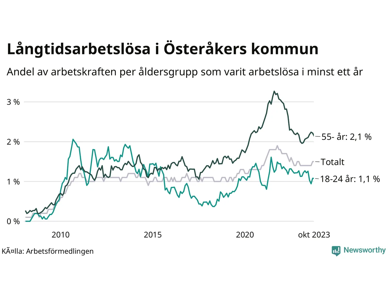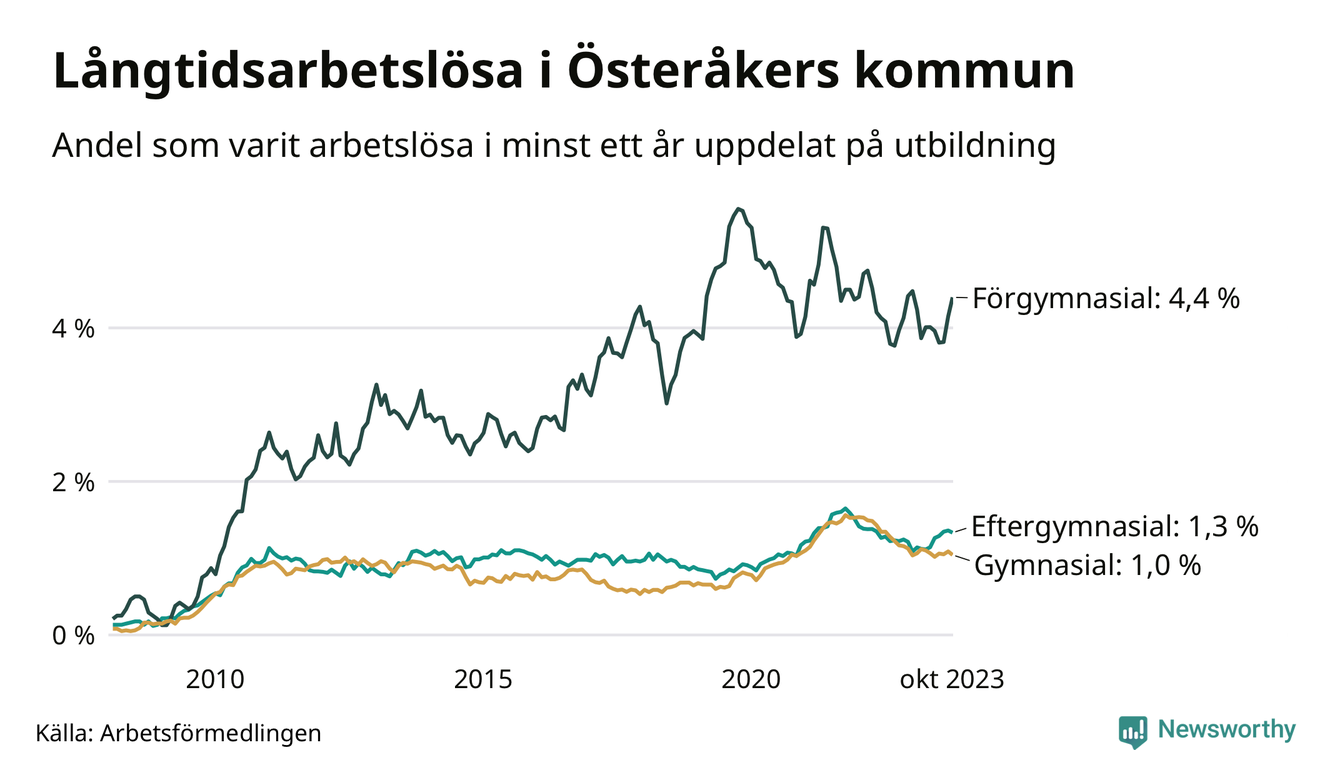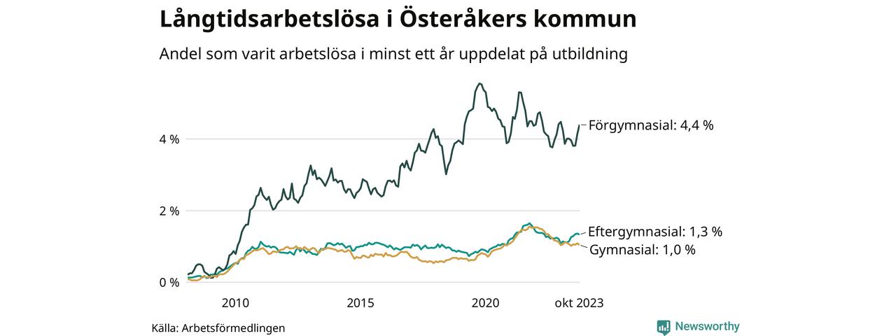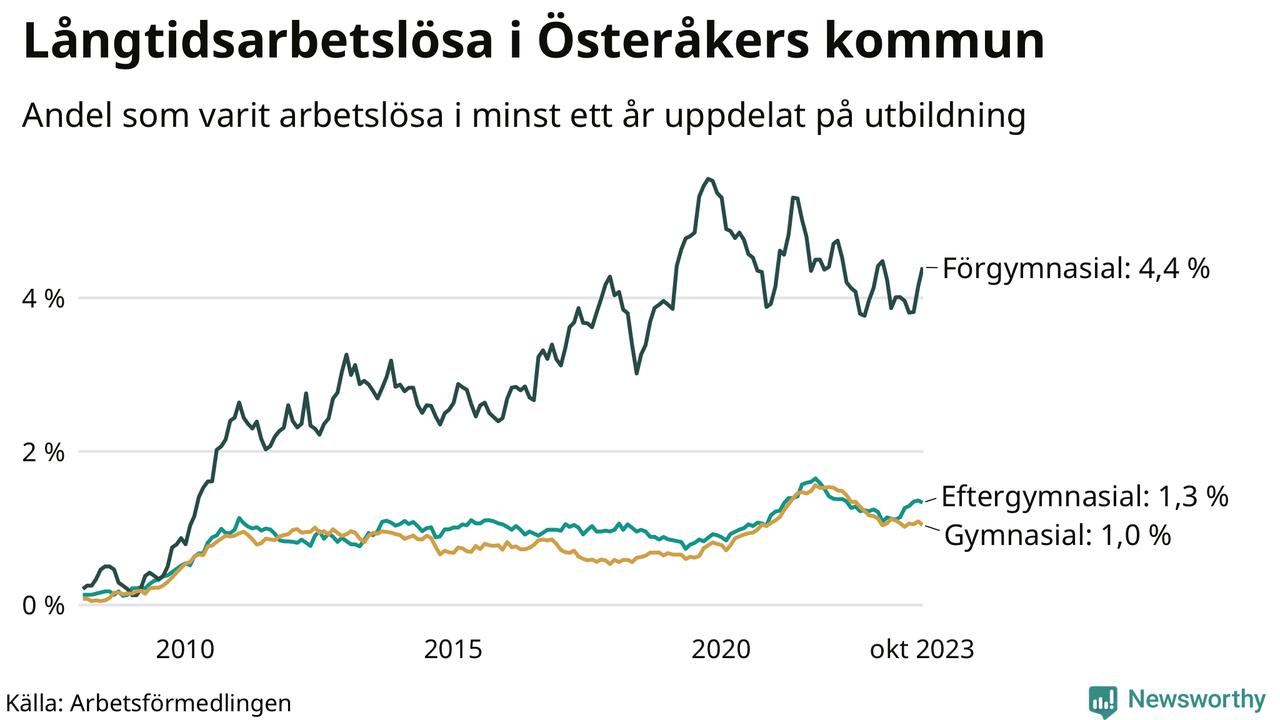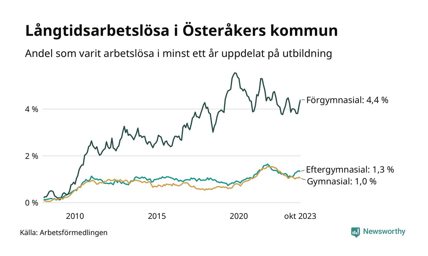 Av de 359 personerna som varit arbetslösa i mer än ett år i Österåkers kommun är 107 personer mellan 55 och 651 år och 24 är mellan 18 och 24 år. För den äldre gruppen är andelen arbetslösa 2,1 procent medan den i den yngre gruppen är 1,1 procent. Även i riket som helhet är långtidsarbetslösheten högre i gruppen äldre.