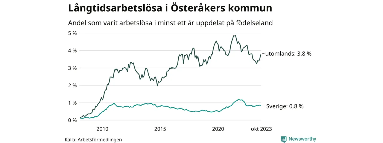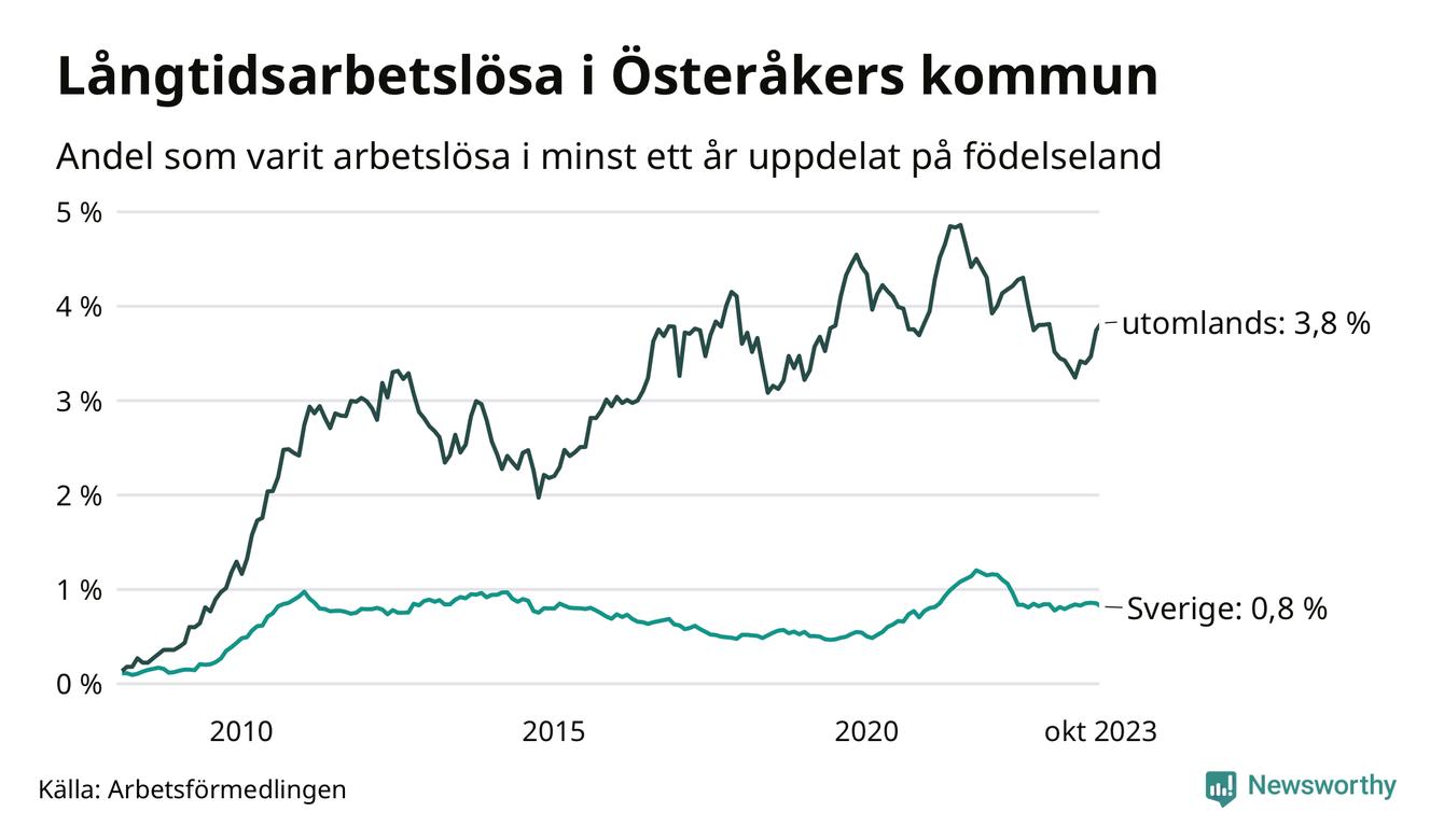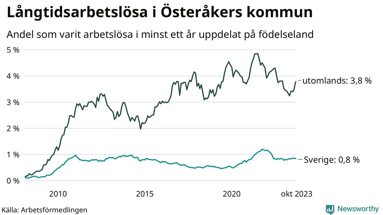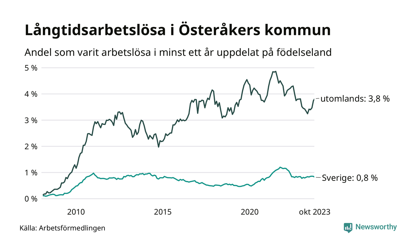 157 av de långtidsarbetslösa i Österåker är födda i Sverige, medan 202 är födda utomlands. Det innebär att långtidsarbetslösheten bland Sverigefödda är 0,8 procent, medan den är fem gånger så hög – 3,8 procent – bland födda utomlands. Även i riket som helhet är arbetslösheten högre bland utrikesfödda.
