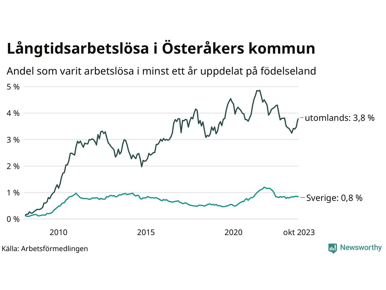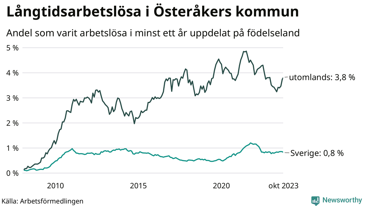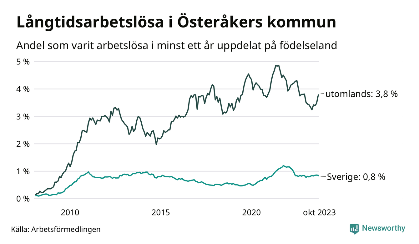 157 av de långtidsarbetslösa i Österåker är födda i Sverige, medan 202 är födda utomlands. Det innebär att långtidsarbetslösheten bland Sverigefödda är 0,8 procent, medan den är fem gånger så hög – 3,8 procent – bland födda utomlands. Även i riket som helhet är arbetslösheten högre bland utrikesfödda.