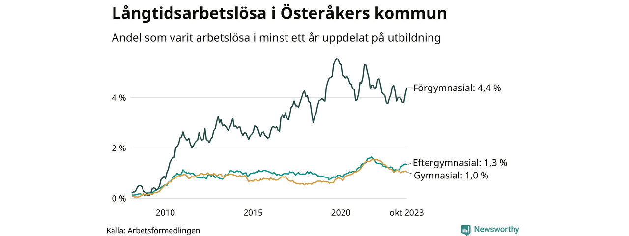 Även när det gäller utbildningsnivå är skillnaderna stora. 102 av de som varit arbetslösa i minst ett år har inte någon gymnasieutbildning, vilket motsvarar en långtidsarbetslöhet på 4,4 procent i den gruppen. Det kan jämföras med 1,0 procent bland dem som gått ut gymnasiet och 1,3 procent bland dem som studerat vidare efter gymnasiet.