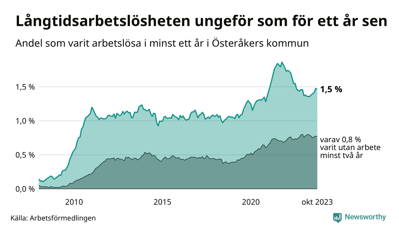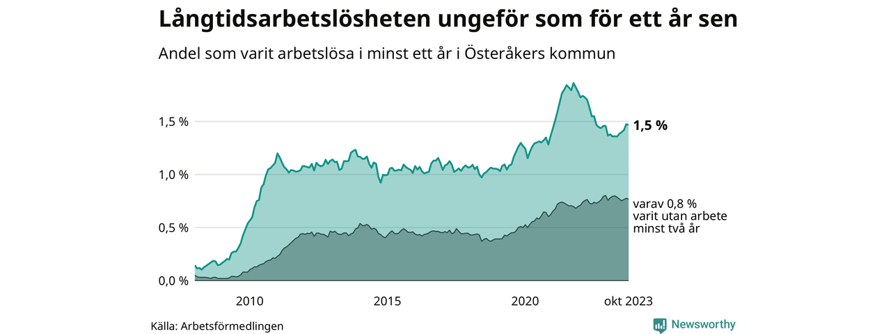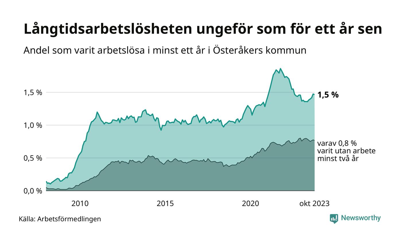 I oktober hade 359 Österåkersbor varit arbetslösa i minst ett år, vilket är två färre än månaden innan. Det är den första månaden sedan maj som antalet arbetslösa minskar. 359 personer motsvarar 1,5 procent av arbetskraften i kommunen – andelen långtidsarbetslösa är ungefär på samma nivå som för ett år sedan.
