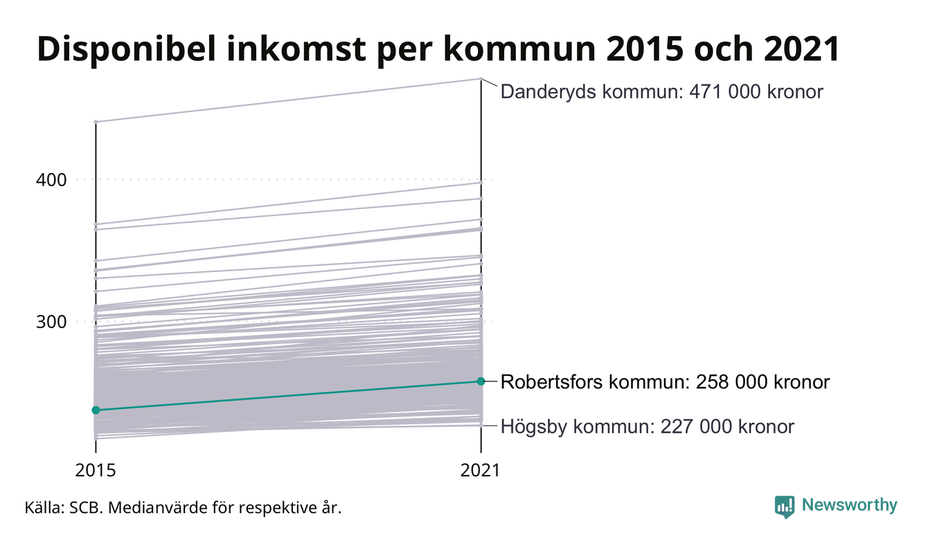 I Robertsfors södra omland var medianinkomsten 278 600 kronor, i Robertsfors 235 800.