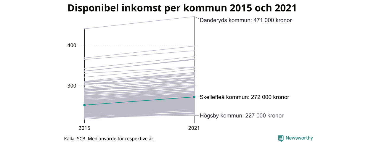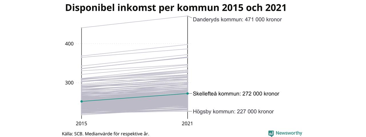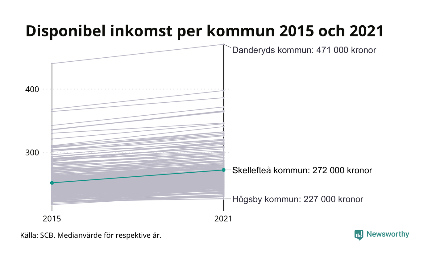 Medianinkomsten i Skellefteå som helhet var 272 000 kronor 2021, vilket är den högsta i Västerbottens län. Sedan 2015 har den disponibla inkomsten i kommunen ökat med 8 procent.