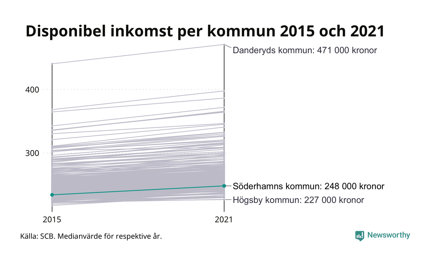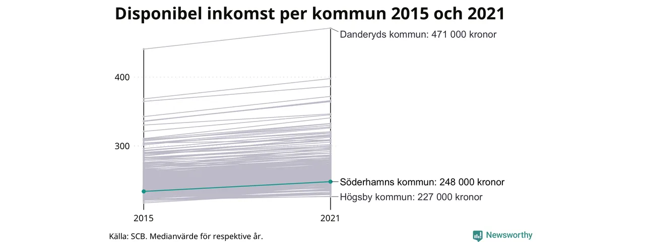Medianinkomsten i Söderhamn som helhet var 248 000 kronor 2021, vilket är lägre än de flesta andra kommuner. Sedan 2015 har den disponibla inkomsten i kommunen ökat med 6 procent.