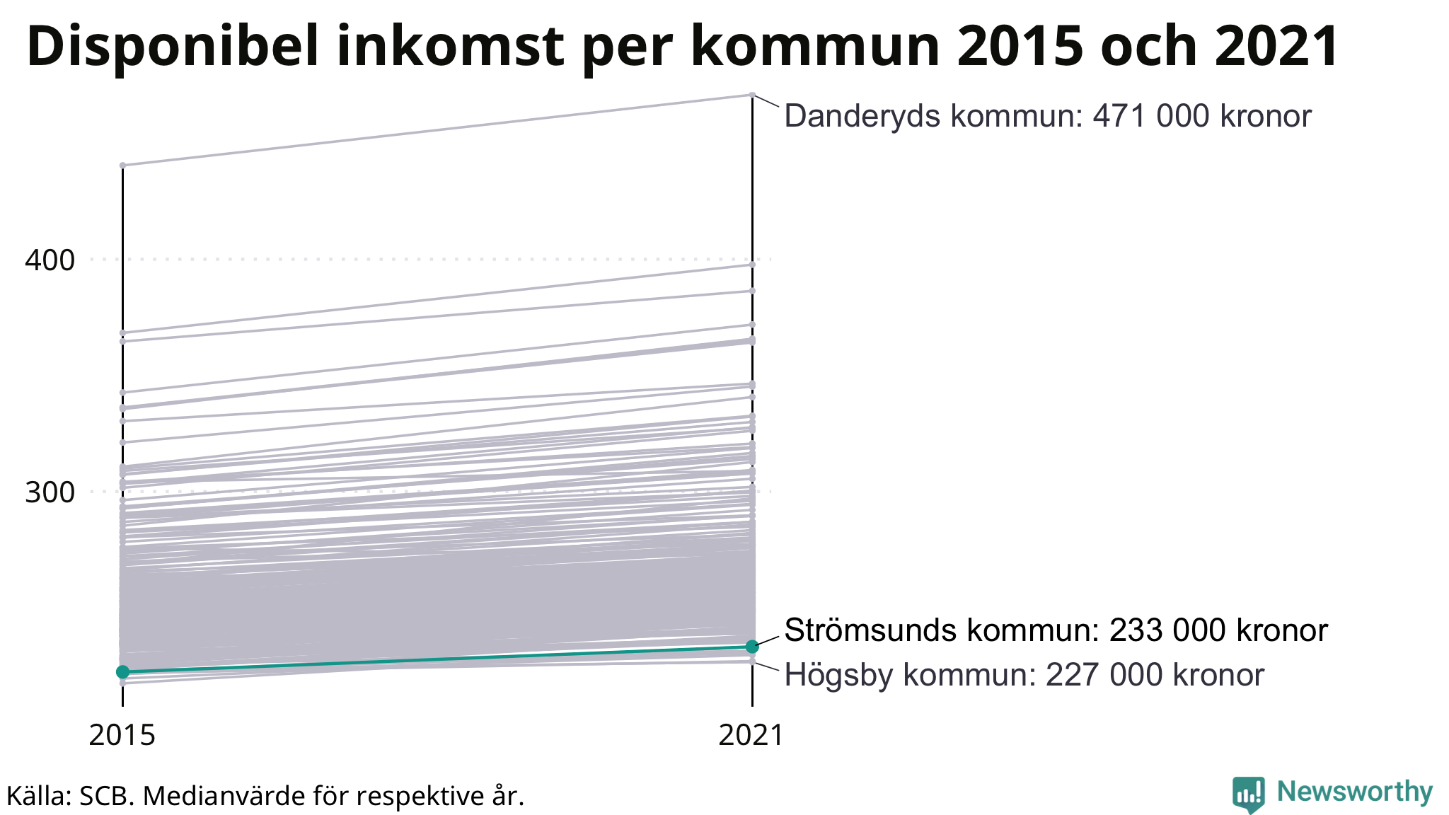 Medianinkomsten i Strömsund som helhet var 233 000 kronor 2021, vilket är den lägsta i Jämtlands län. Sedan 2015 har den disponibla inkomsten i kommunen ökat med 5 procent.