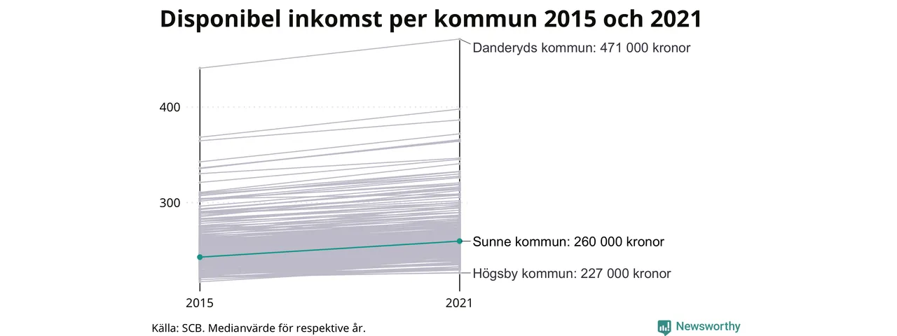 Medianinkomsten i Sunne som helhet var 260 000 kronor 2021, vilket är strax under rikssnittet. Sedan 2015 har den disponibla inkomsten i kommunen ökat med 7 procent.