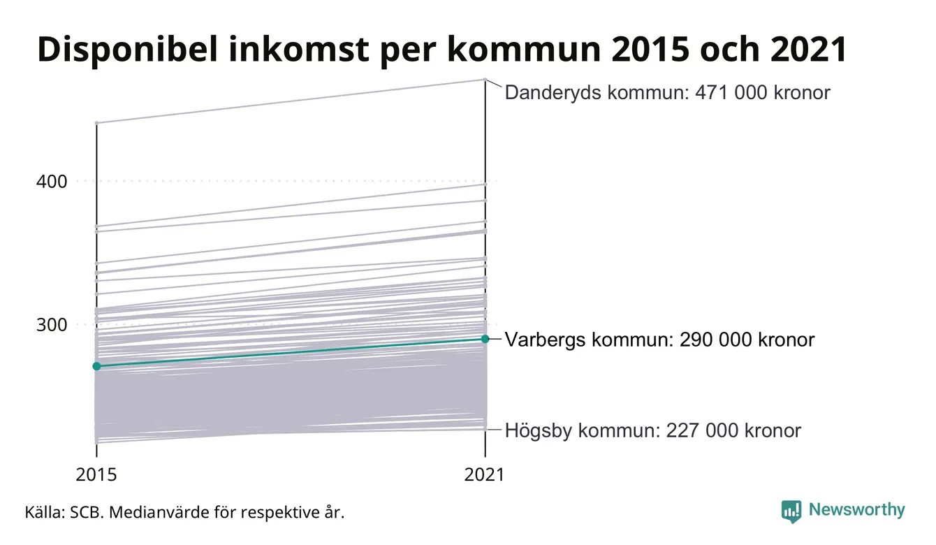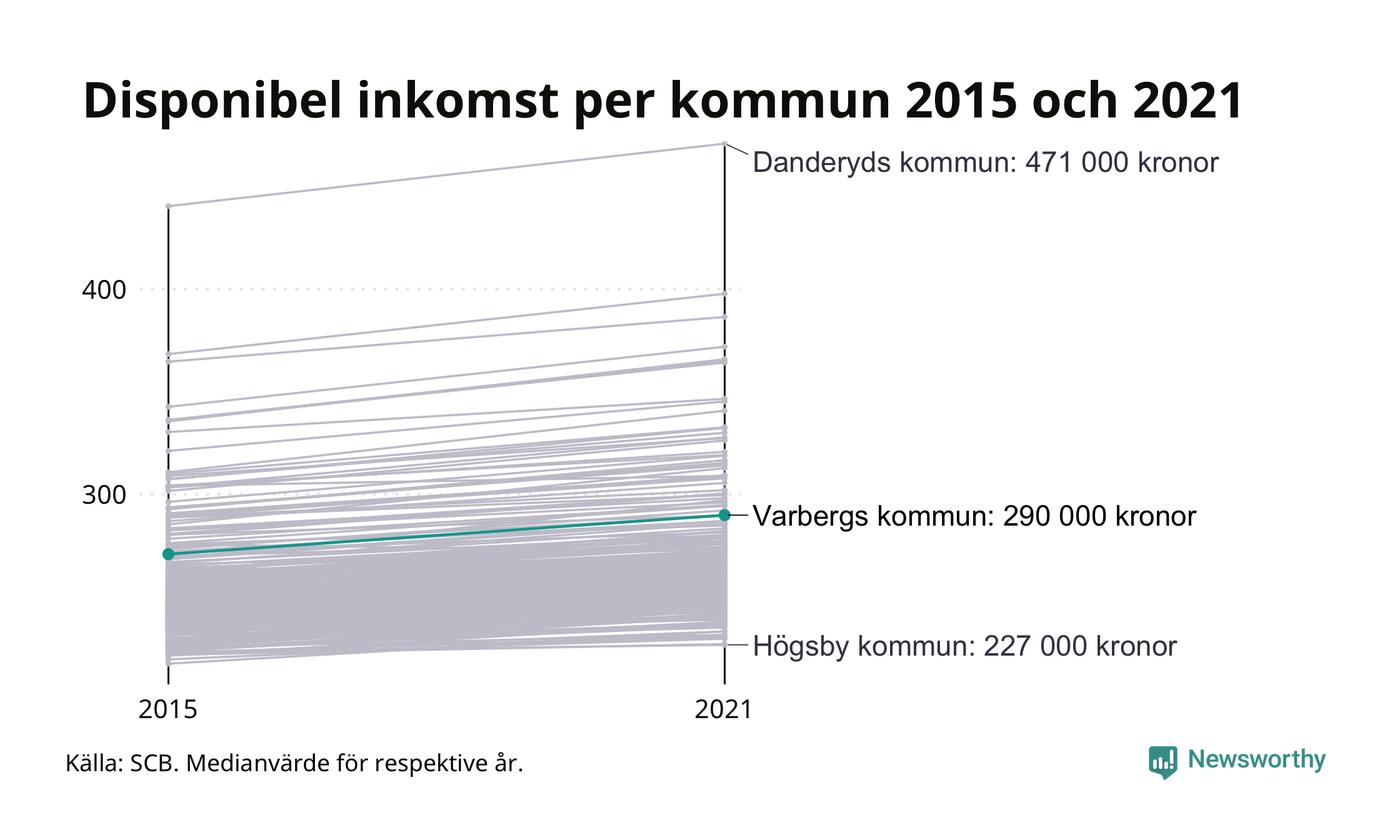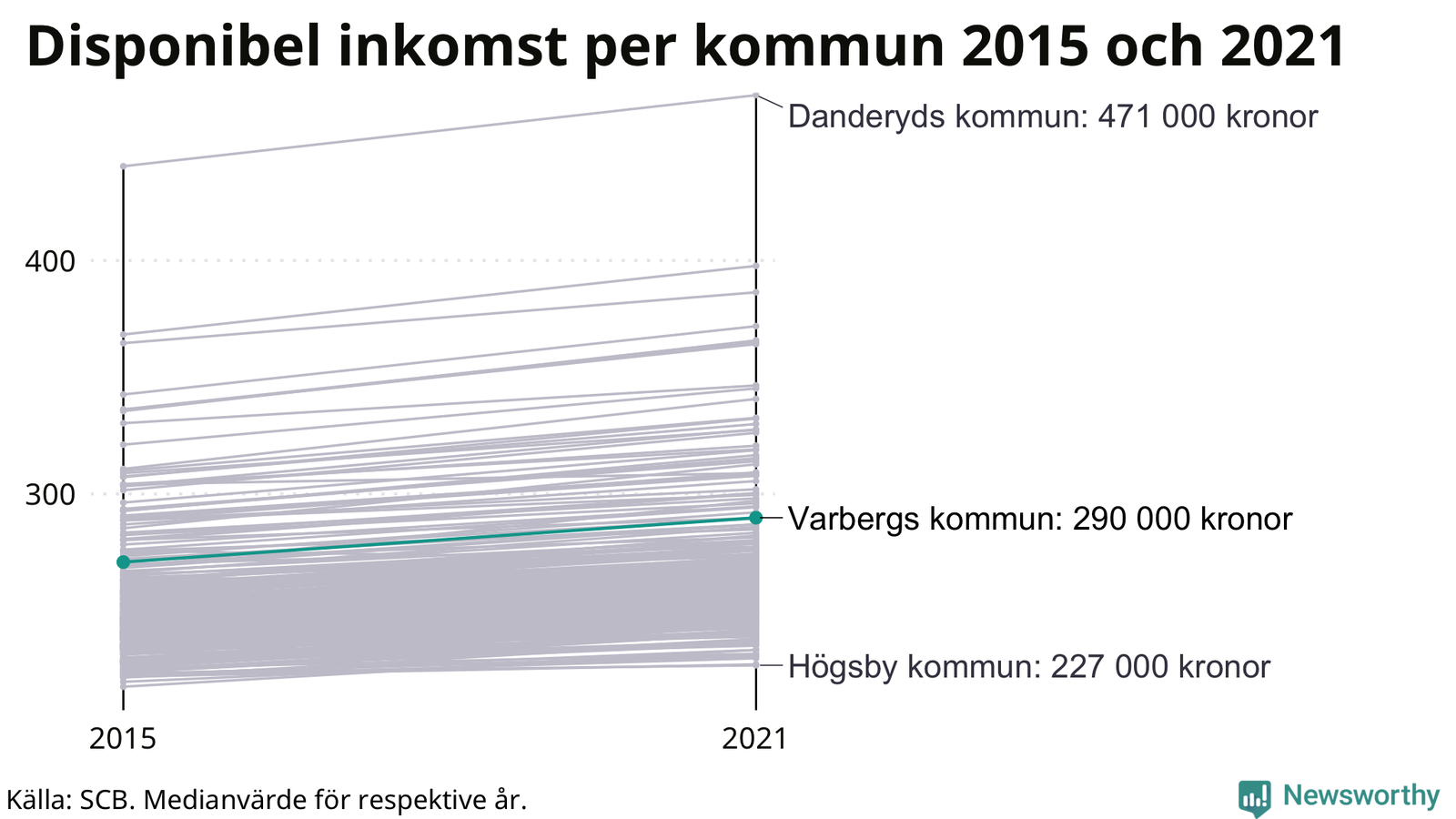 I Varbergs kommun var den disponibla inkomsten högst i Södra Näs-Träslövsläge-Gamla Köpstad, 348 000 kronor 2021. Det kan jämföras med Sörse, där medianinkomsten var 226 000 kronor. Skillnaden mellan området med högst respektive lägst inkomst har ökat något över tid, precis som i riket i stort. 2015 skiljde drygt 110 000 kronor, 2021 var gapet över 120 000 kronor.