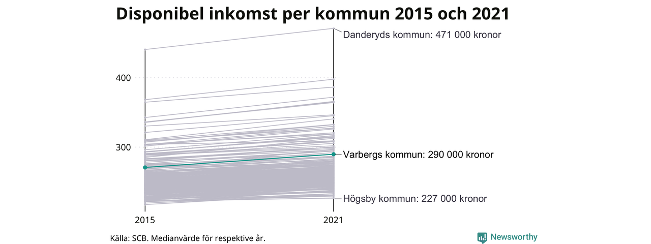 Medianinkomsten i Varberg som helhet var 290 000 kronor 2021, vilket är den näst högsta i Hallands län. Sedan 2015 har den disponibla inkomsten i kommunen ökat med 7 procent.