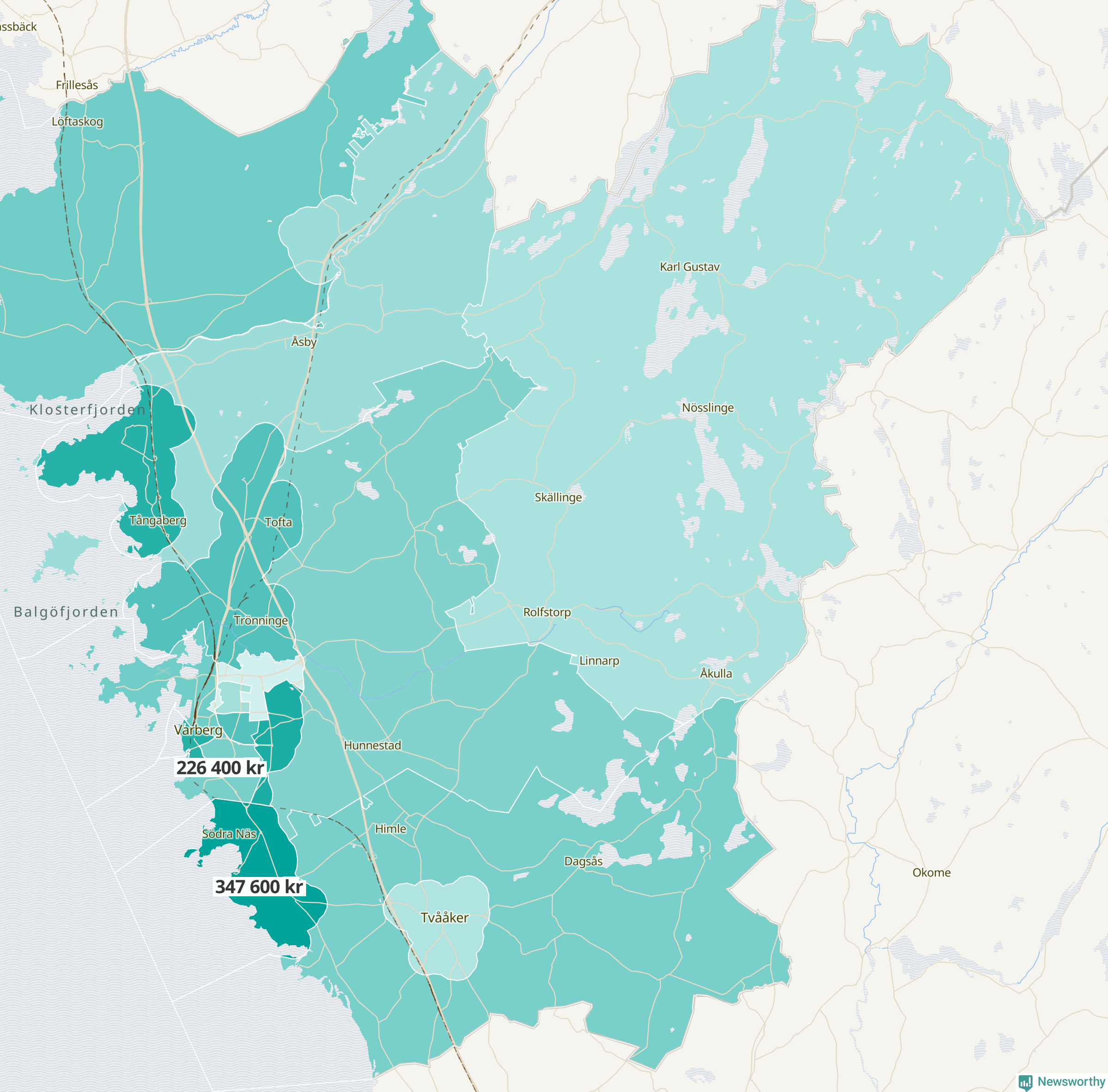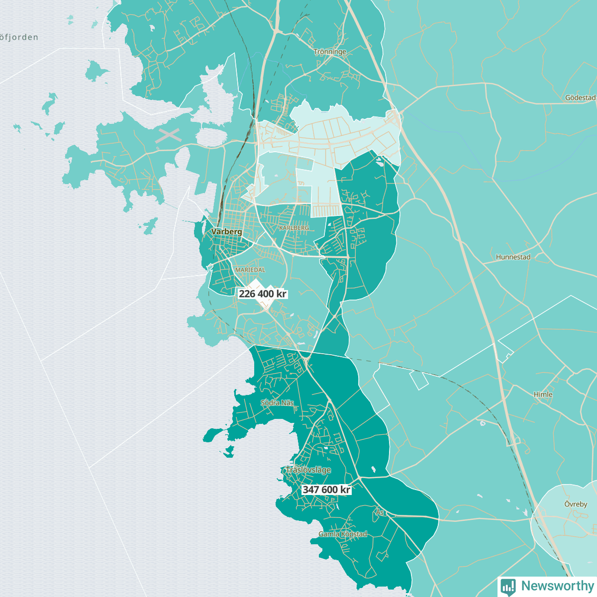 Det skiljer drygt 120 000 kronor mellan områdena med högst respektive lägst inkomst i Varberg.