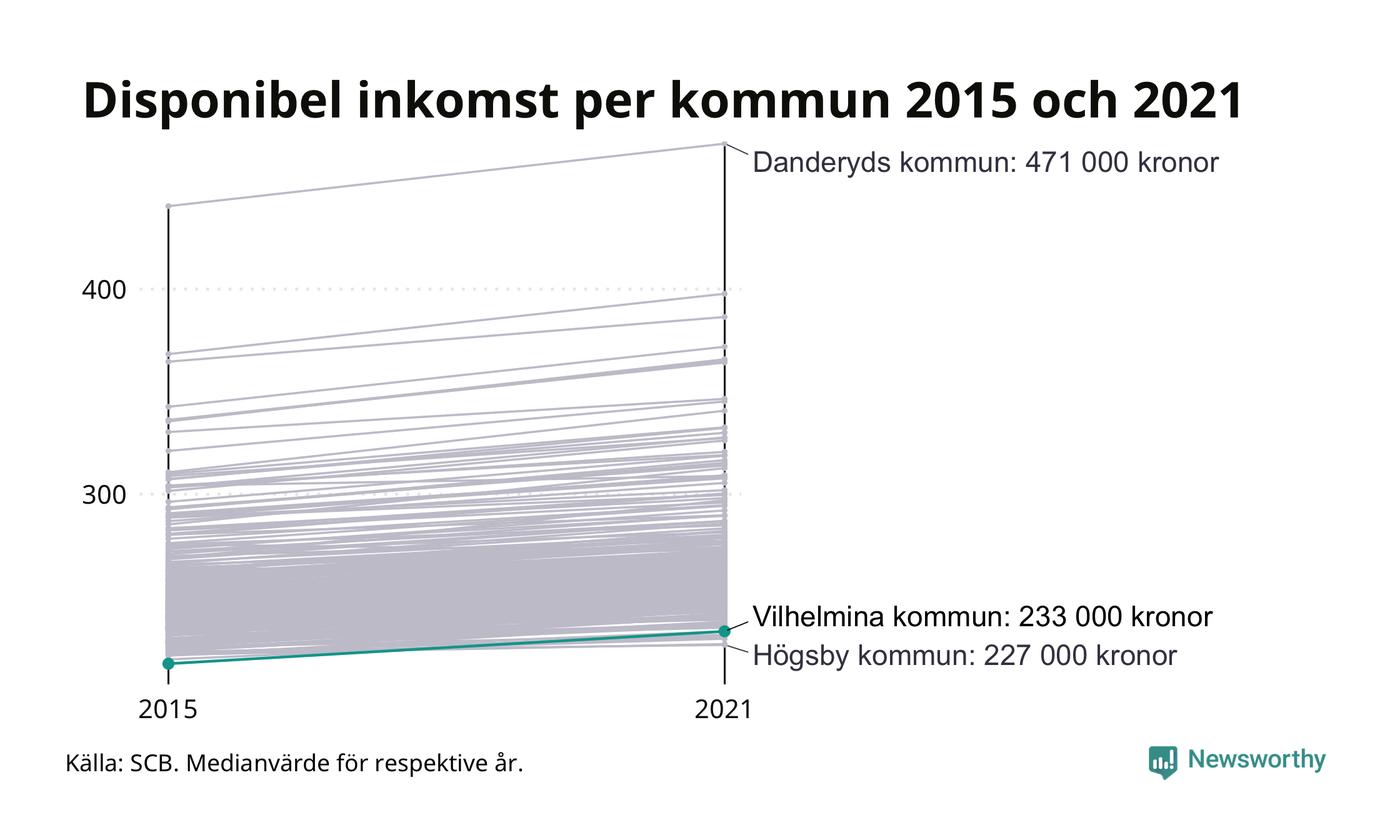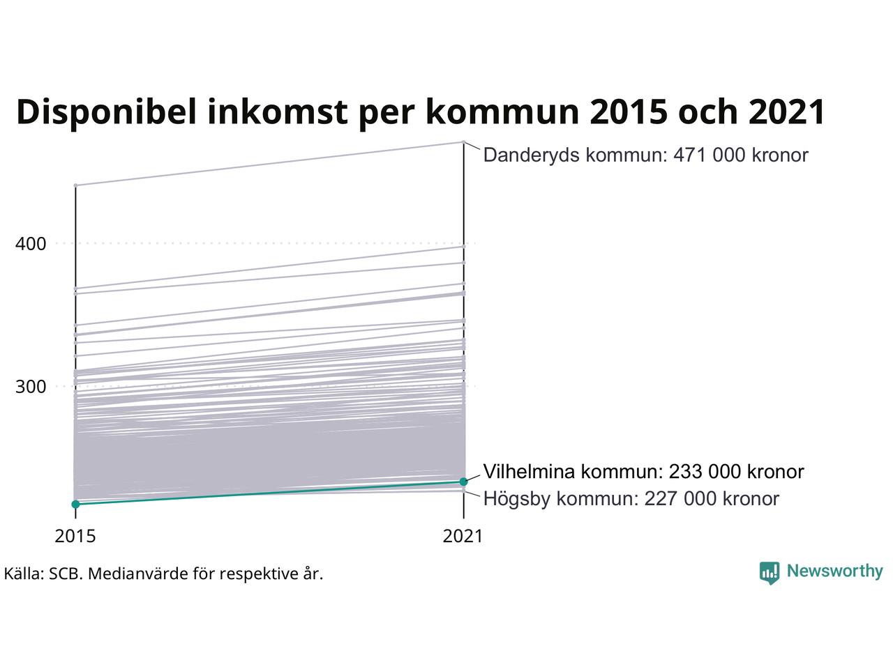 Medianinkomsten i Vilhelmina som helhet var 233 000 kronor 2021, vilket är den näst lägsta i Västerbottens län. Sedan 2015 har den disponibla inkomsten i kommunen ökat med 7 procent.
