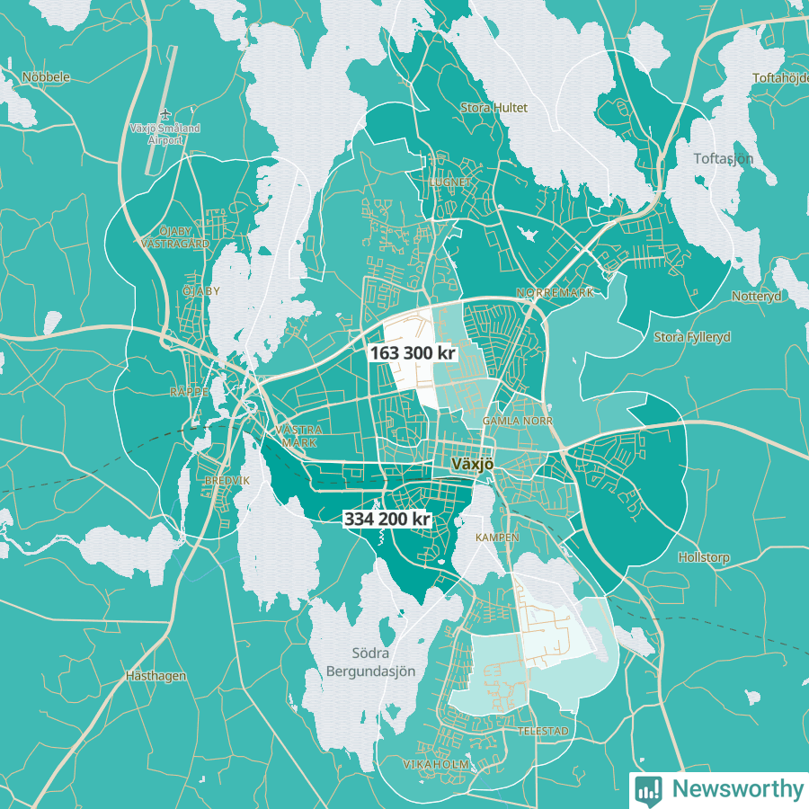 Det finns stora skillnader inom Växjö kommun. I området Söder-Bäckaslöv var den disponibla inkomsten 334 000 kronor 2021. Det är dubbelt så mycket som i Araby-Dalbo-Nydala, där medianinkomsten var 163 000 kronor. Skillnaden mellan området med högst respektive lägst inkomst har legat relativt stilla i Växjö jämfört med 2015.