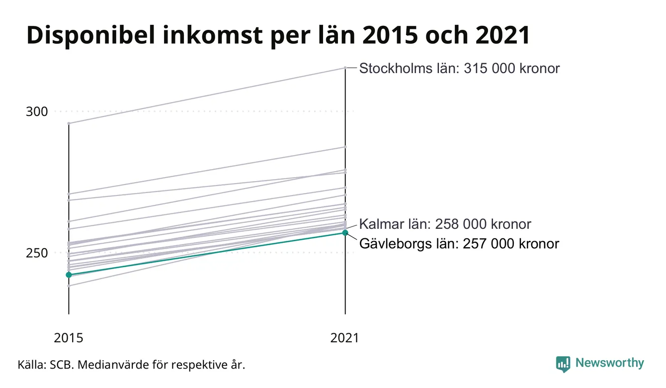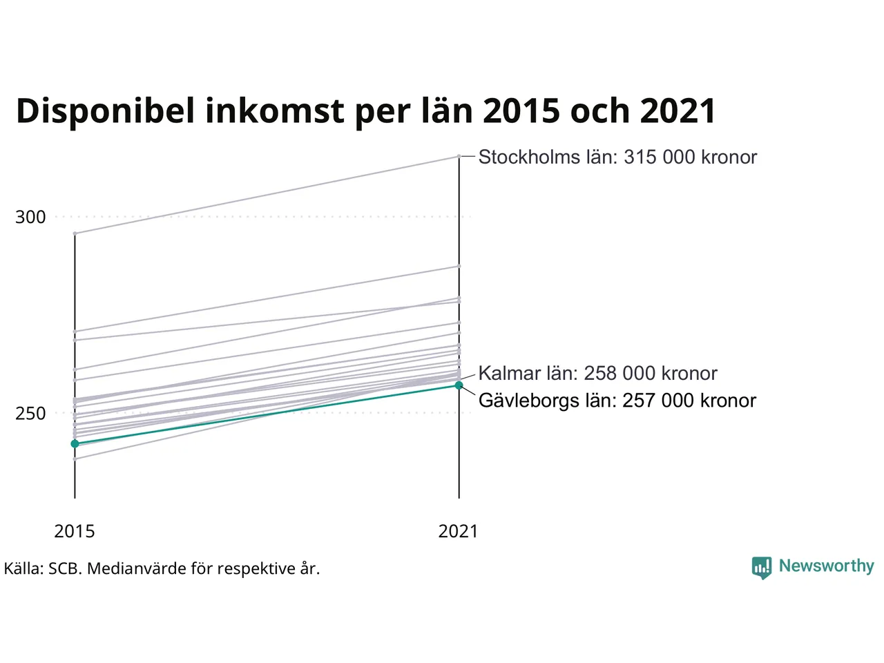 Medianinkomsten i Gävleborg som helhet var 257 000 kronor 2021, vilket är den lägsta i landet. Sedan 2015 har den disponibla inkomsten i länet ökat med 6 procent.