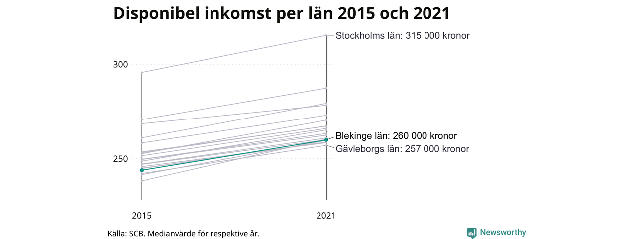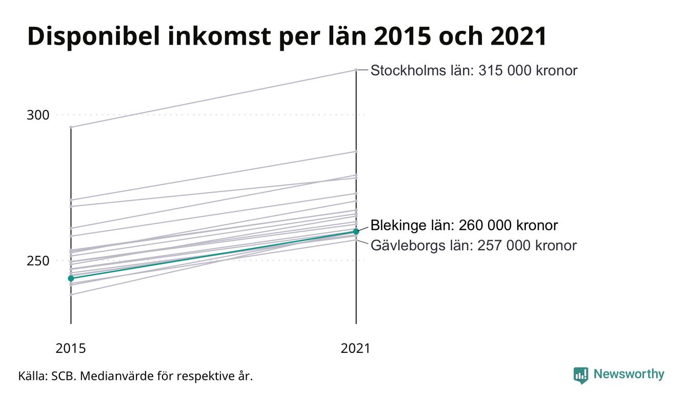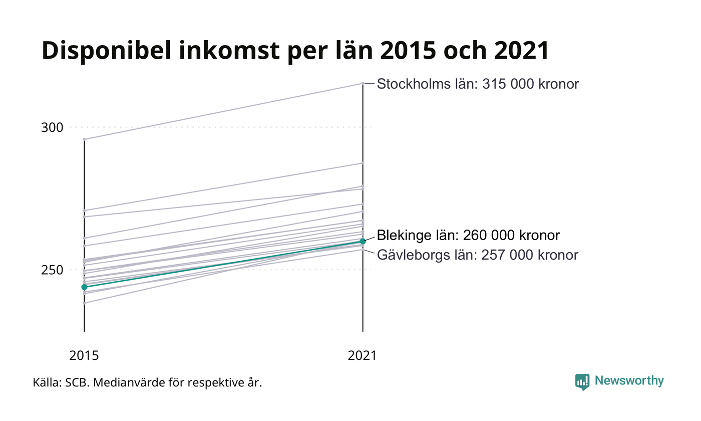 Medianinkomsten i Blekinge som helhet var 260 000 kronor 2021, vilket är strax under rikssnittet. Sedan 2015 har den disponibla inkomsten i länet ökat med 7 procent.