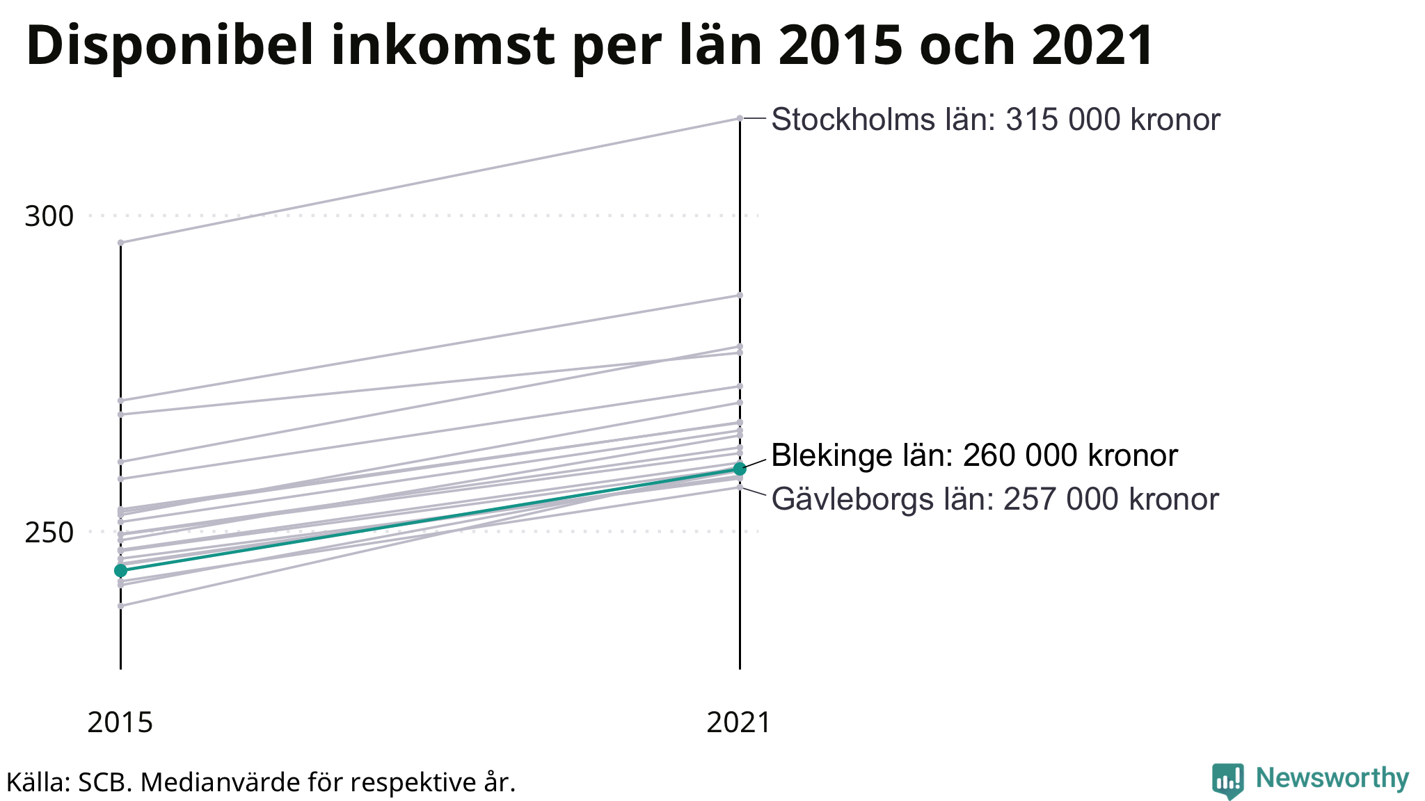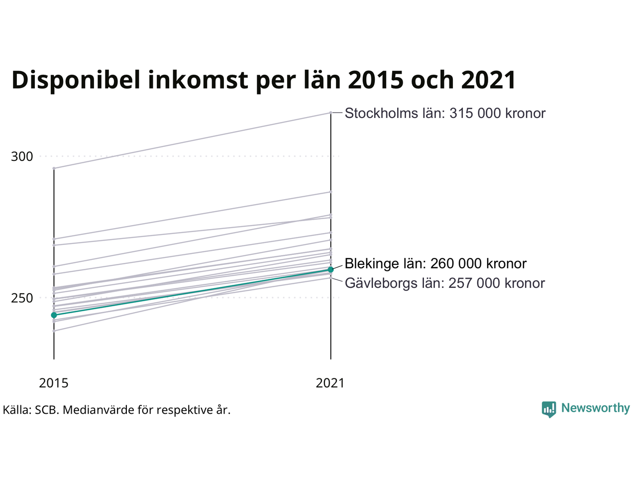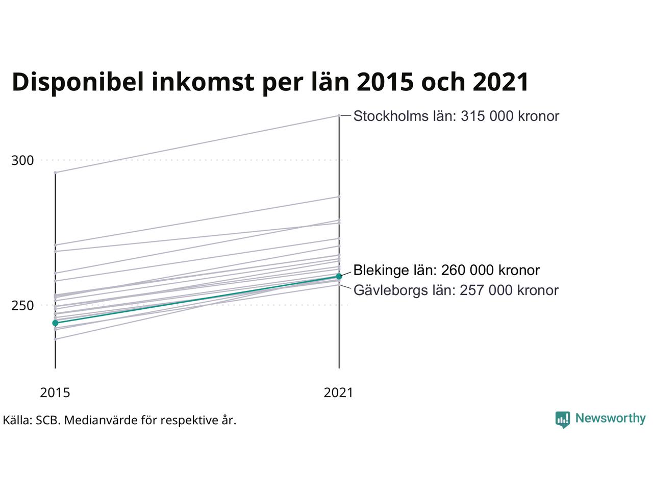 Medianinkomsten i Blekinge som helhet var 260 000 kronor 2021, vilket är strax under rikssnittet. Sedan 2015 har den disponibla inkomsten i länet ökat med 7 procent.