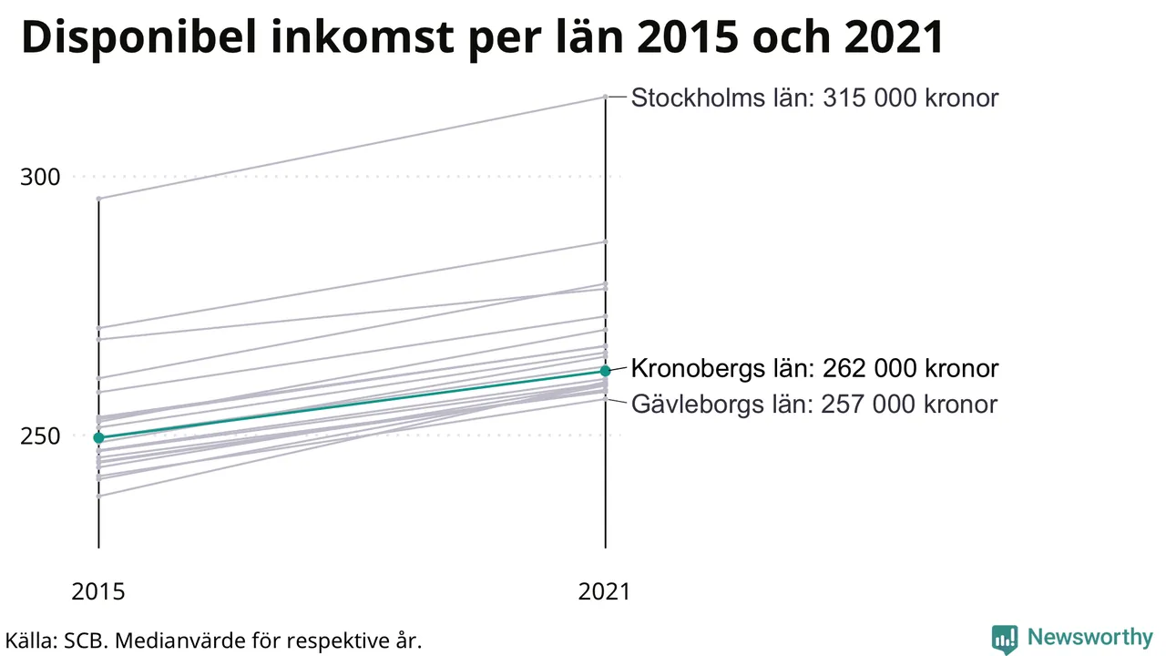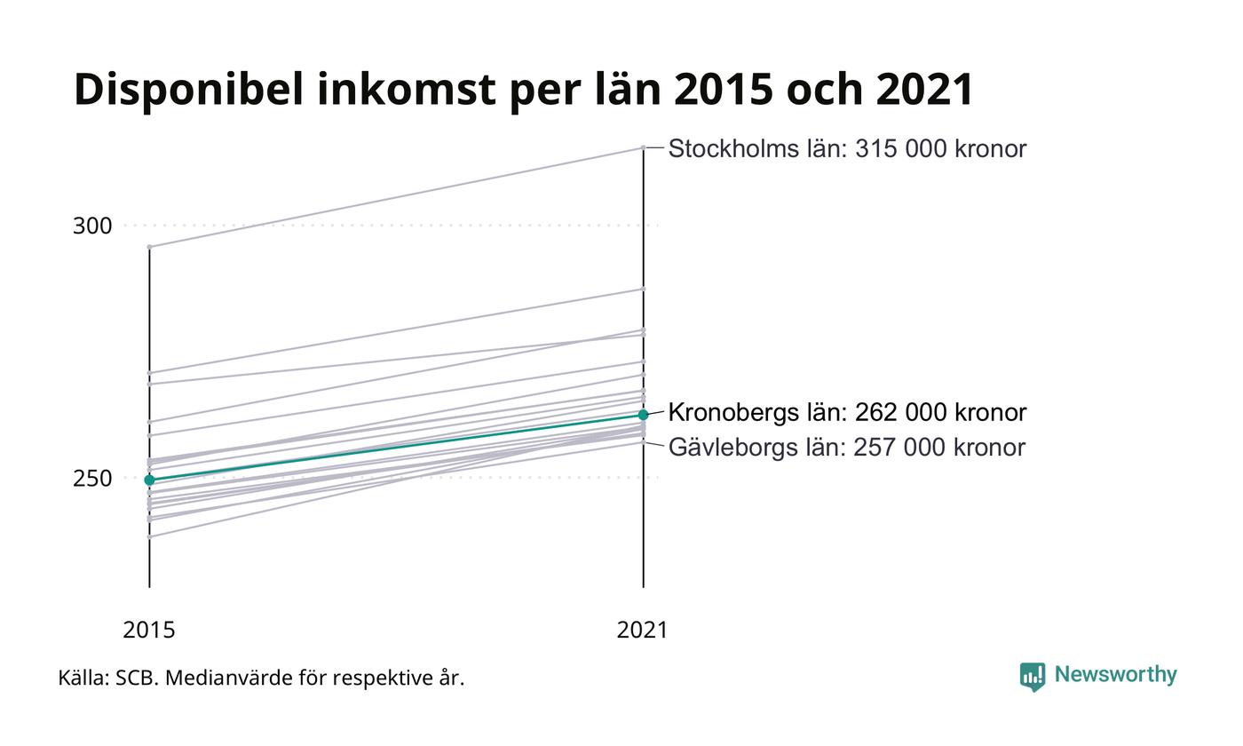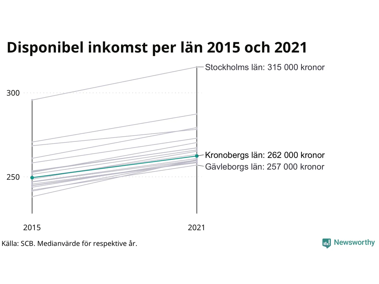 Skillnaden mellan områdena med högst och lägst inkomst har ökat i fem av åtta kommuner i Kronoberg. Länets högsta medianinkomst finns i området Söder-Bäckaslöv i Växjö. Där låg den på 334 000 kronor. Araby-Dalbo-Nydala, också i Växjö kommun, har länets lägsta disponibla inkomst, 163 000 kronor.