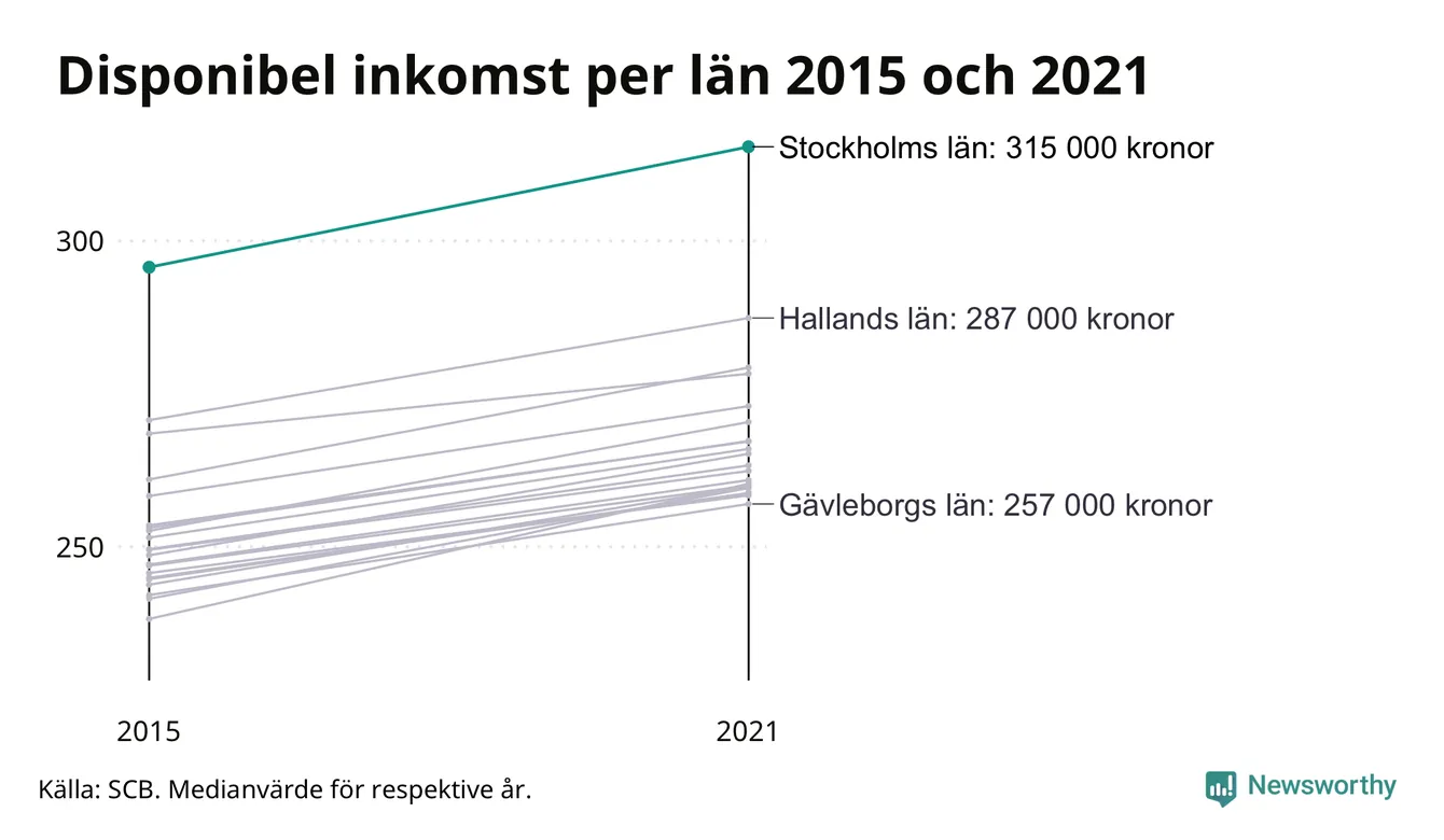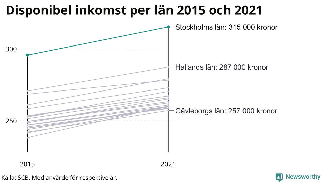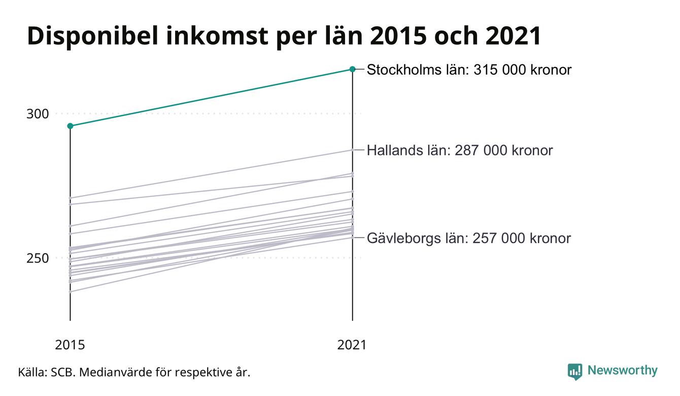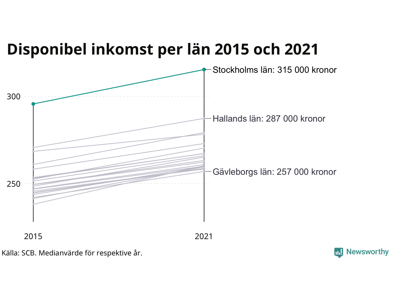 Medianinkomsten i Stockholms län som helhet var 315 000 kronor 2021, vilket är den högsta i landet. Sedan 2015 har den disponibla inkomsten i länet ökat med 7 procent.