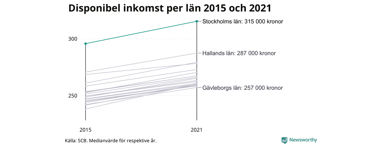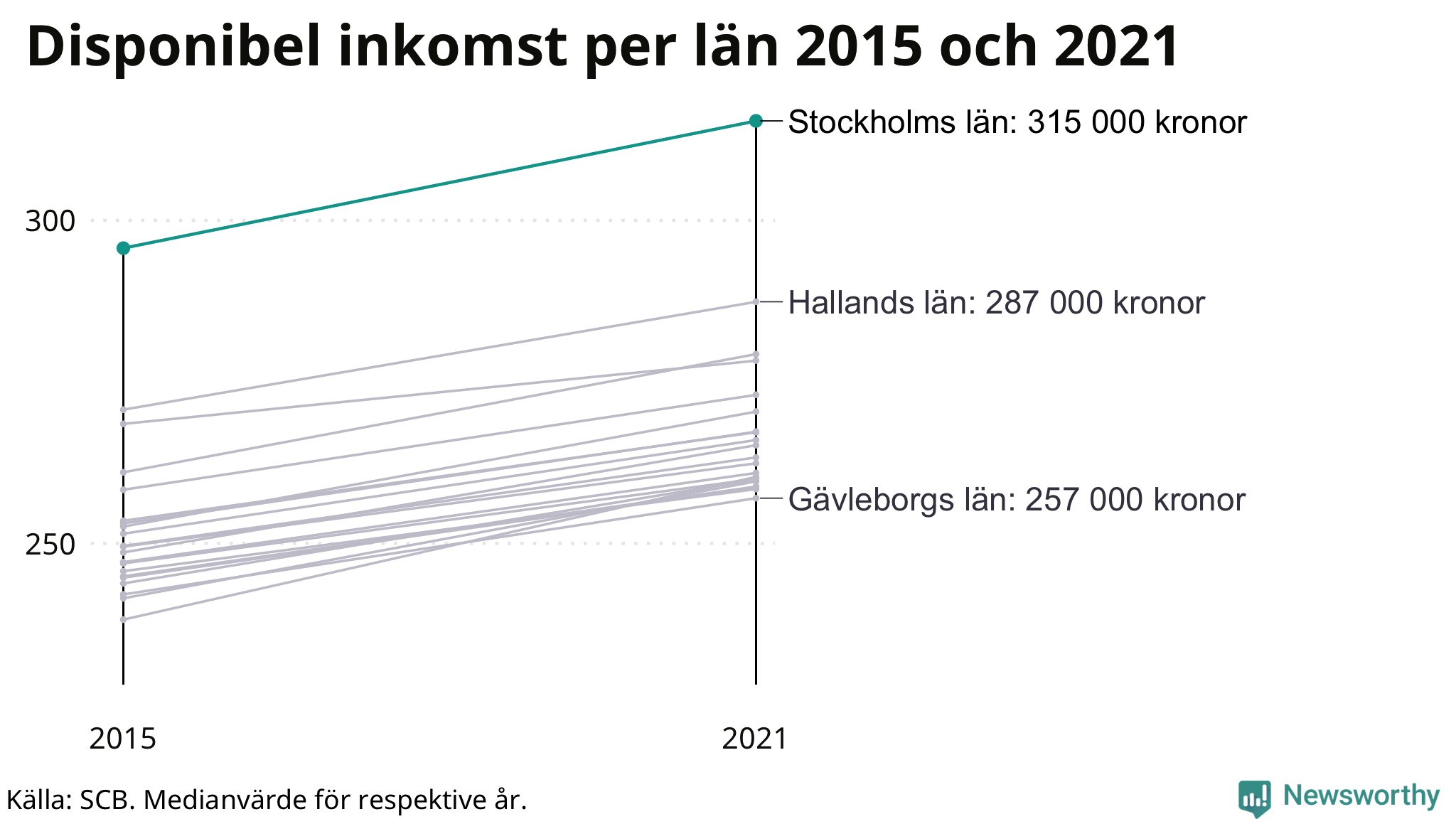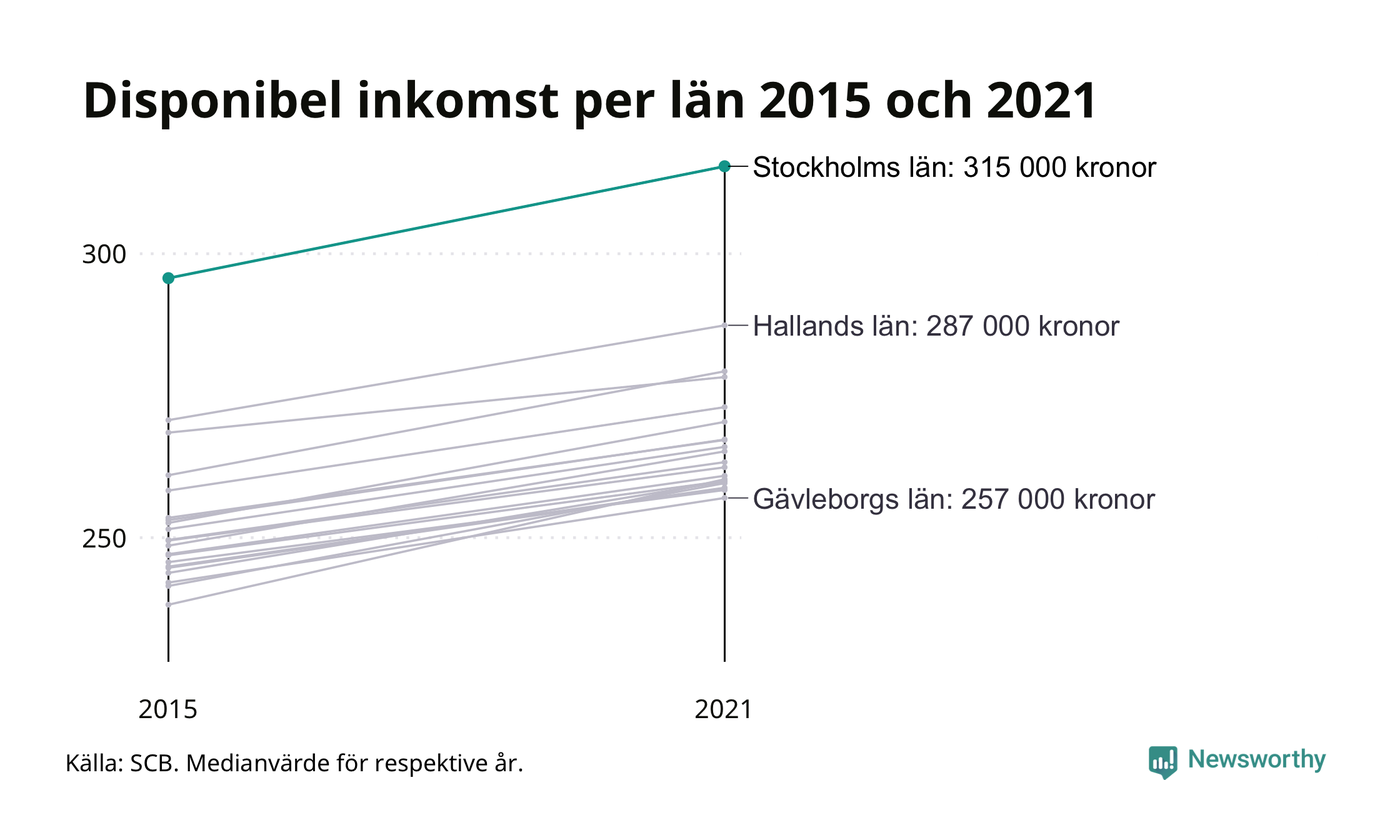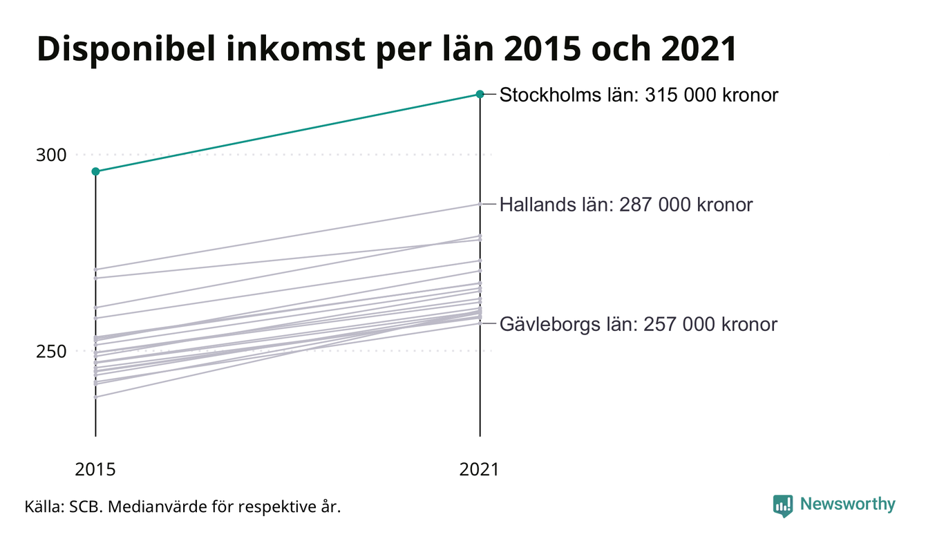 Medianinkomsten i Stockholms län som helhet var 315 000 kronor 2021, vilket är den högsta i landet. Sedan 2015 har den disponibla inkomsten i länet ökat med 7 procent.