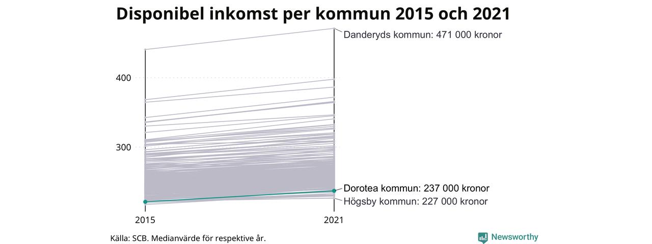 Medianinkomsten i Dorotea som helhet var 237 000 kronor 2021, vilket är lägre än de flesta andra kommuner. Sedan 2015 har den disponibla inkomsten i kommunen ökat med 7 procent.