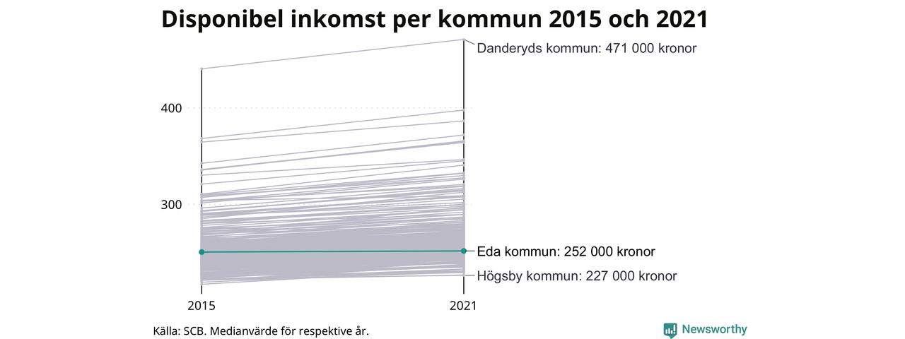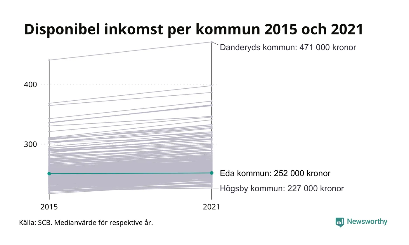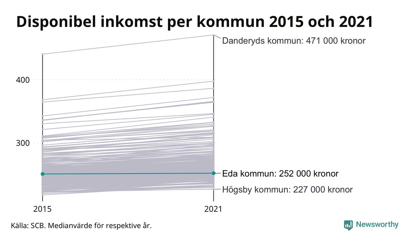 Medianinkomsten i Eda som helhet var 252 000 kronor 2021, vilket är lägre än de flesta andra kommuner. Sedan 2015 har den disponibla inkomsten i kommunen legat relativt oförändrad.