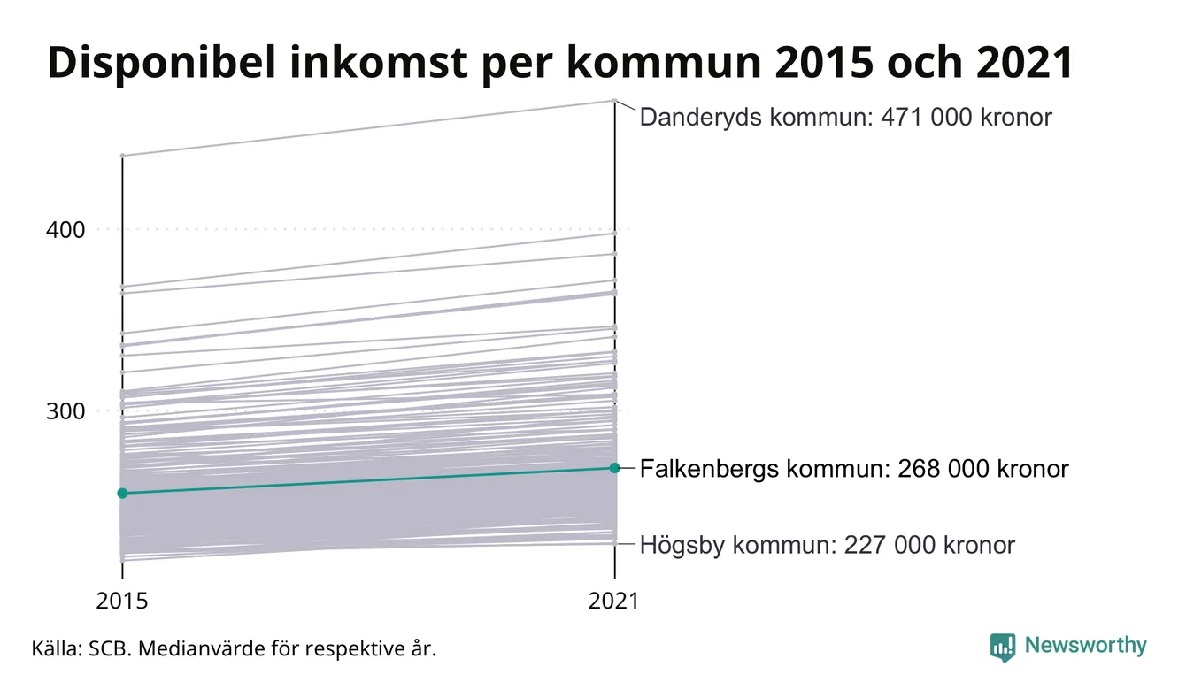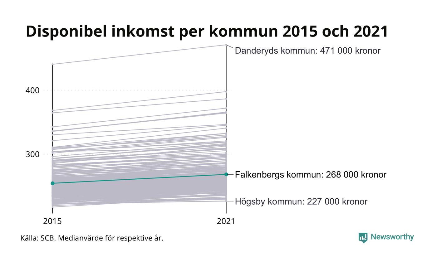 Medianinkomsten i Falkenberg som helhet var 268 000 kronor 2021, vilket är strax under rikssnittet. Sedan 2015 har den disponibla inkomsten i kommunen ökat med 5 procent.