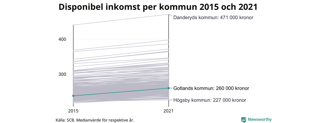 Medianinkomsten på Gotland som helhet var 260 000 kronor 2021, vilket är strax under rikssnittet. Sedan 2015 har den disponibla inkomsten i kommunen ökat med 9 procent.