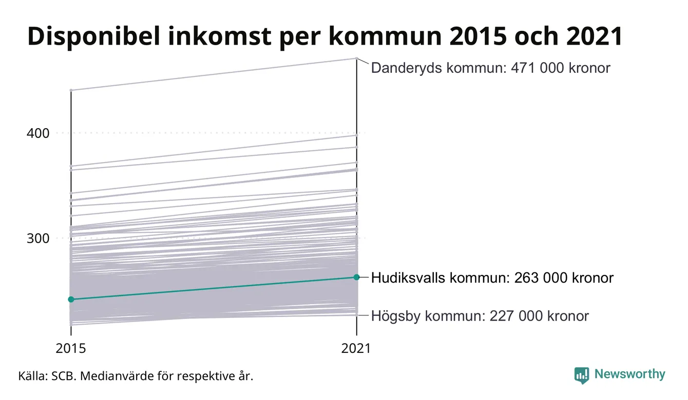 Medianinkomsten i Hudiksvall som helhet var 263 000 kronor 2021, vilket är den näst högsta i Gävleborgs län. Sedan 2015 har den disponibla inkomsten i kommunen ökat med 9 procent.