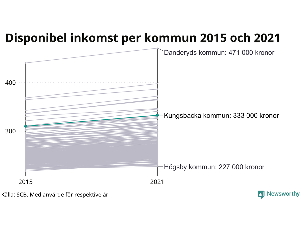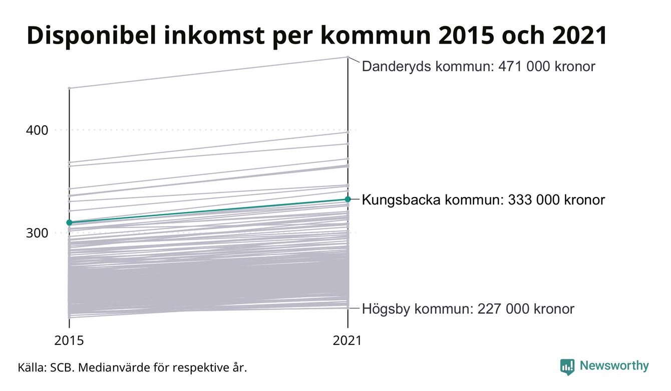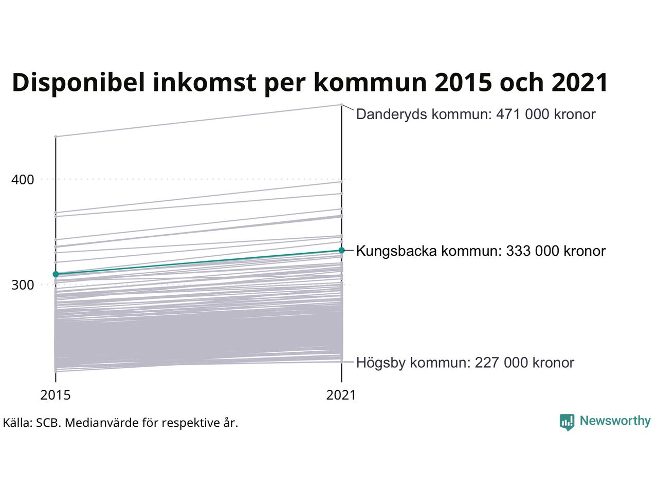 Medianinkomsten i Kungsbacka som helhet var 333 000 kronor 2021, vilket är den högsta i Hallands län. Sedan 2015 har den disponibla inkomsten i kommunen ökat med 7 procent.
