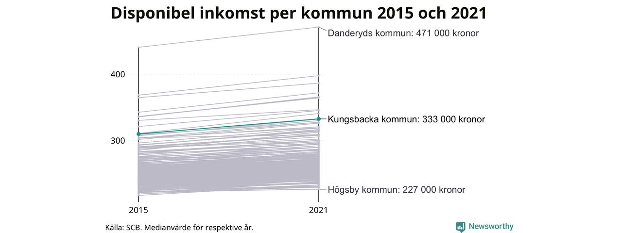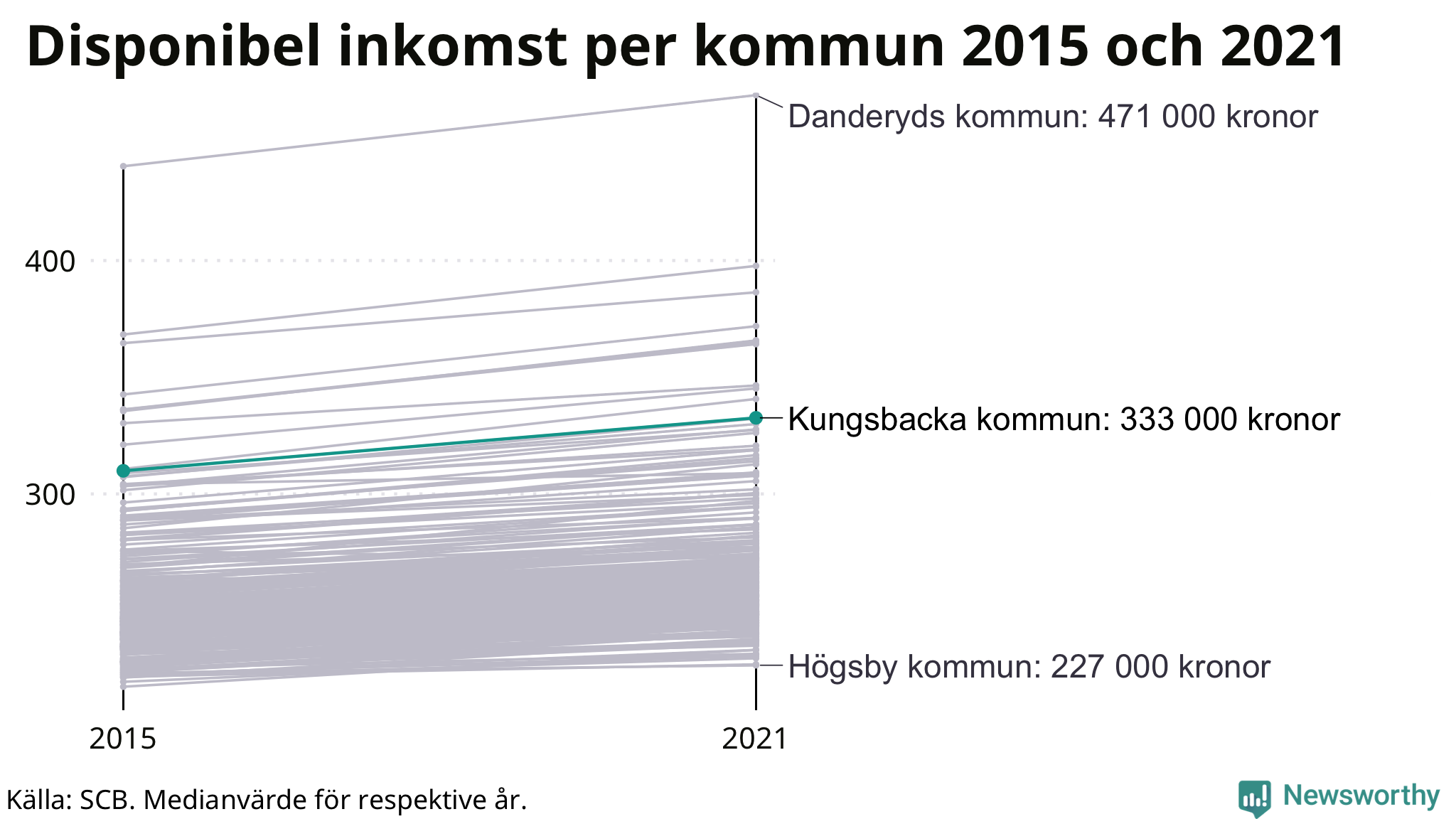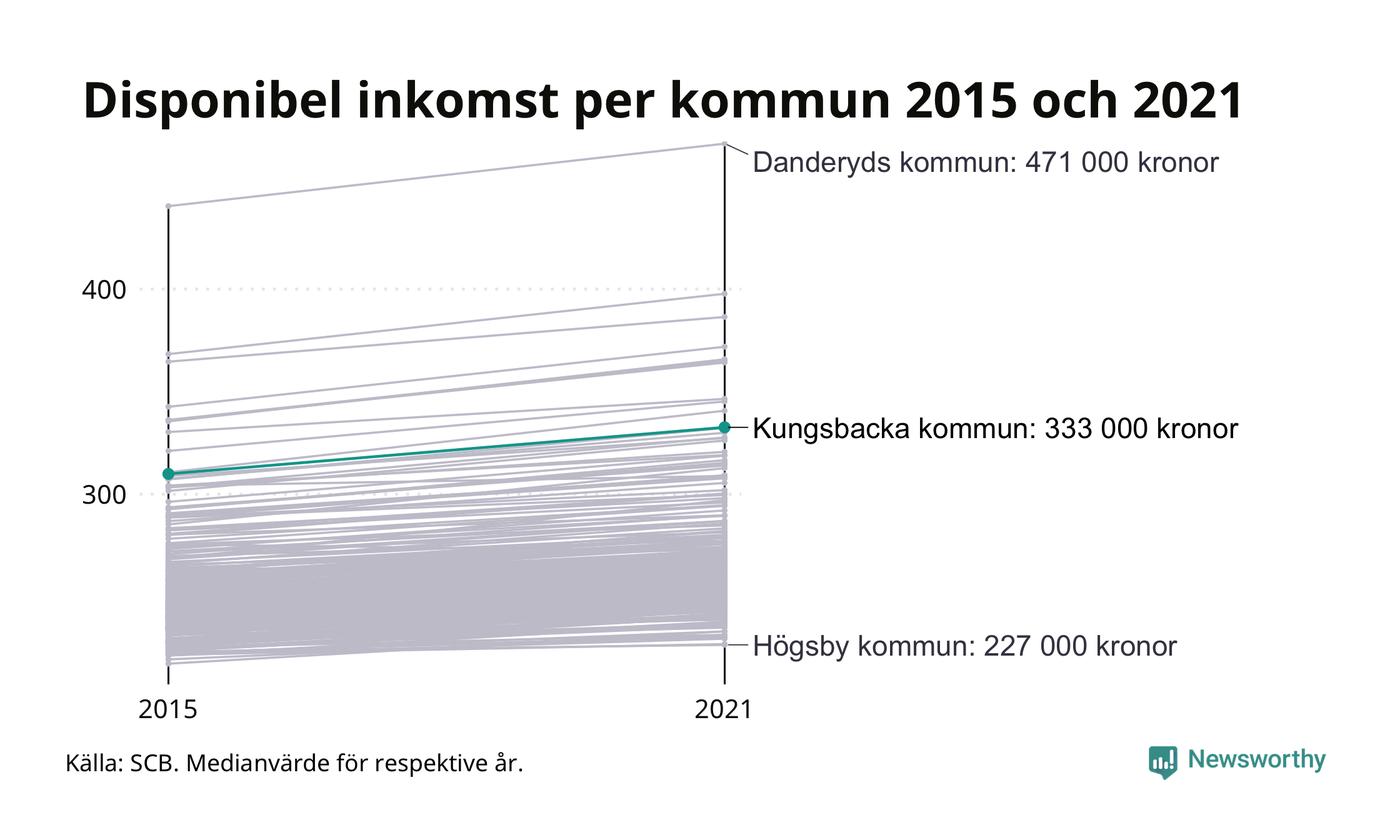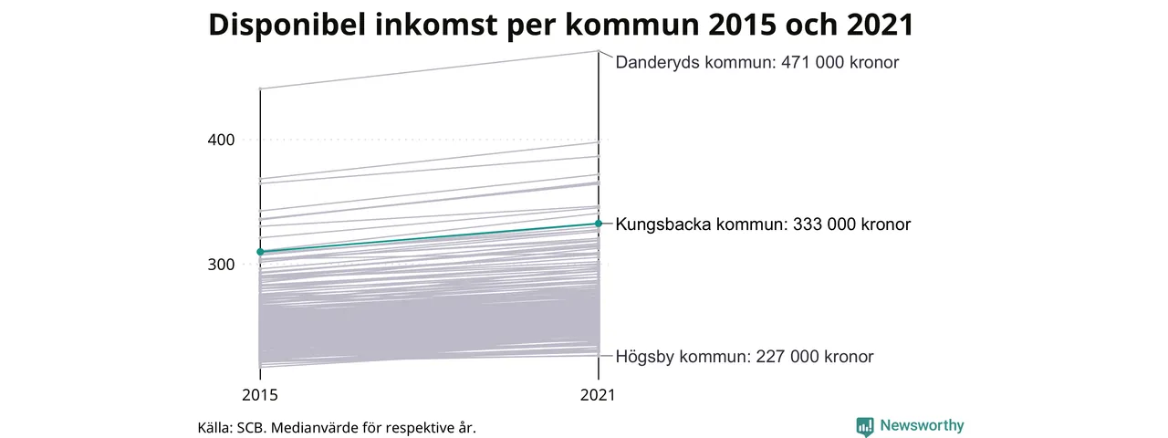 Medianinkomsten i Kungsbacka som helhet var 333 000 kronor 2021, vilket är den högsta i Hallands län. Sedan 2015 har den disponibla inkomsten i kommunen ökat med 7 procent.