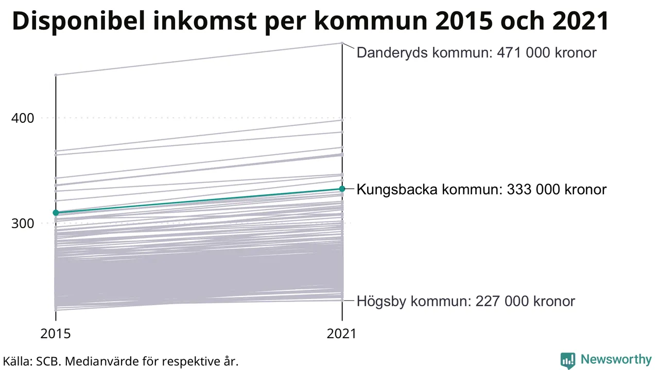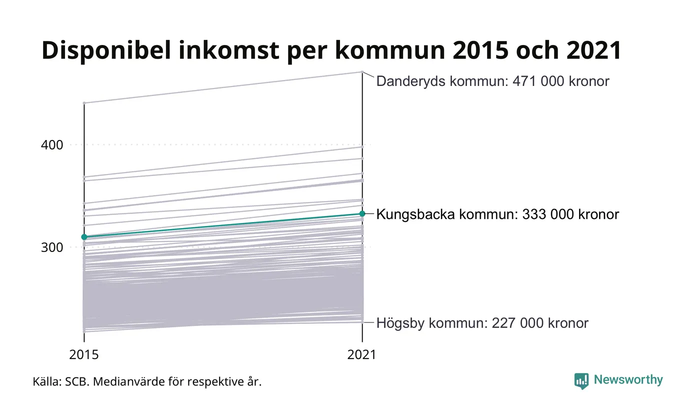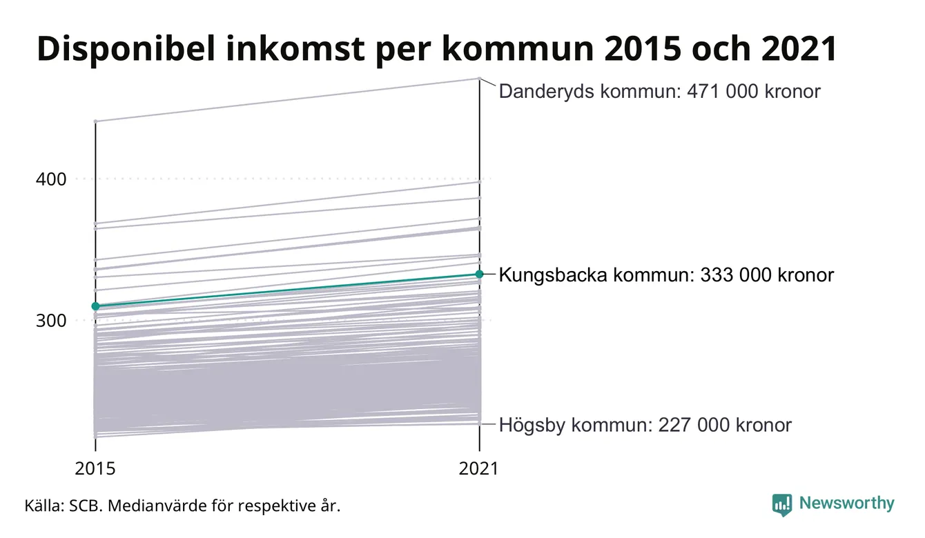 I Kungsbacka kommun var den disponibla inkomsten högst i Släp västra, 437 000 kronor 2021. Det kan jämföras med Tingberget, där medianinkomsten var 246 000 kronor. Skillnaden mellan området med högst respektive lägst inkomst har ökat över tid, precis som i riket i stort. 2015 skiljde drygt 160 000 kronor, 2021 var gapet omkring 190 000 kronor.