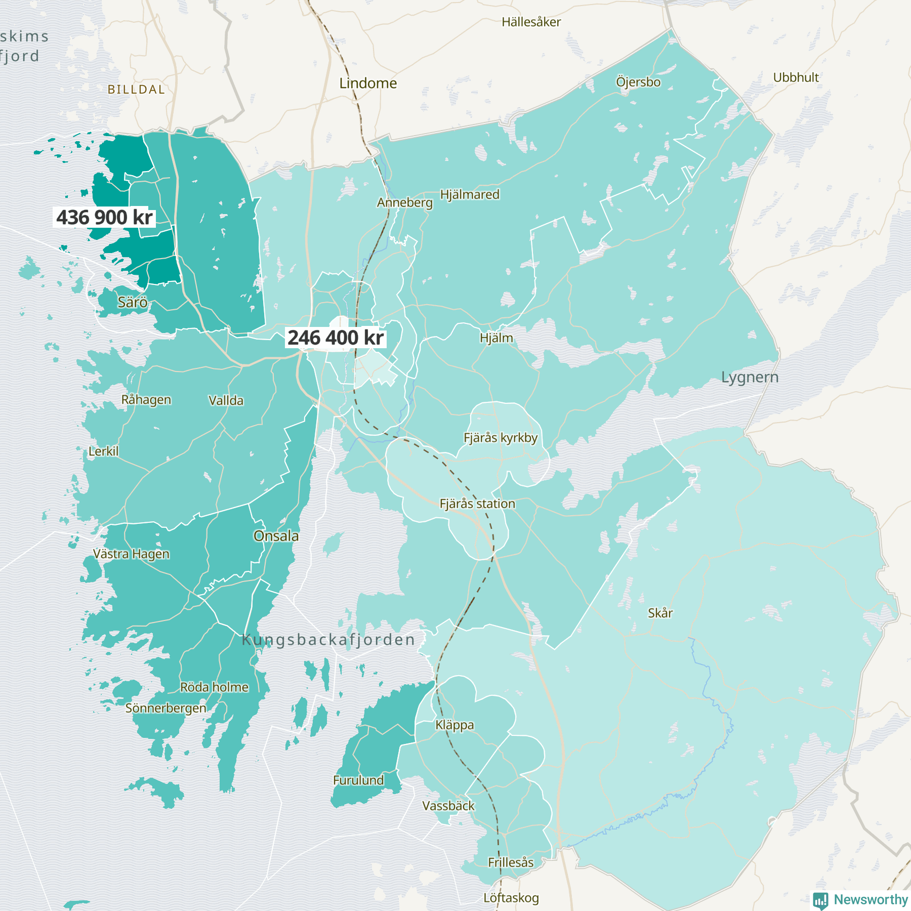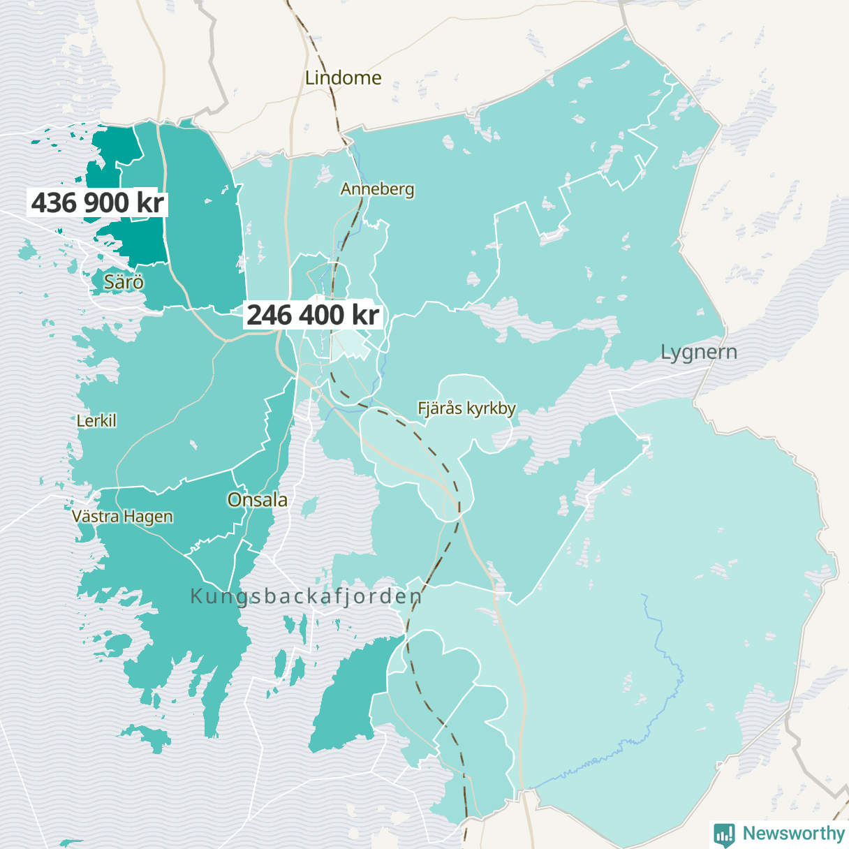 Skillnaden mellan områdena med högst och lägst inkomst har ökat i fyra av sex kommuner i Halland. Släp västra har inte bara högst inkomst i Kungsbacka utan även högst i hela länet. Andersberg, i Halmstads kommun, har länets lägsta disponibla inkomst, 166 000 kronor.