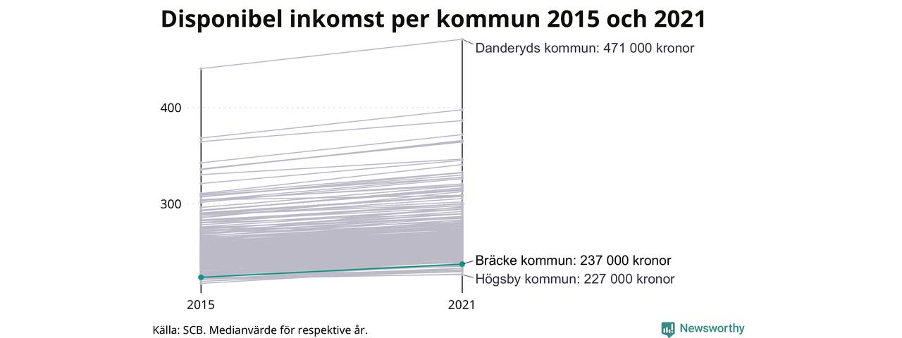 Medianinkomsten i Bräcke som helhet var 237 000 kronor 2021, vilket är den näst lägsta i Jämtlands län. Sedan 2015 har den disponibla inkomsten i kommunen ökat med 6 procent.